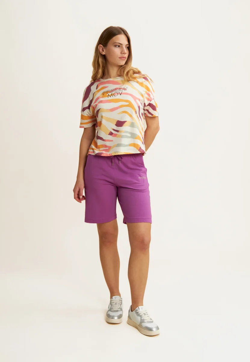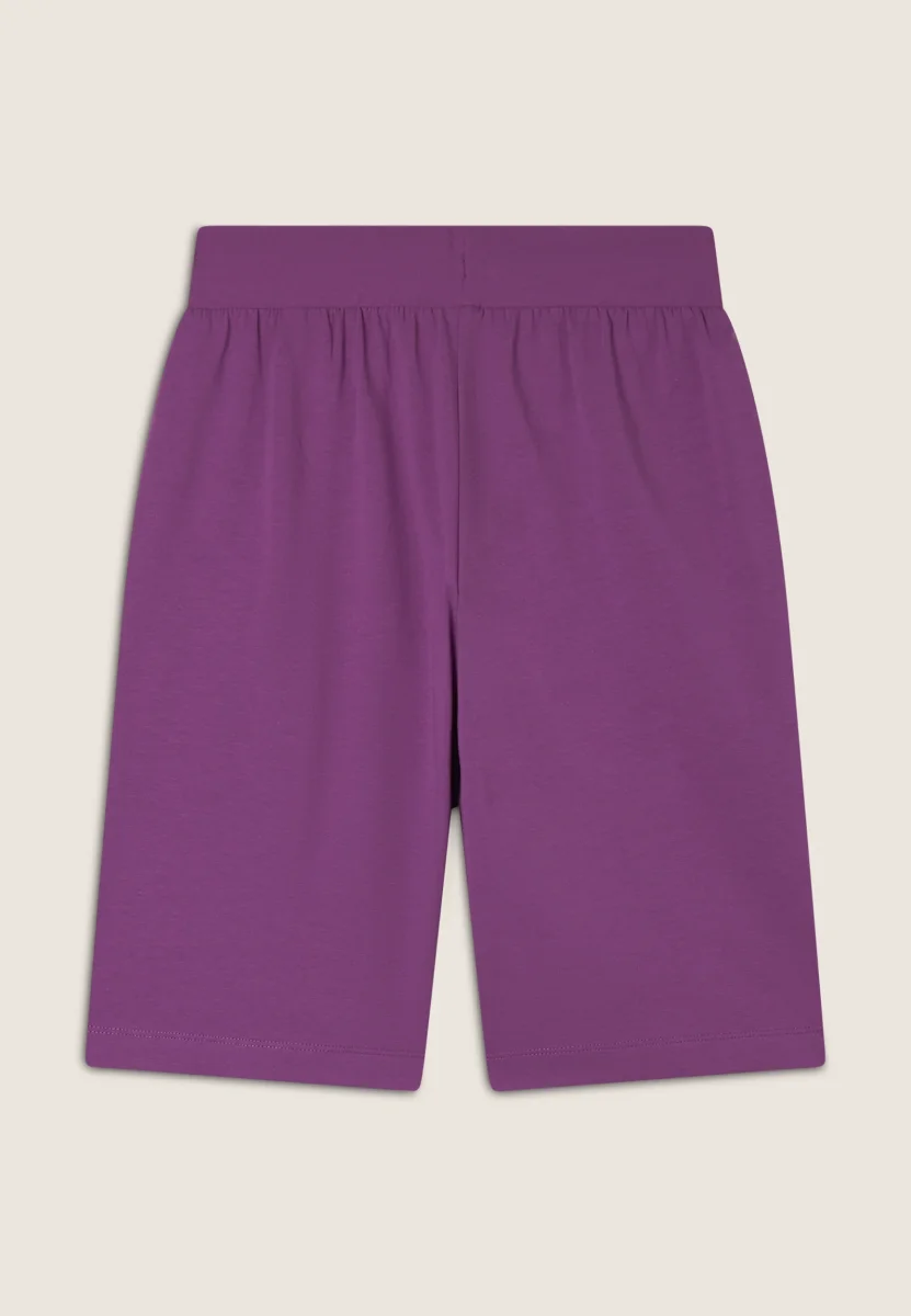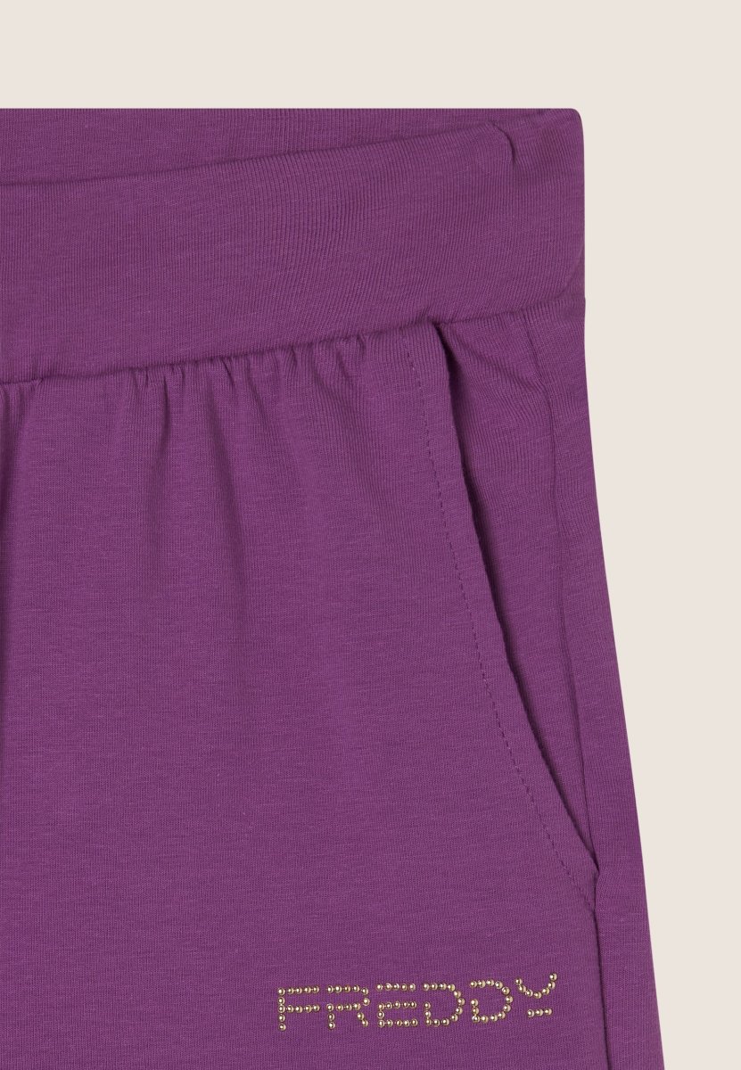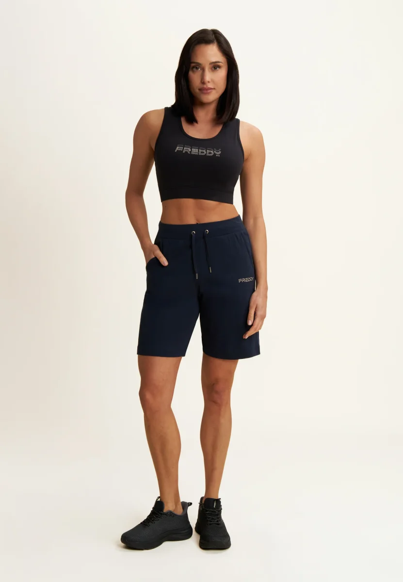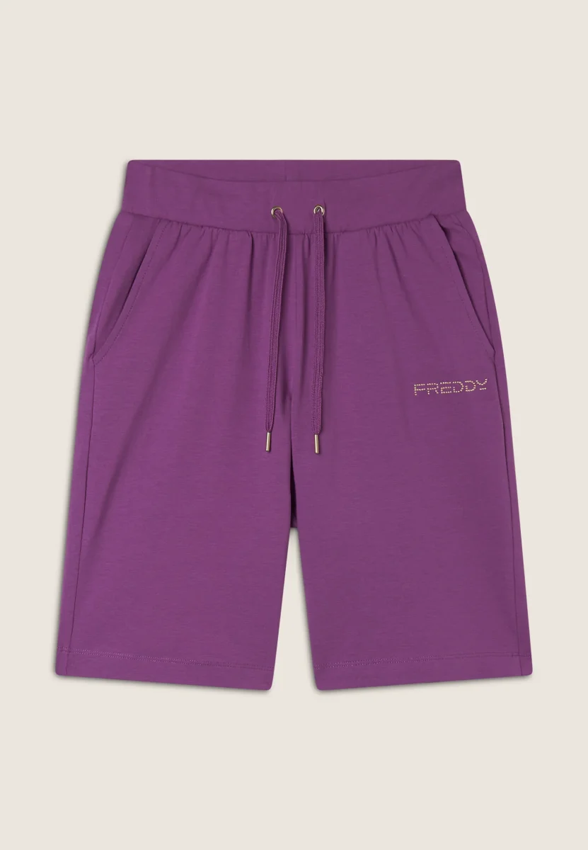 Pantaloni corti in Heavy Jersey Stretch con lunghezza bermuda e vita regolabile con coulisse tono su tono. Dotati di tasche anteriori interne e logo FREDDY decorato da perline dorate, un capo versatile per il tempo libero.
