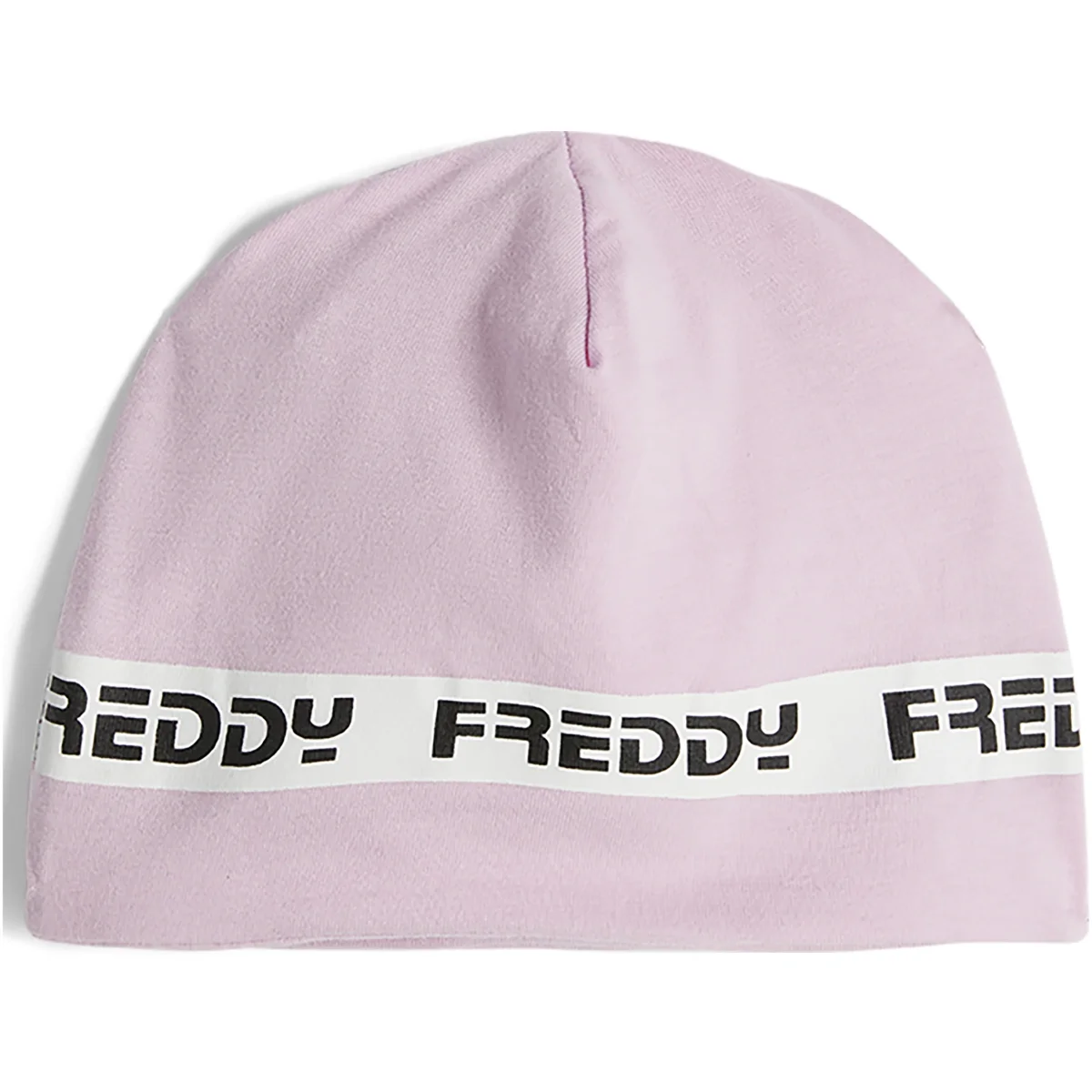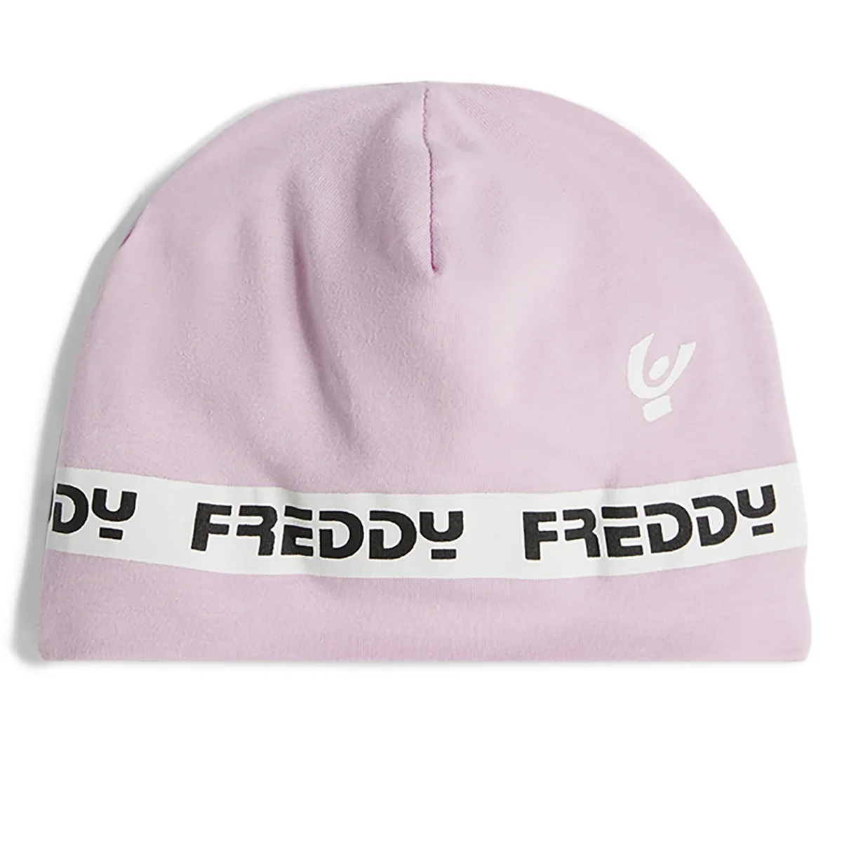 Berretto a cuffia da bambina in cotone elasticizzato. Il modello è completato da un piccolo logo e dalla banda bianca decorata dal logo in nero a contrasto.