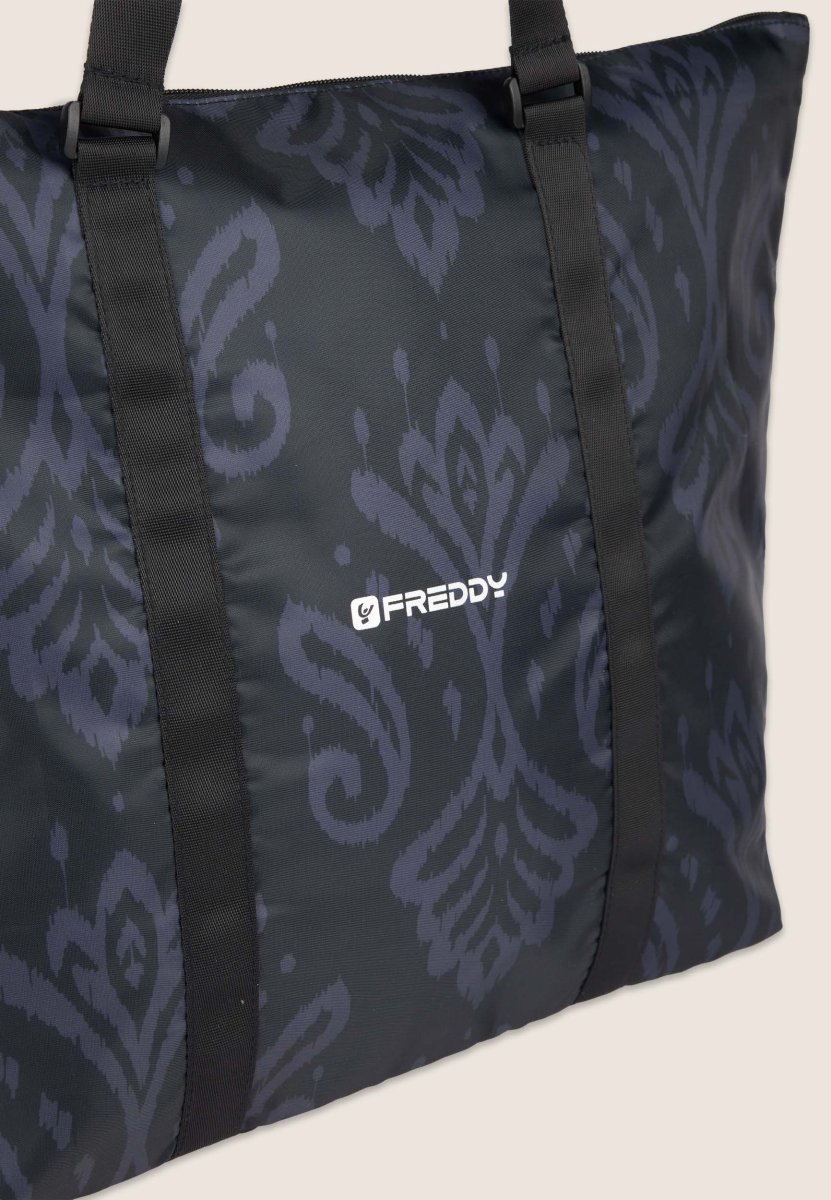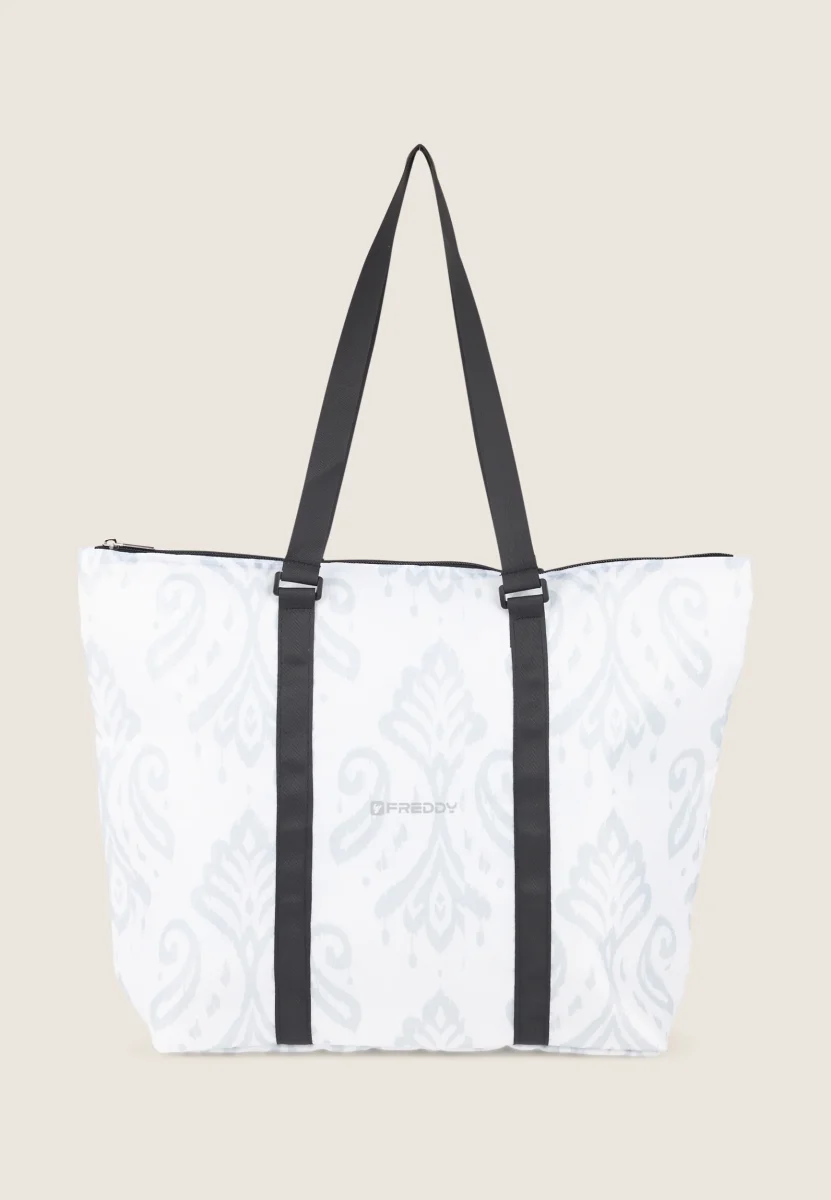 Femminile e versatile, questa shopper a fantasia floreale stilizzata è l’accessorio perfetto per dare un tocco di freschezza al tuo look. Dotata di doppio manico, è ideale sia per il trasporto a spalla che a mano, adattandosi con praticità alle tue esigenze. La chiusura a zip assicura il massimo della funzionalità, mentre il logo FREDDY sul lato esterno aggiunge un dettaglio moderno e distintivo. Perfetta per chi ama unire stile e praticità.