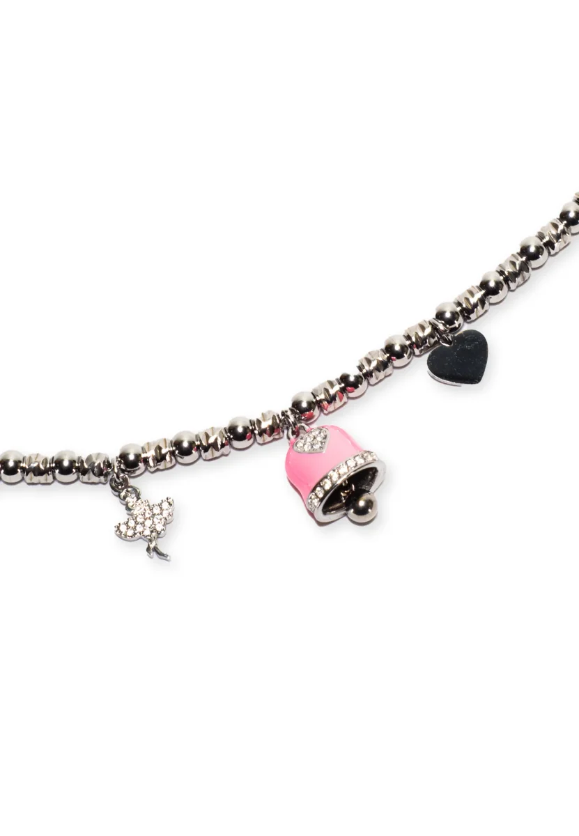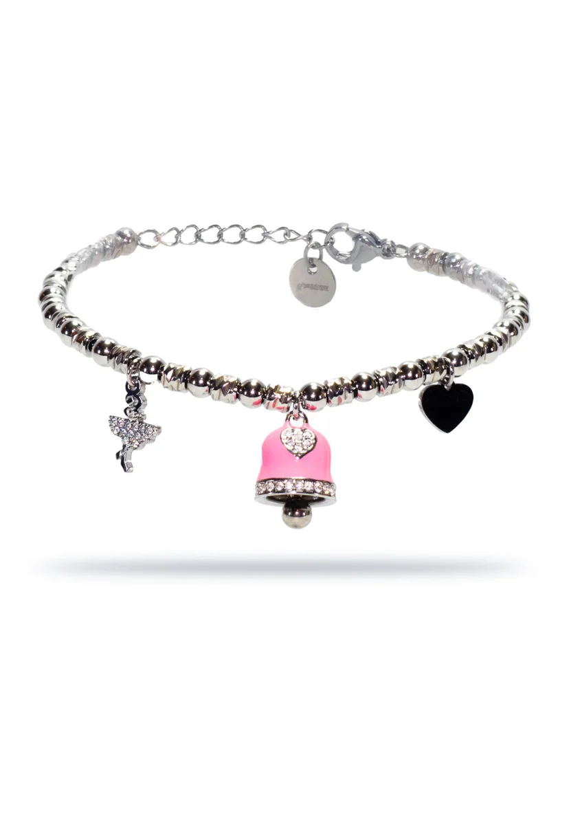 Porta un tocco di allegria e femminilità ai tuoi look con questo bracciale charm. La catena alterna sfere lisce ed elementi sfaccettati per un effetto luminoso e vivace, arricchita da tre ciondoli: una campanella smaltata rosa impreziosita da strass, un angelo scintillante e un cuore minimal. Realizzato in acciaio silver 316L ipoallergenico, è completato da una chiusura a moschettone e catenella regolabile. Un accessorio perfetto per esprimere il proprio stile con leggerezza e originalità.