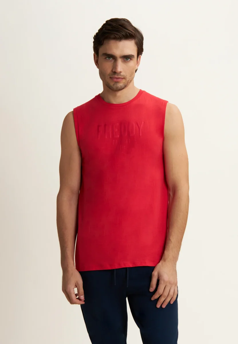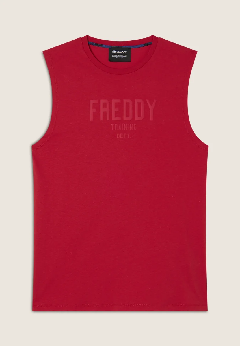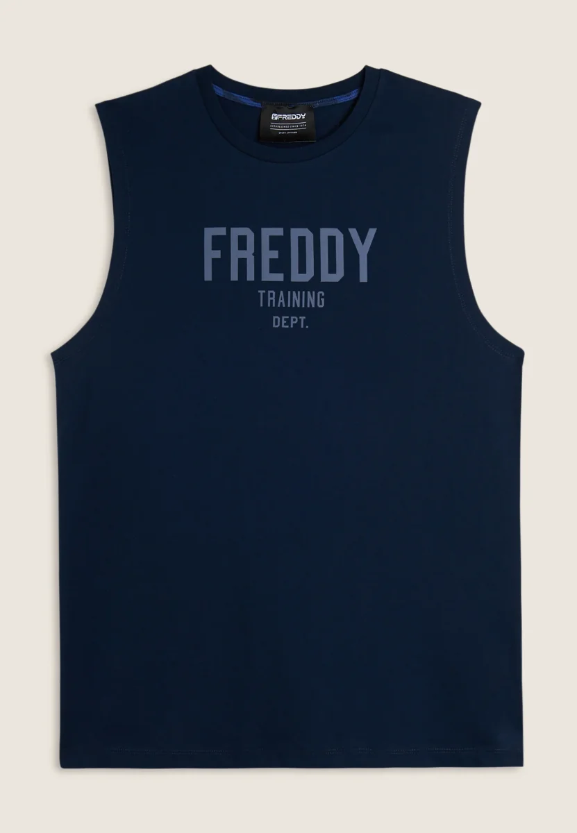 Canotta regular fit in jersey 100% cotone, dal taglio essenziale con scollo girocollo e senza maniche. Fondo dritto e lunghezza regular completano il design. Grande stampa FREDDY TRAINING DEPT in tono colore sul fronte, perfetta per un look sportivo.