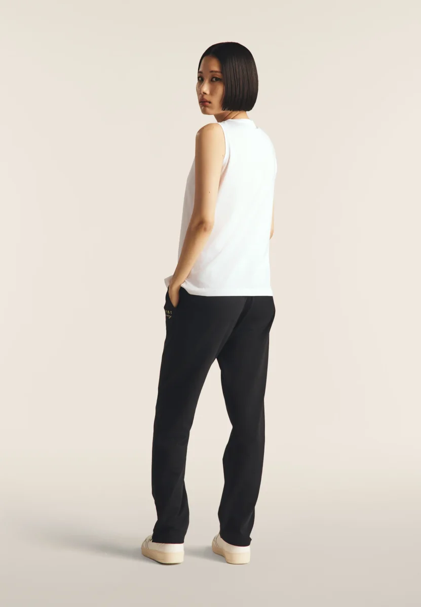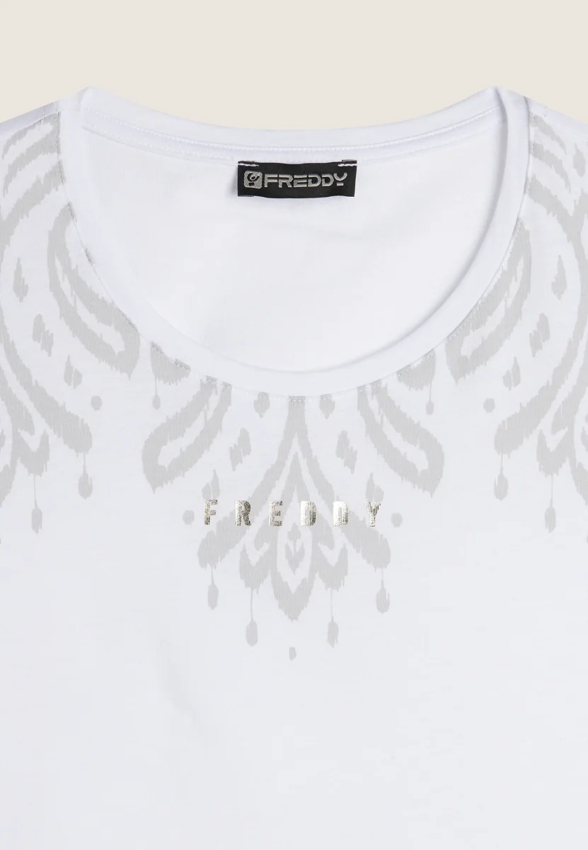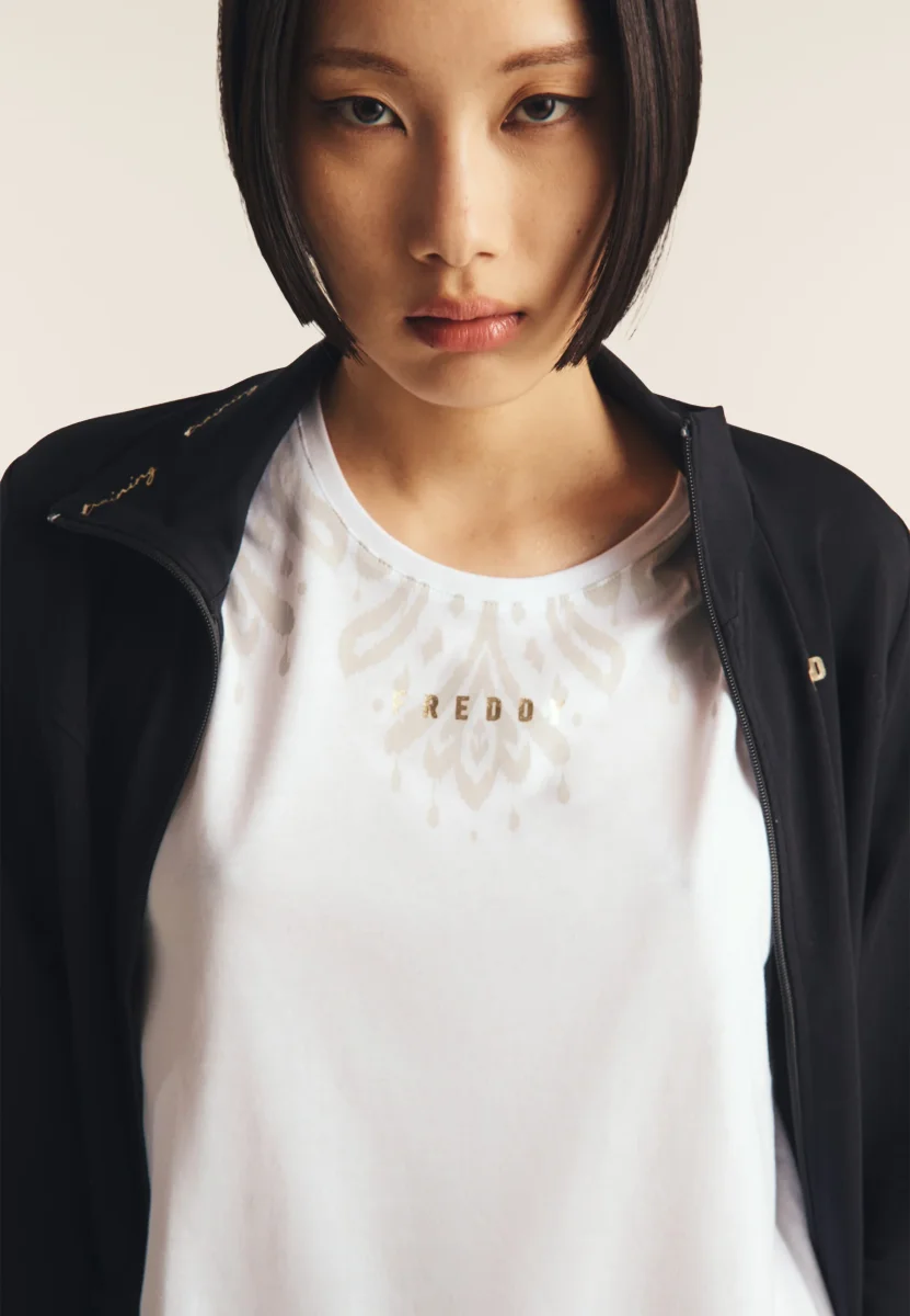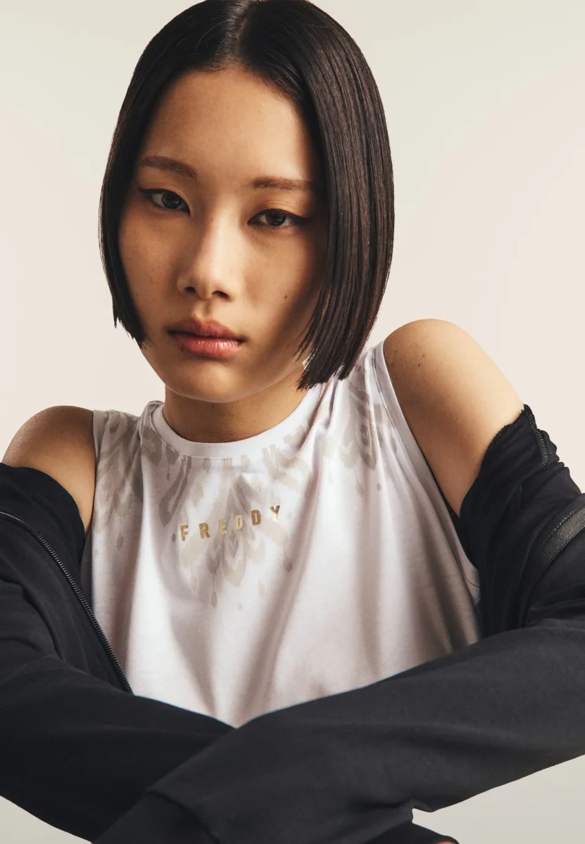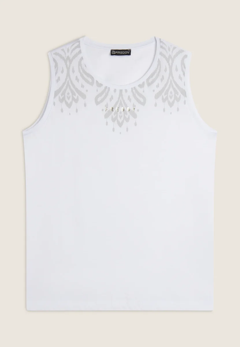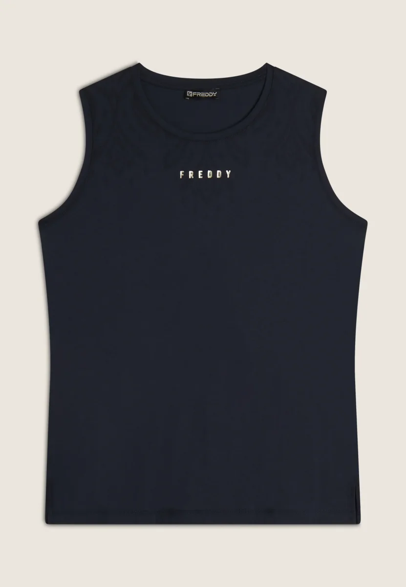 Canotta regular fit in jersey leggero con fondo dritto e spacchi laterali. Decorata sulle spalle anteriori con una delicata stampa floreale in tono colore e il logo FREDDY stampato in oro chiaro sotto lo scollo. Ideale per un look sportivo e femminile.