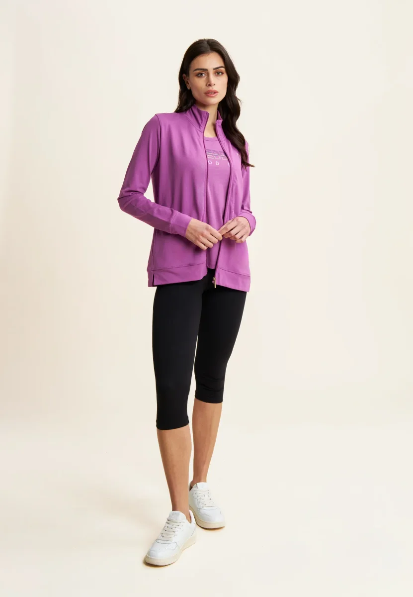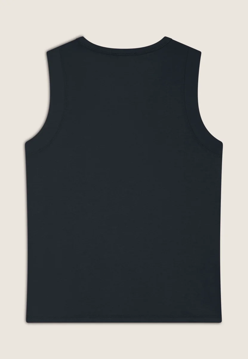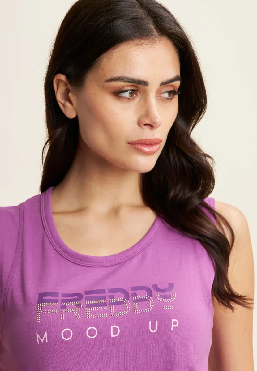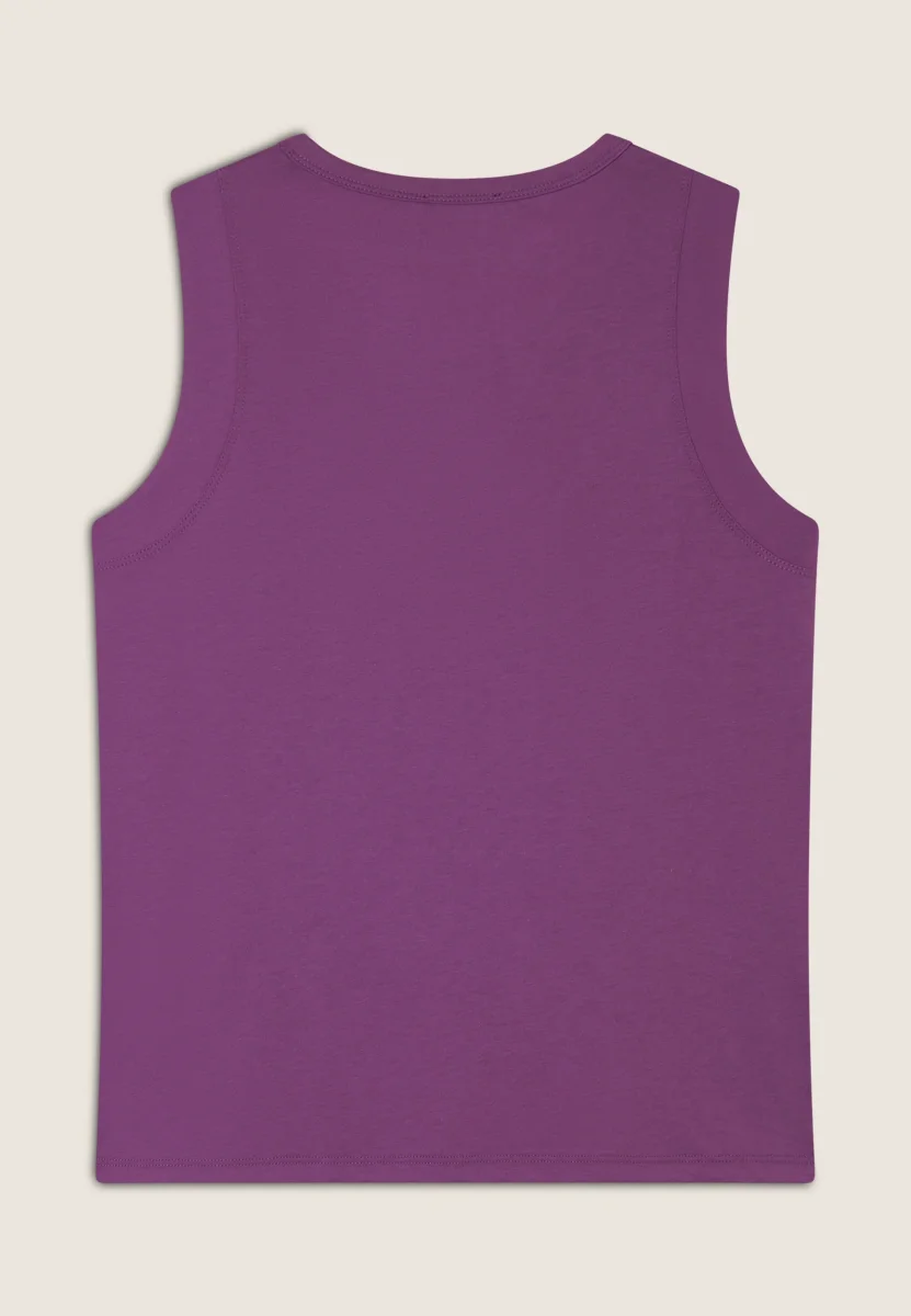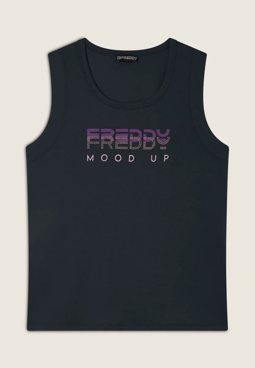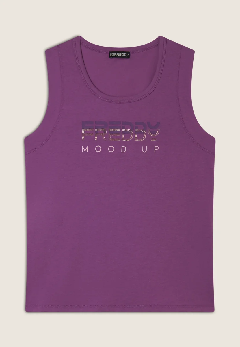 Canotta in jersey leggero con scollo tondo e spalline regolari. La grafica bicolore sul fronte, decorata da perline dorate, aggiunge un tocco di stile a questo capo essenziale perfetto per lo sport o il tempo libero.
