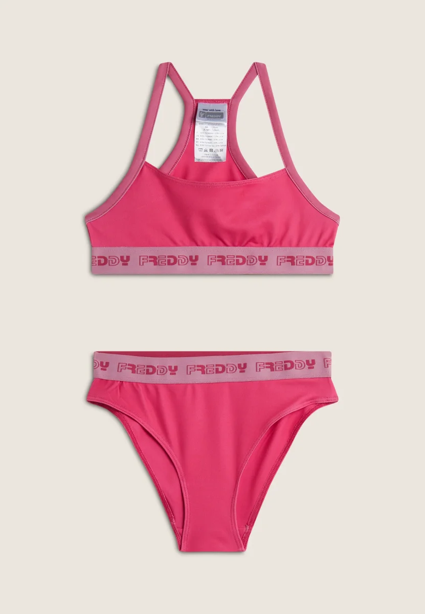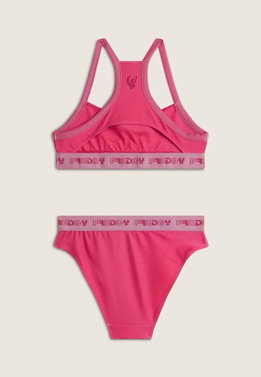 Questo costume due pezzi da bambina combina praticità e design moderno. Il top presenta spalline sottili con un retro a vogatore e un elastico jacquard logato e in tono colore sul fondo per una vestibilità sicura. Un dettaglio cut-out e un logo in strass decorano il retro, aggiungendo un tocco di originalità. Lo slip, abbinato, è dotato di un elastico jacquard in vita per un comfort ottimale.