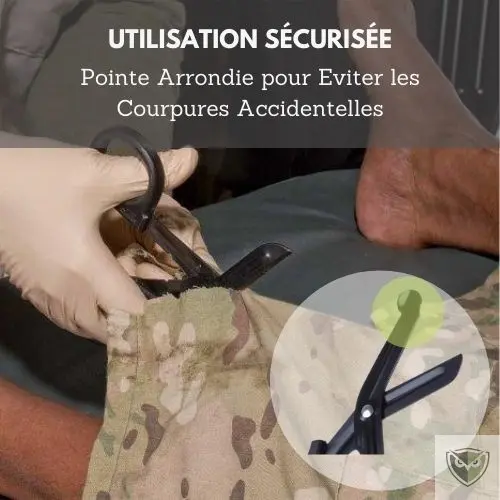 L’extrémité des ciseaux est dotee d’une pointe arrondie pour éviter toute blessure lors de la coupe des vêtements près de la peau. Cette Paire de ciseaux n’est pas adaptée aux procédures chirurgicales ou invasives.