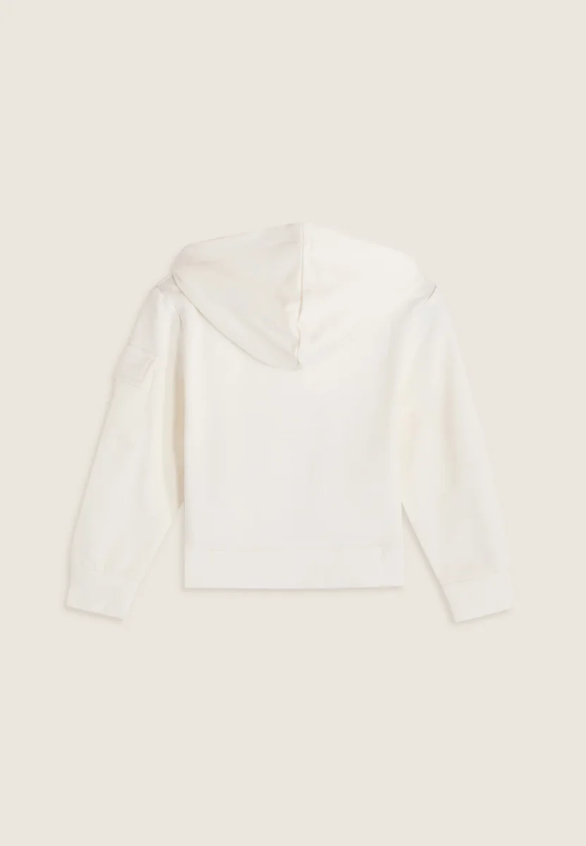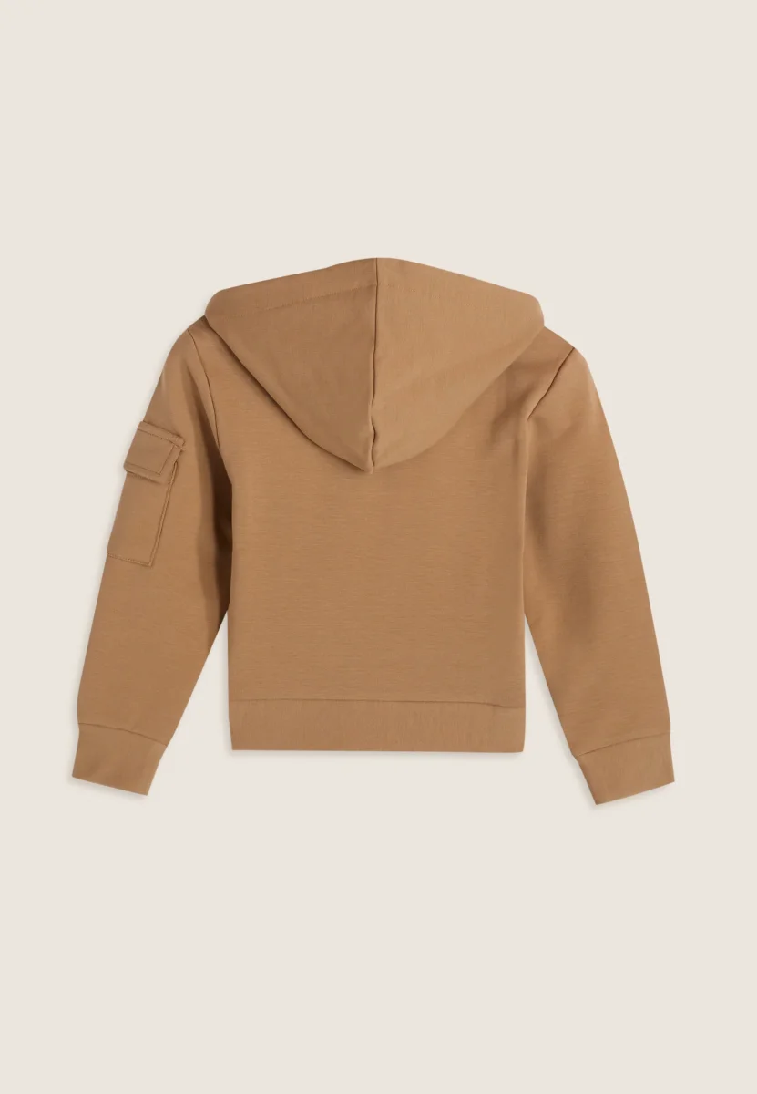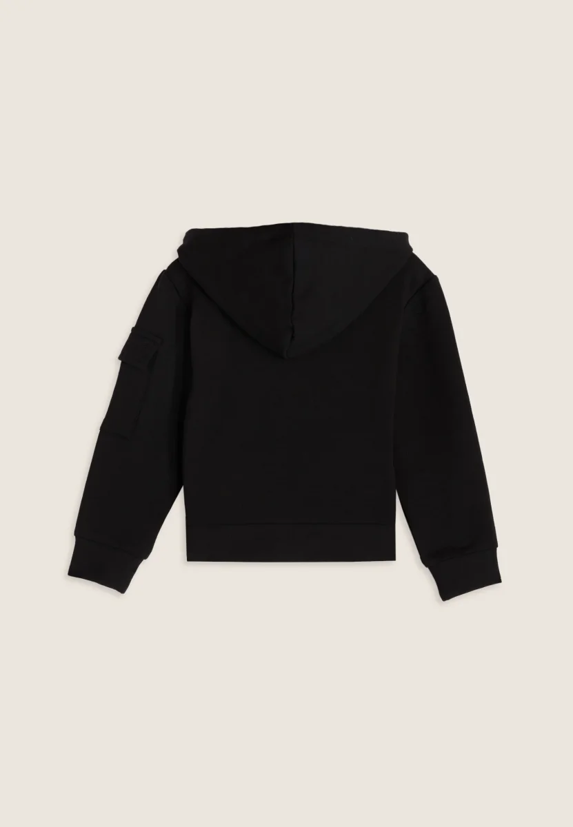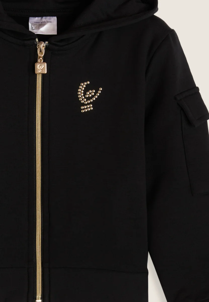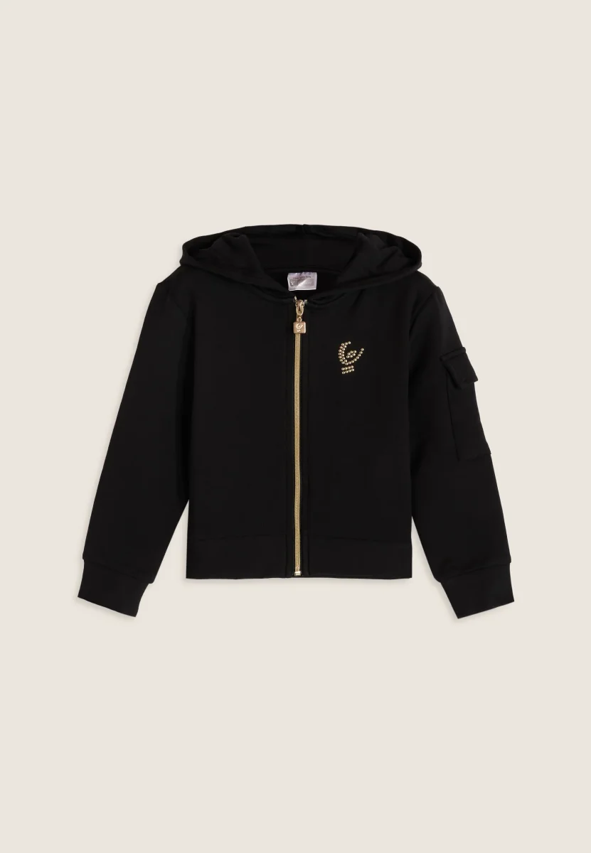 Felpa da bambina con zip e cappuccio, pensata per unire praticità e stile. Realizzata con maniche lunghe, polsini in costina e fascia sul fondo per una vestibilità confortevole. È arricchita da una tasca applicata sulla manica sinistra, utile e originale. I dettagli dorati della zip e gli strass che compongono il logo sul cuore aggiungono un tocco distintivo e luminoso. Un capo versatile e curato, ideale per completare outfit casual con personalità.