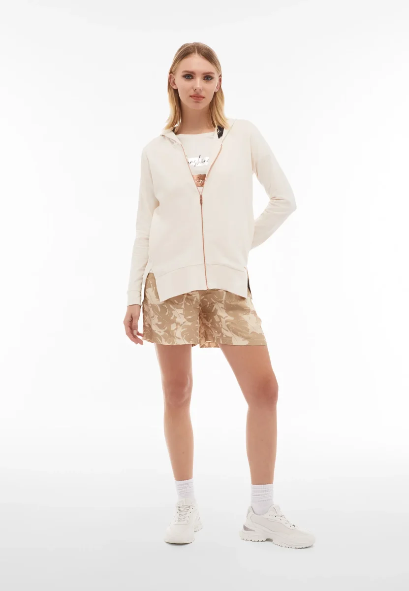 Questa felpa da donna è perfetta in ogni momento della giornata, dal lavoro al tempo libero, perché riesce a coniugare una vestibilità originale data dal fondo con aperture laterali e cuciture oblique allo stile elegante e raffinato dei dettagli a tema tropicale e degli accessori in color oro. È stata realizzata in tessuto jersey per assecondare ogni tuo movimento con naturalezza.