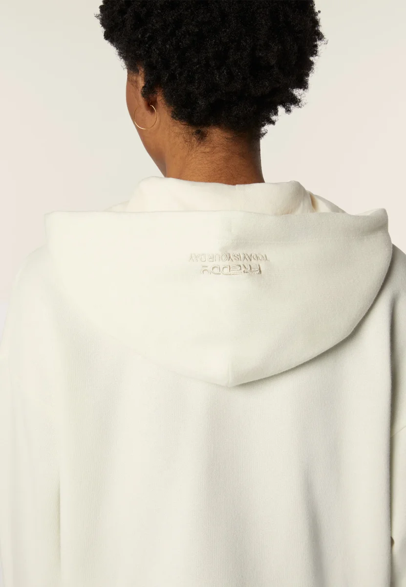 Felpa da donna con cappuccio e zip ha un’originale vestibilità oversize corta in vita. Realizzata in felpa di poliestere per garantire morbidezza, resistenza e calore ottimale, è dotata di comode tasche a marsupio. Il design include un pratico cappuccio doppiato in jerey regolabile con coulisse, fondo e polsini in costina. Una piccola scritta ricamata sul cappuccio aggiunge un tocco di stile unico. Ideale per un look casual e sportivo, perfetta per ogni occasione.