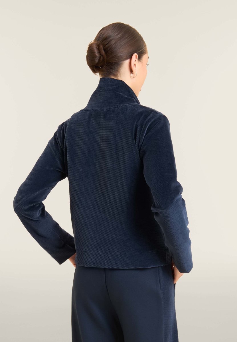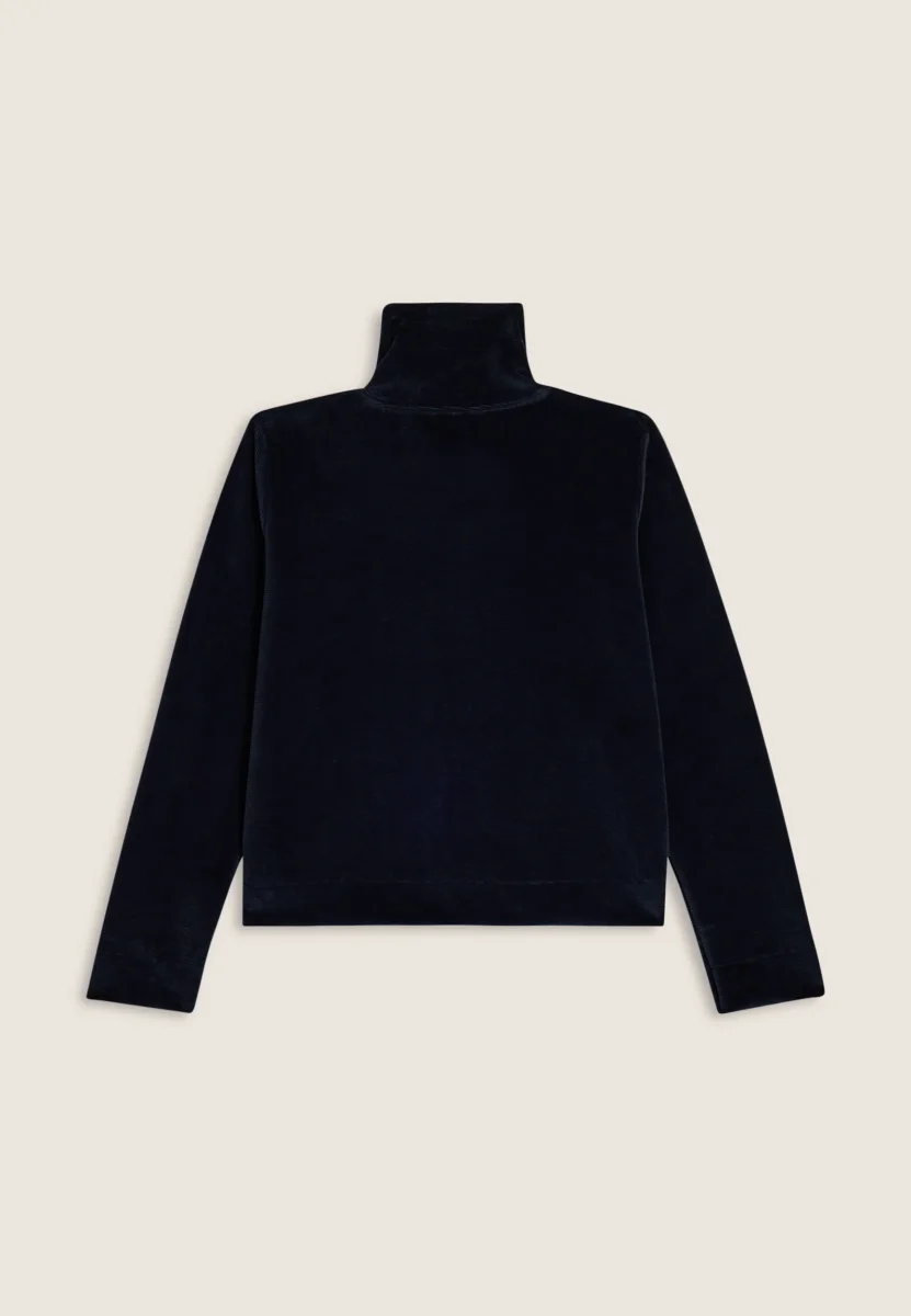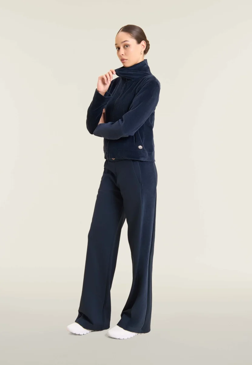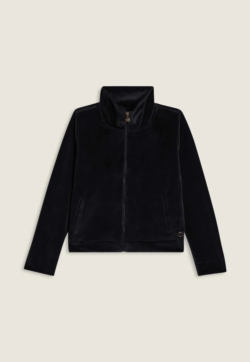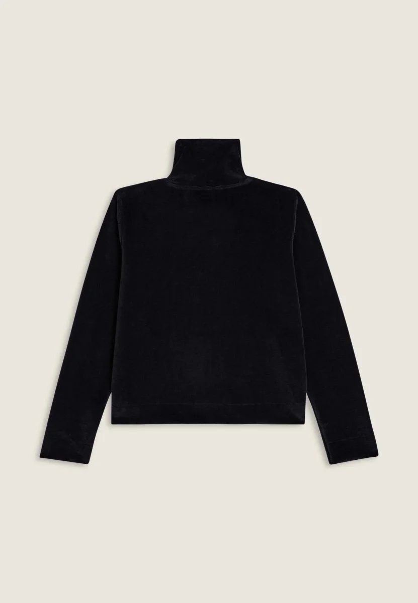 Felpa corta in ciniglia a righe sottili, con vestibilità cropped e zip frontale. Collo alto e maniche lunghe con polsini per una protezione morbida e avvolgente. Il dettaglio della fascia sul fondo valorizza la silhouette. Dotata di tasche interne a filetto. Logo FY sul fondo sinistro.