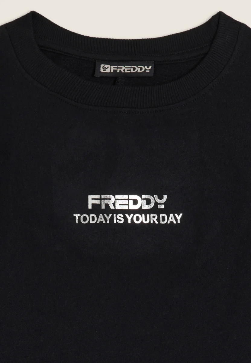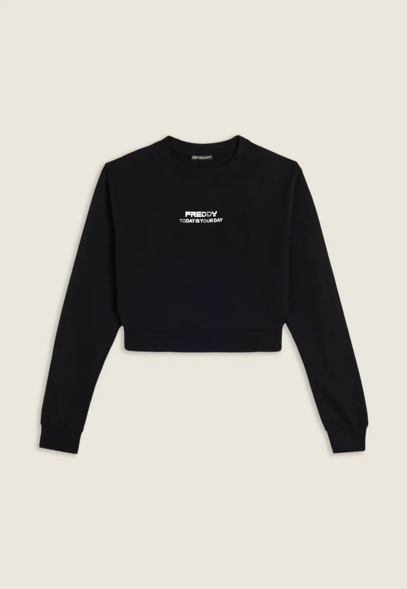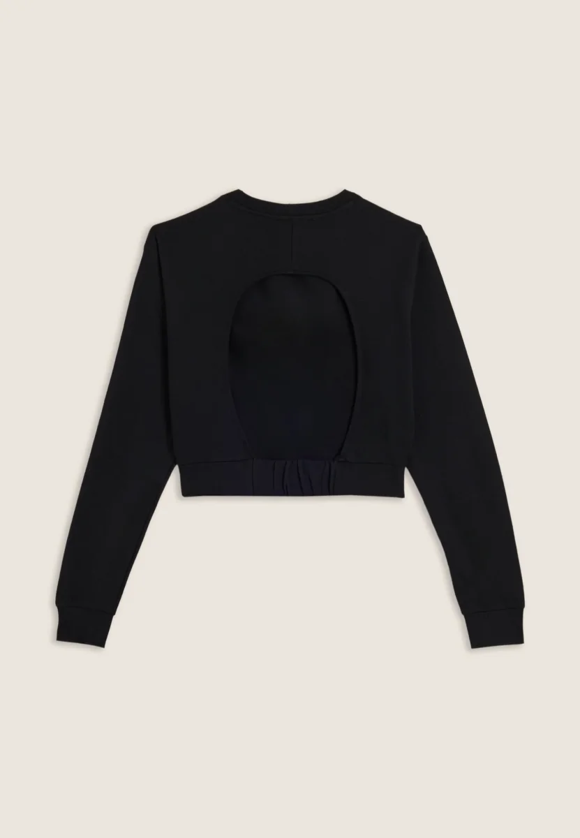 Porta una ventata di stile nel tuo guardaroba con questa felpa in French Terry. Il design cropped con fascia elastica sul fondo posteriore e scollo girocollo ampio in costina si abbina a una vestibilità regular fit per un comfort ottimale. Il dettaglio cut out sulla schiena e la grafica con logo sul fronte rendono questo capo unico e trendy.