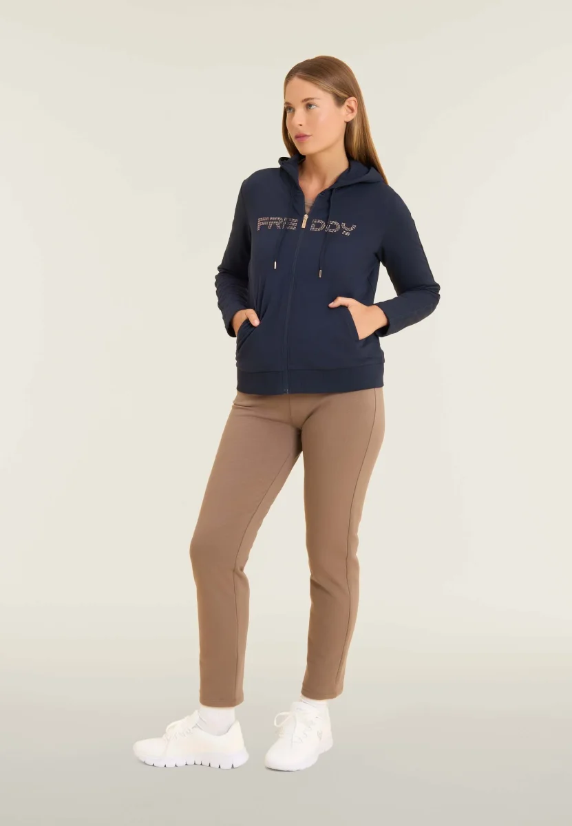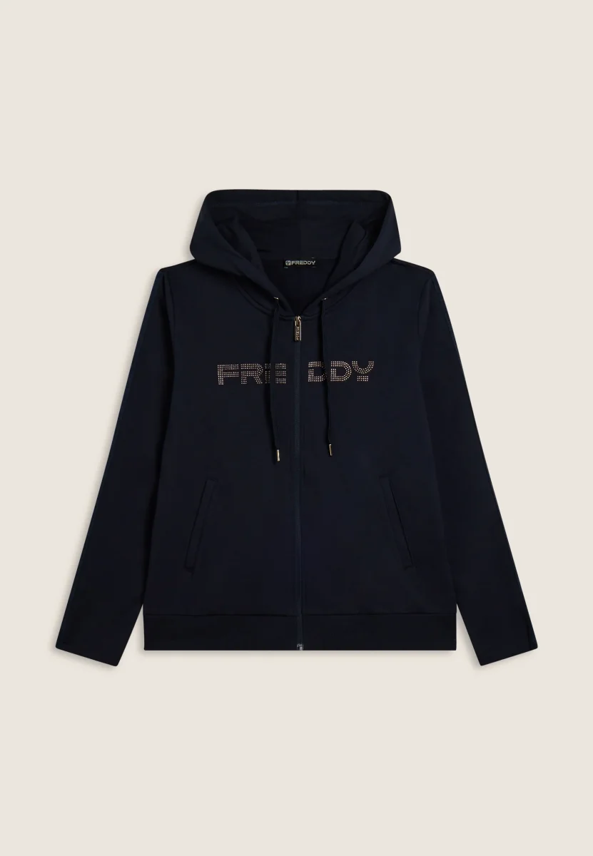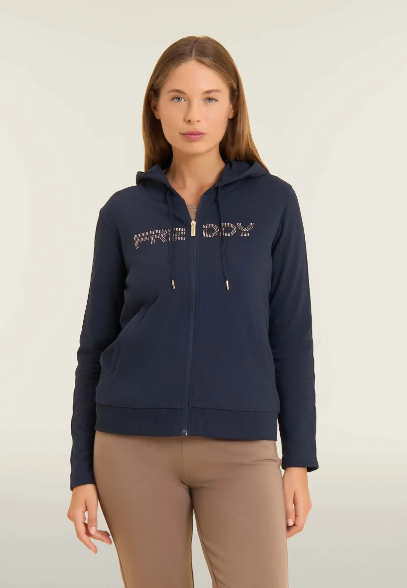 Questa felpa da donna unisce estetica e funzionalità. Realizzata in felpa garzata elasticizzata con vestibilità regular, presenta cappuccio foderato in jersey, coulisse regolabile e maniche decorate da una banda logata in jacquard. Il grande logo FREDDY in strass sul petto aggiunge un tocco brillante. Dotata di tasche interne a filetto e fondo rifinito in costina.
