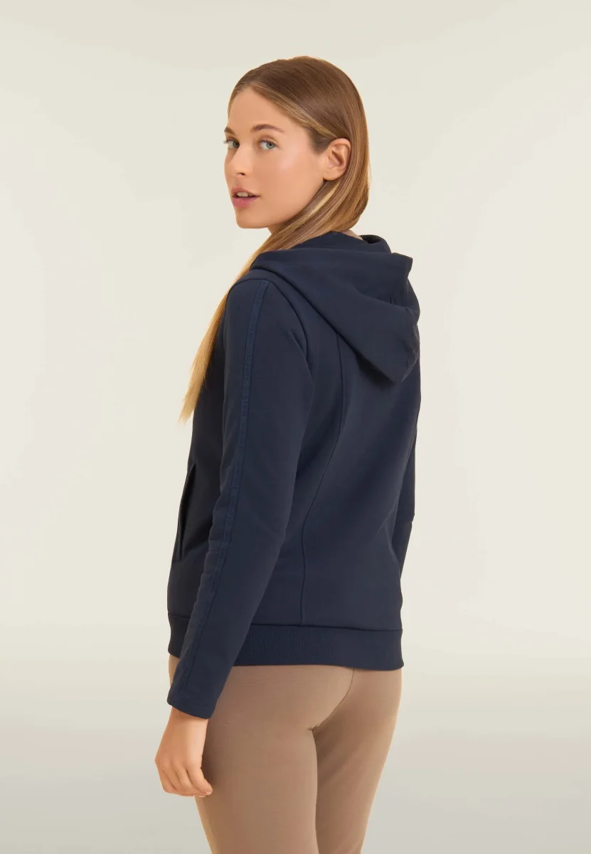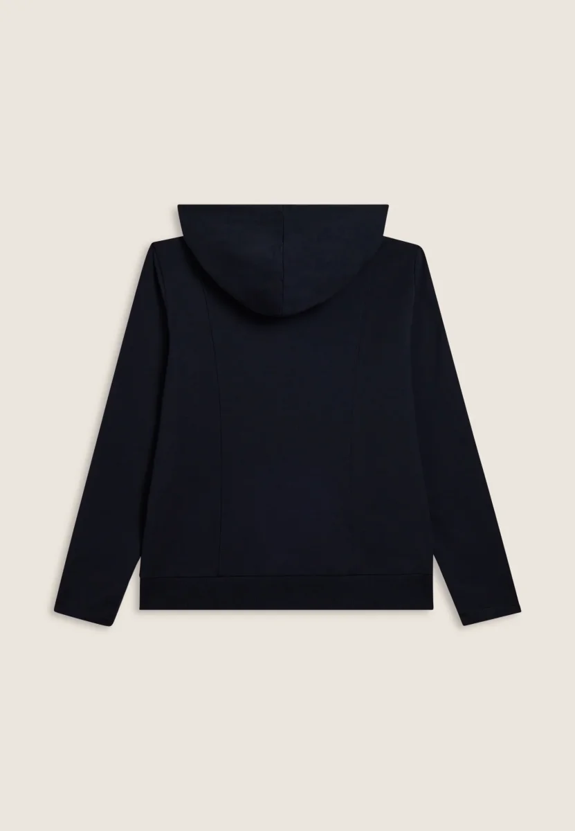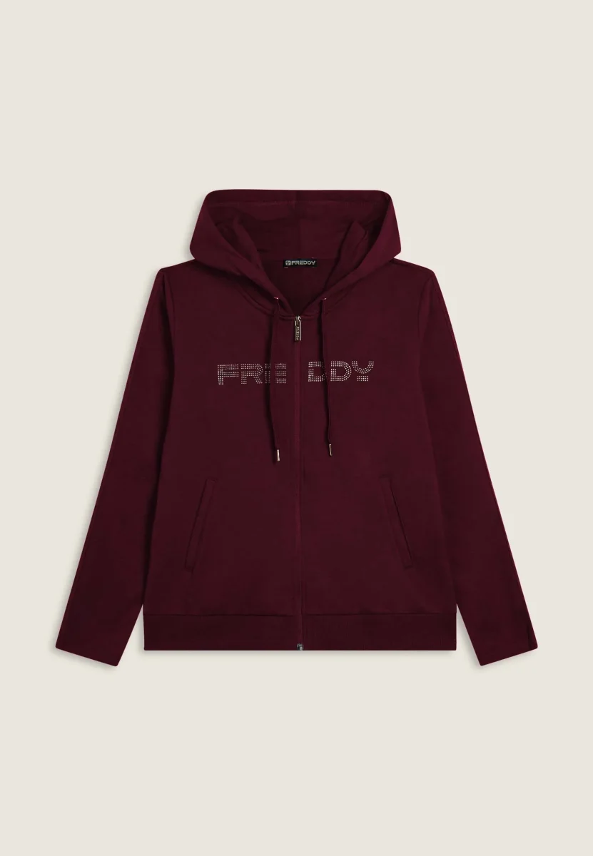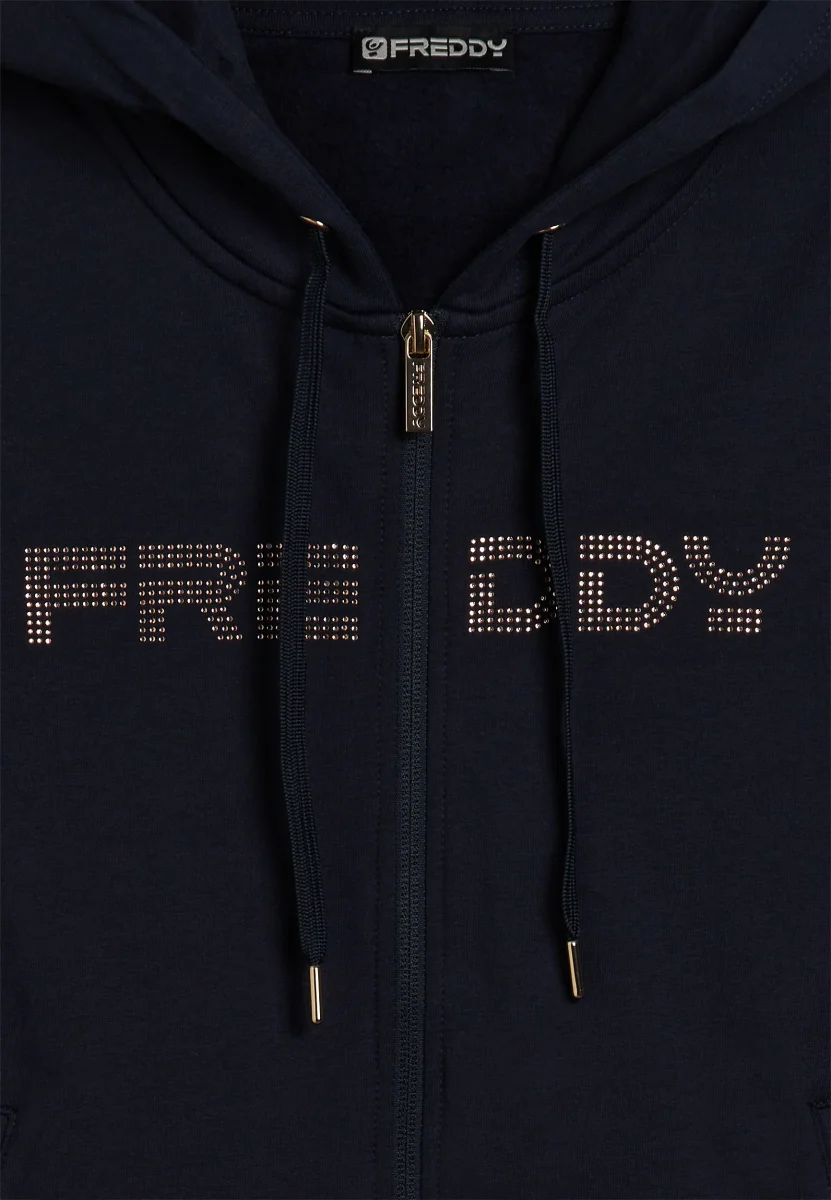 Questa felpa da donna unisce estetica e funzionalità. Realizzata in felpa garzata elasticizzata con vestibilità regular, presenta cappuccio foderato in jersey, coulisse regolabile e maniche decorate da una banda logata in jacquard. Il grande logo FREDDY in strass sul petto aggiunge un tocco brillante. Dotata di tasche interne a filetto e fondo rifinito in costina.