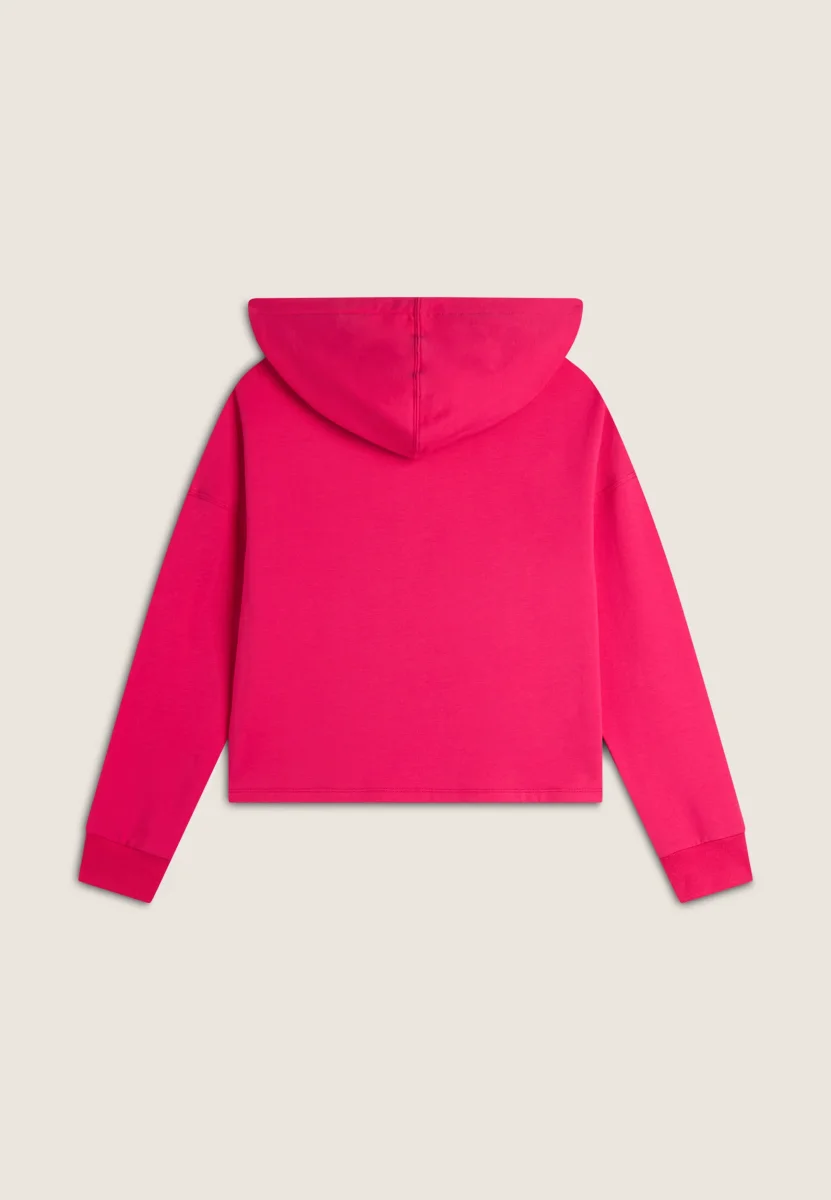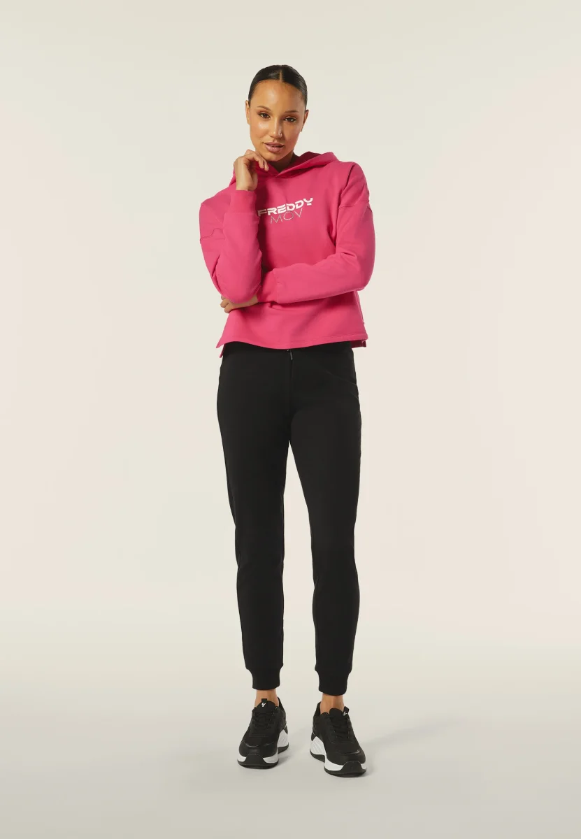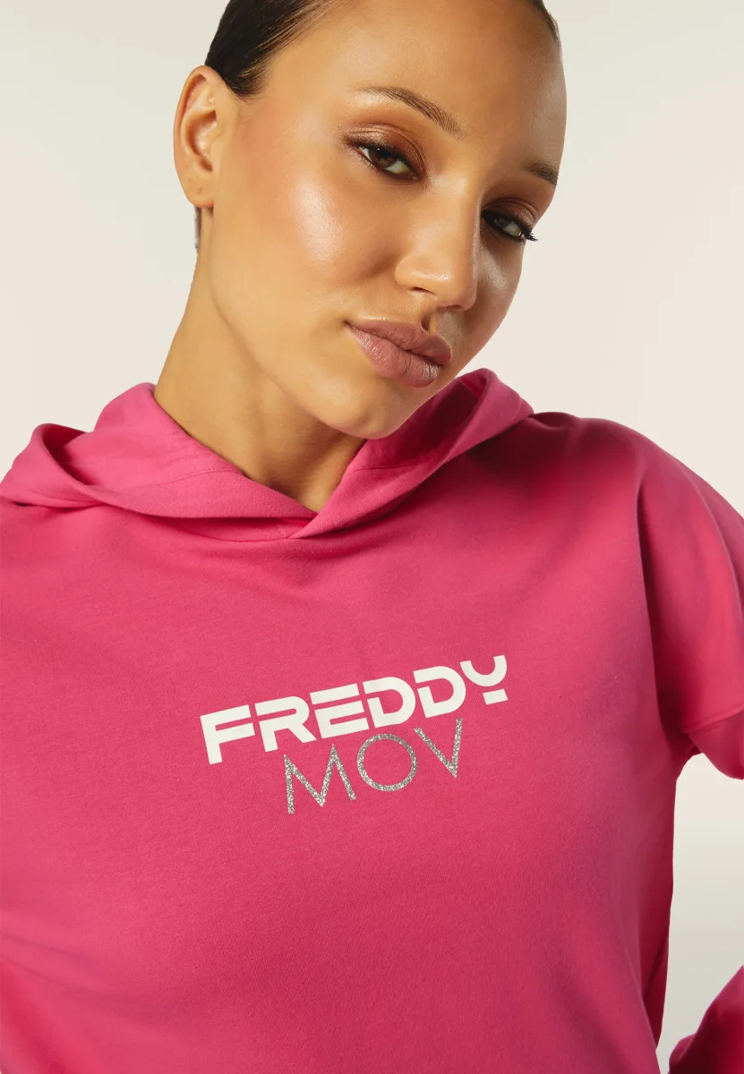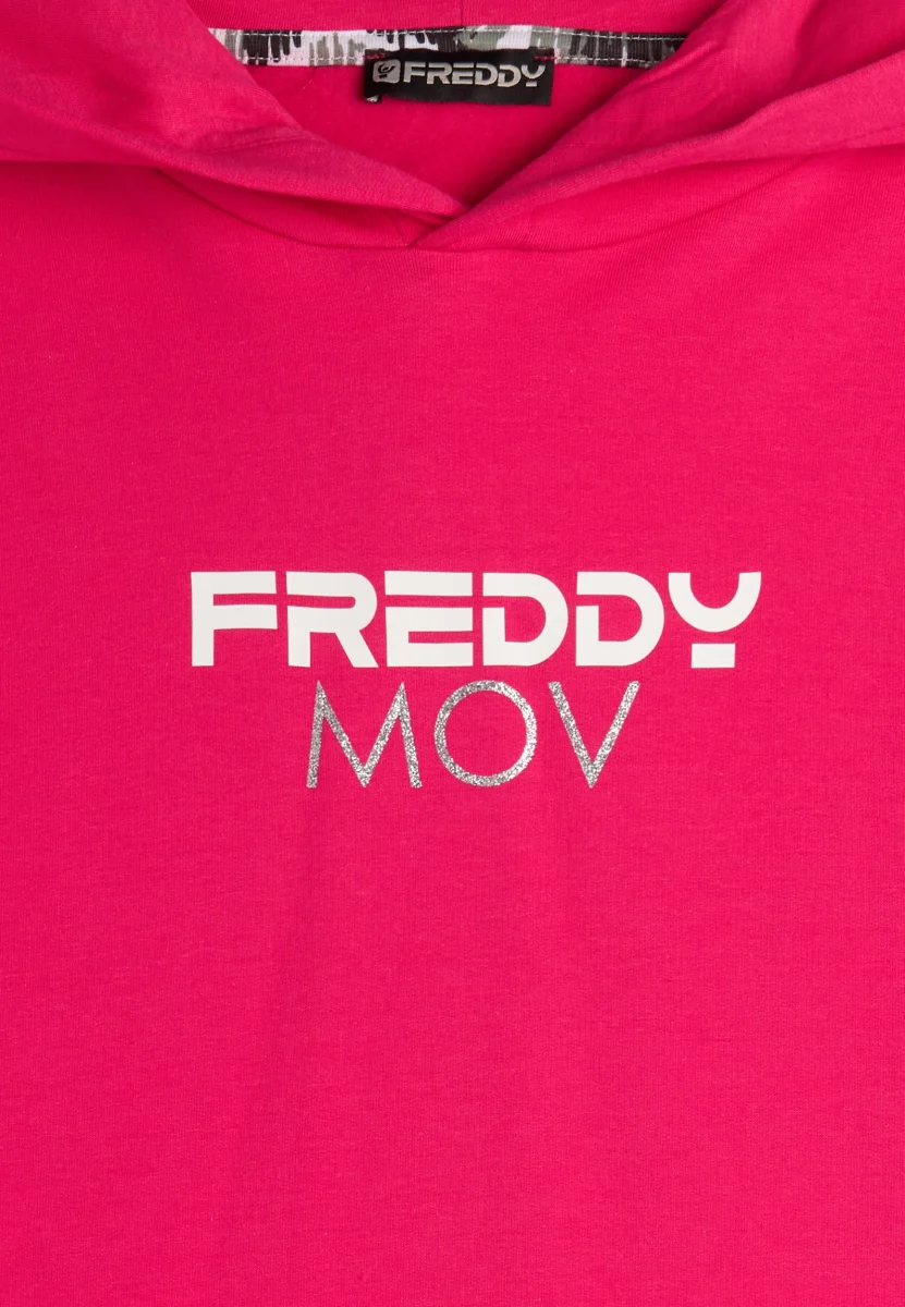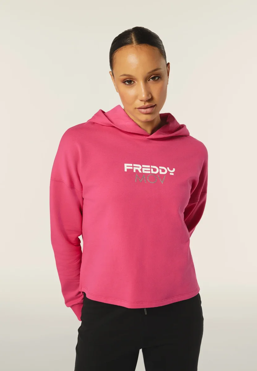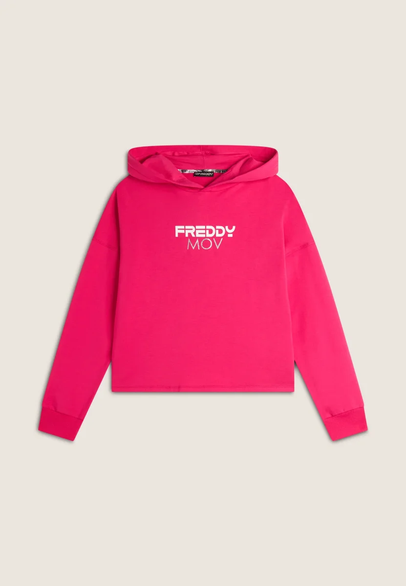 Questa felpa corta con cappuccio è perfetta per un look casual e sportivo. Realizzata in felpa garzata elasticizzata, presenta una stampa FREDDY MOV al centro del capo. Il cappuccio doppiato in jersey aggiunge comfort e stile. Il fondo dritto con spacchi laterali, leggermente più lungo sul retro, e le maniche lunghe con polsino in costina e spalla scesa, completano il design versatile e moderno.