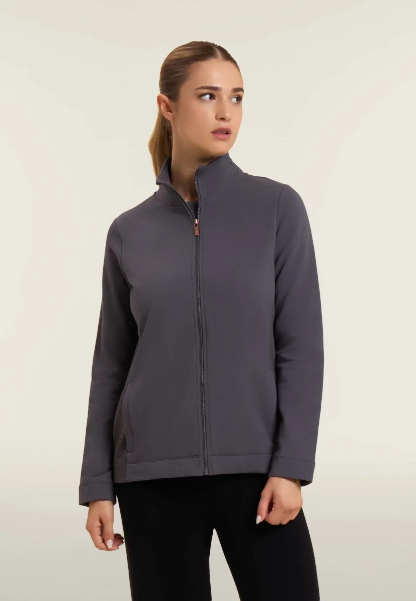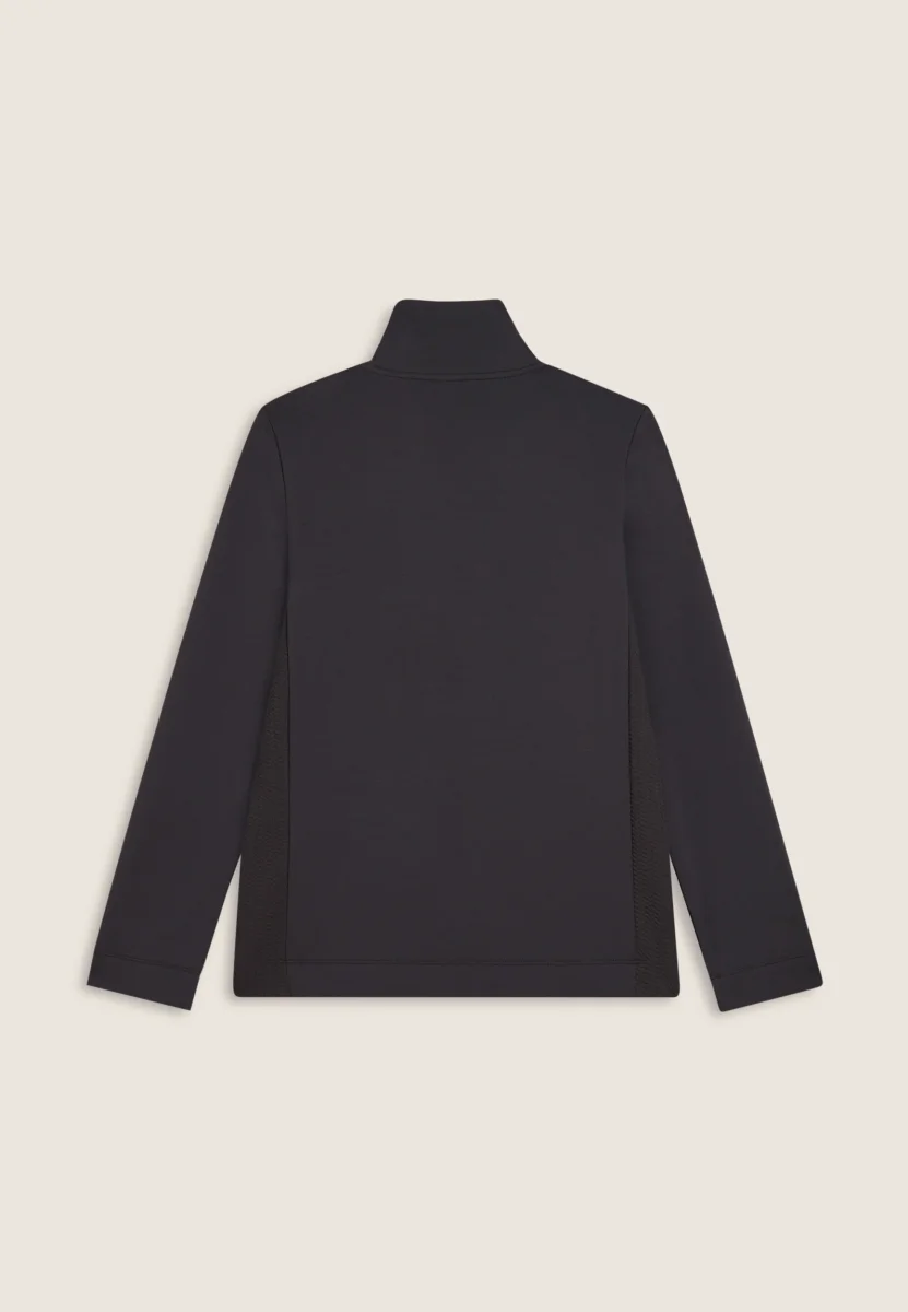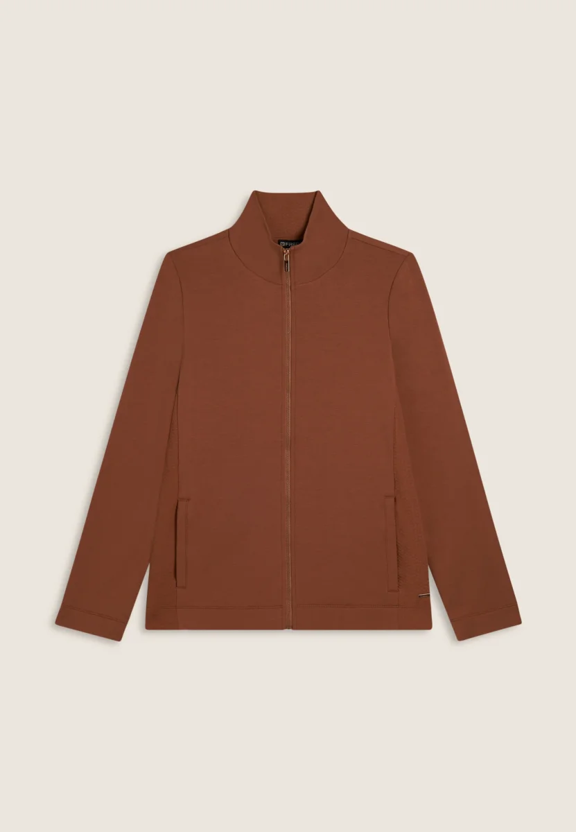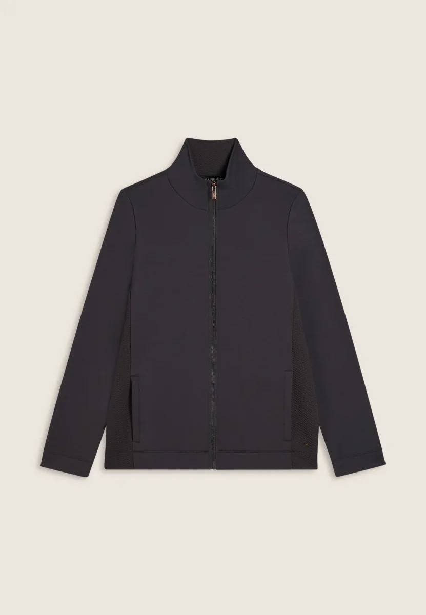 Felpa da donna dalla vestibilità regolare, che combina calore e morbidezza della felpa modal garzata elasticizzata con raffinati inserti laterali e interno collo in felpa tecnica a doppio strato dalla texture a micro-trecce. La chiusura full-zip, il collo alto e le tasche interne a filetto offrono praticità ed eleganza quotidiana. Placchetta con logo FREDDY sul cuore.