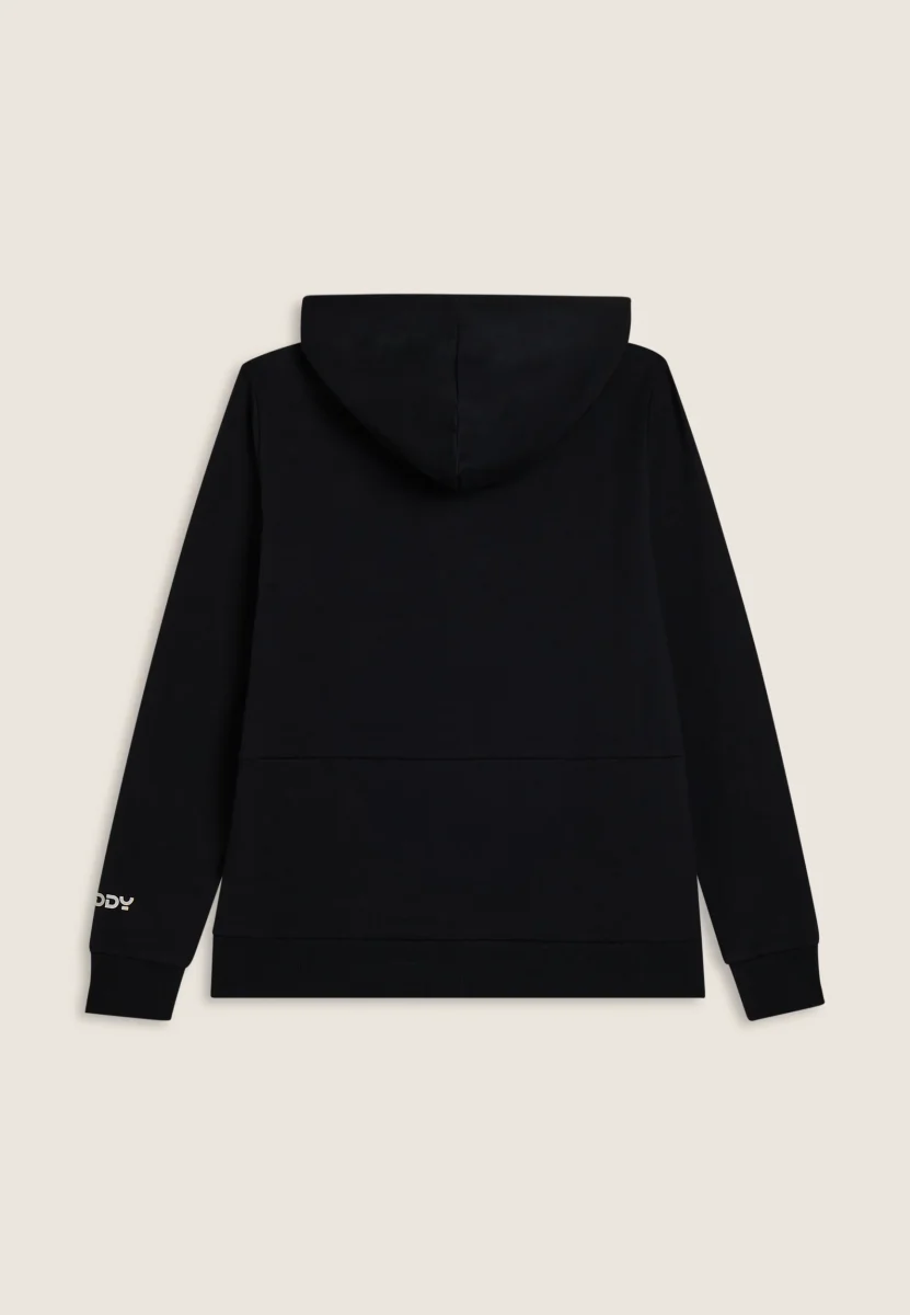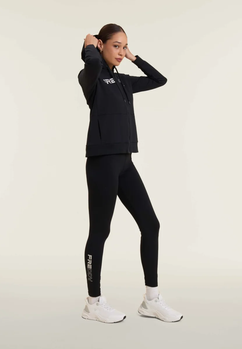 Felpa sportiva dal fit comfort con chiusura full zip, cappuccio regolabile con coulisse e fodera in jersey. Il fondo e i polsini sono in costina per una vestibilità stabile. Il grande logo FREDDY sul petto ad effetto perlato dona un tocco energico, mentre le tasche interne a filetto aumentano la praticità. Realizzata in felpa garzata elasticizzata.