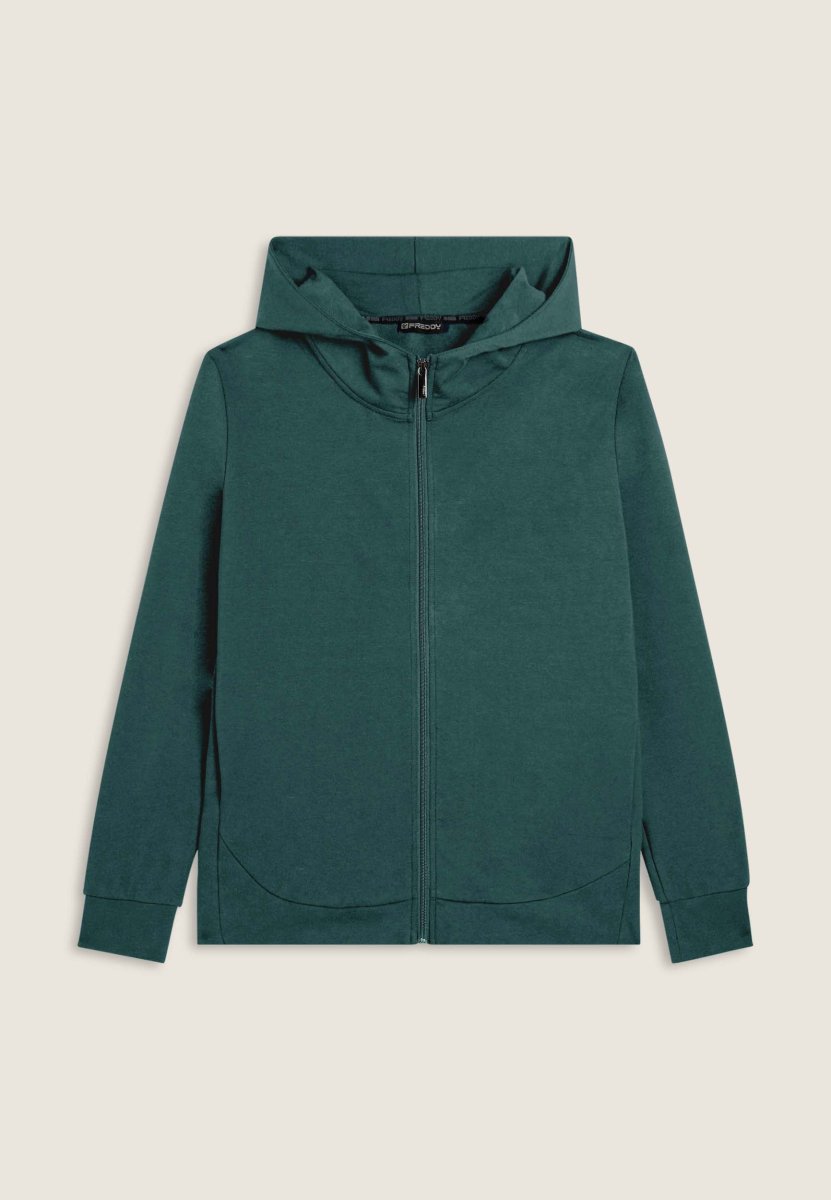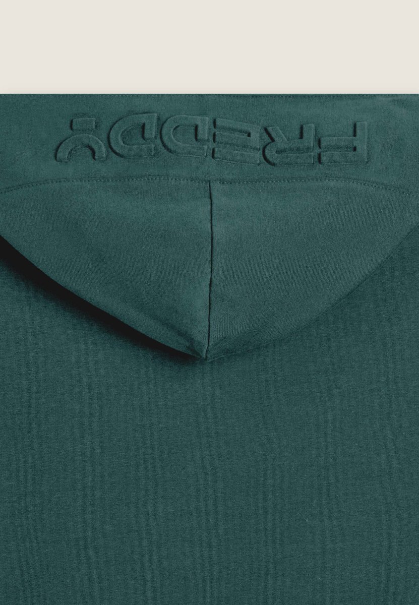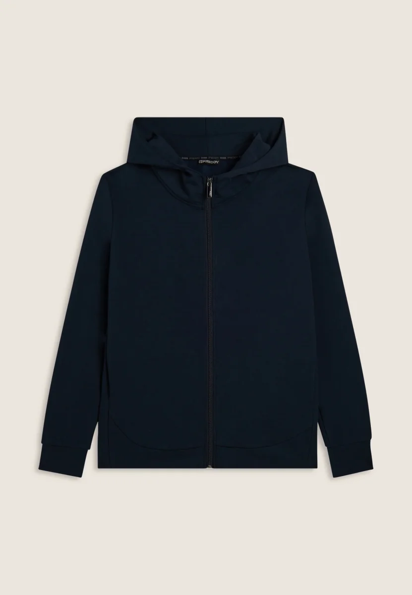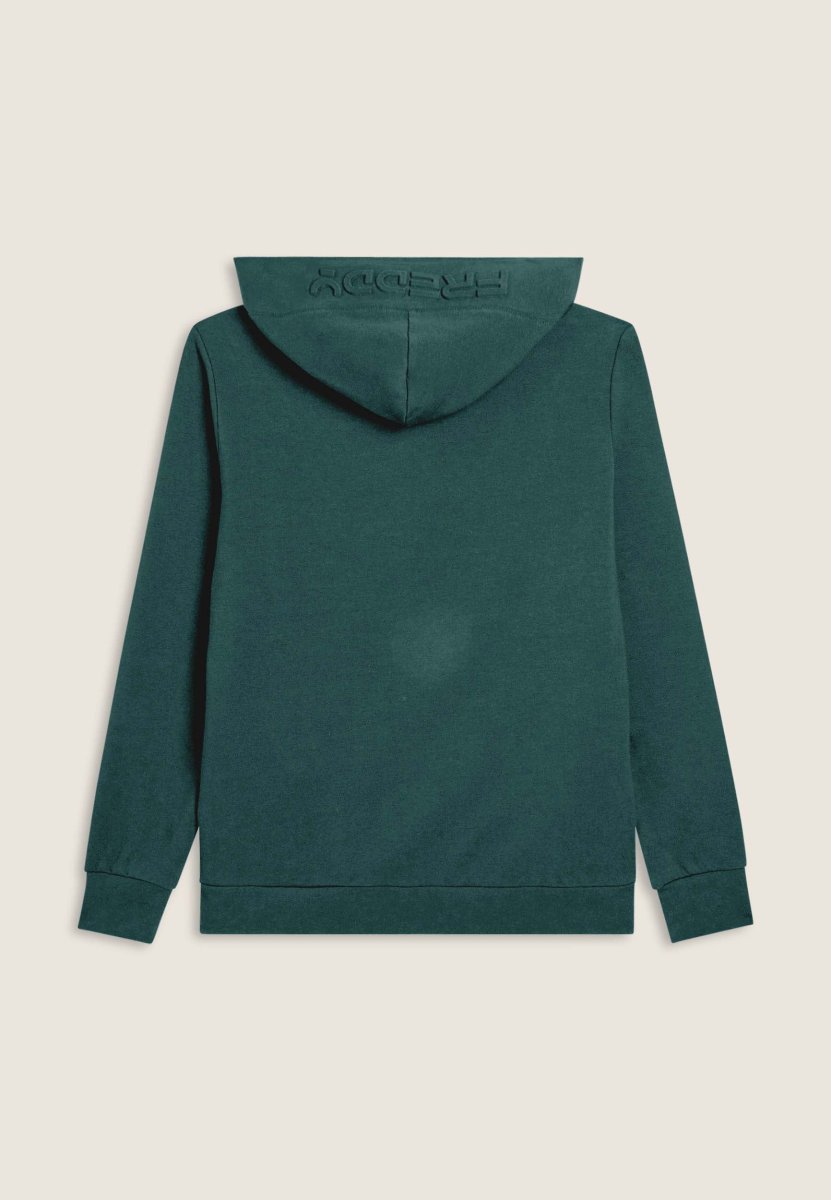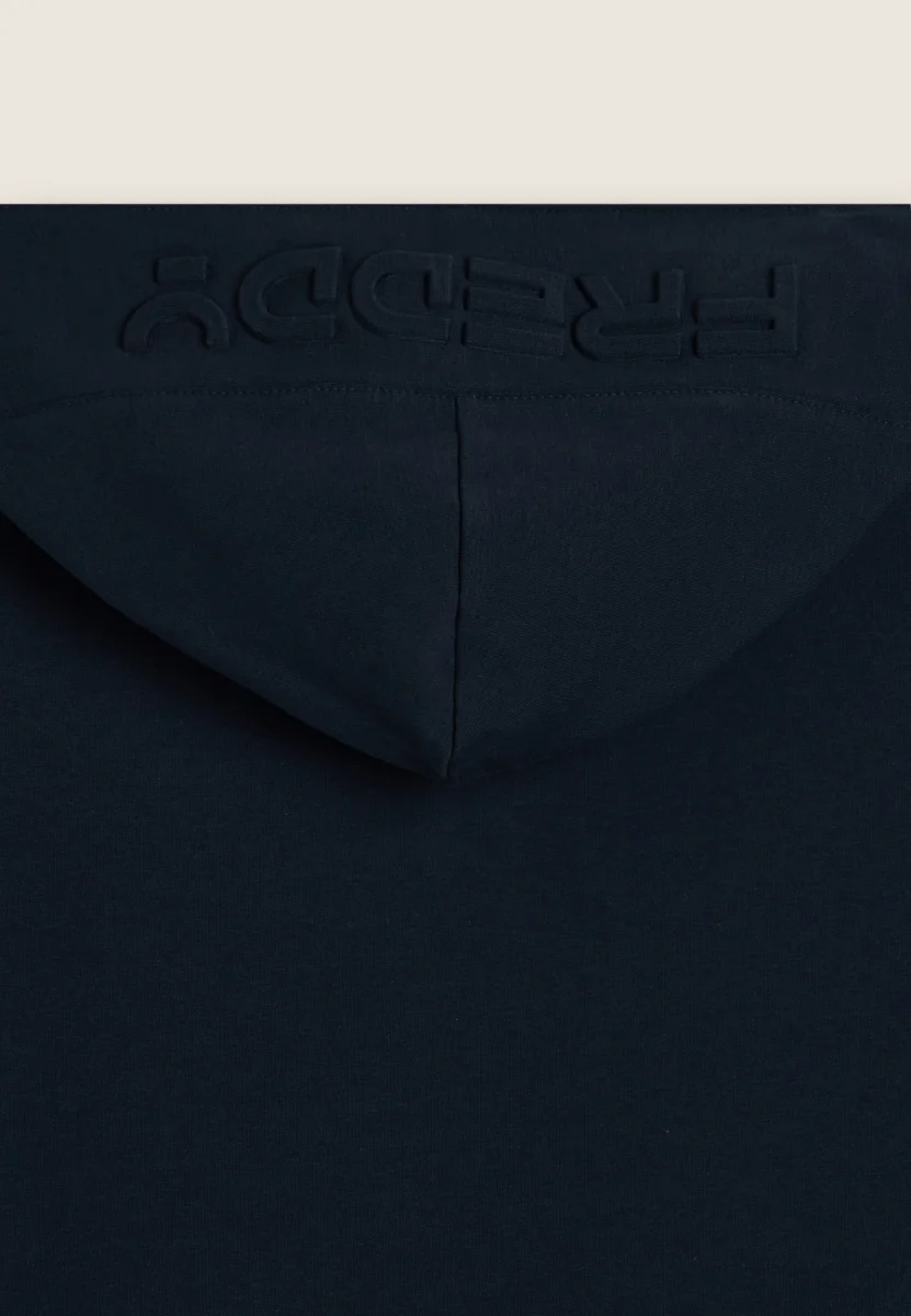 Felpa da uomo con vestibilità regular e fondo leggermente arrotondato sul retro per un fit più fluido. Chiusura full zip, cappuccio con interno in jersey e maniche con polsini elasticizzati. Il maxi logo Freddy in rilievo sul cappuccio aggiunge un tocco distintivo. Dotata di tasche interne con zip. Il tessuto interlock stretch regala una vestibilità piacevole e confortevole.