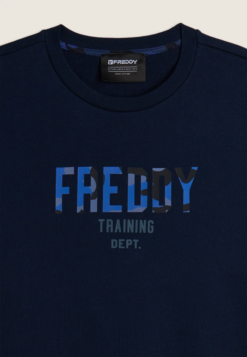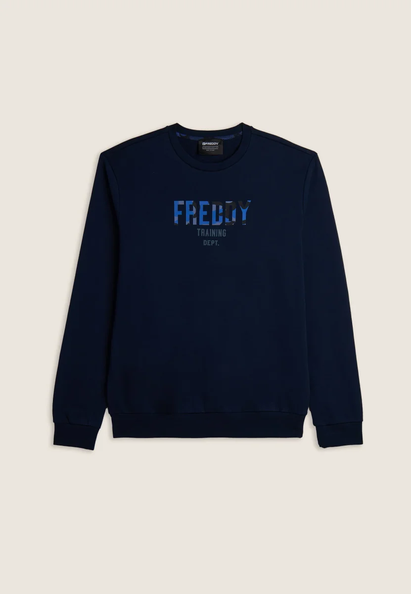 Una felpa comoda e dallo stile sportivo, realizzata in 100% cotone per un comfort ottimale. Presenta scollo girocollo, maniche lunghe con spalla scesa e polsini in costina per una vestibilità rilassata. Il design è completato dalla scritta FREDDY TRAINING DEPT. al centro del capo.