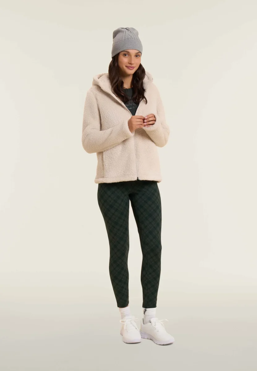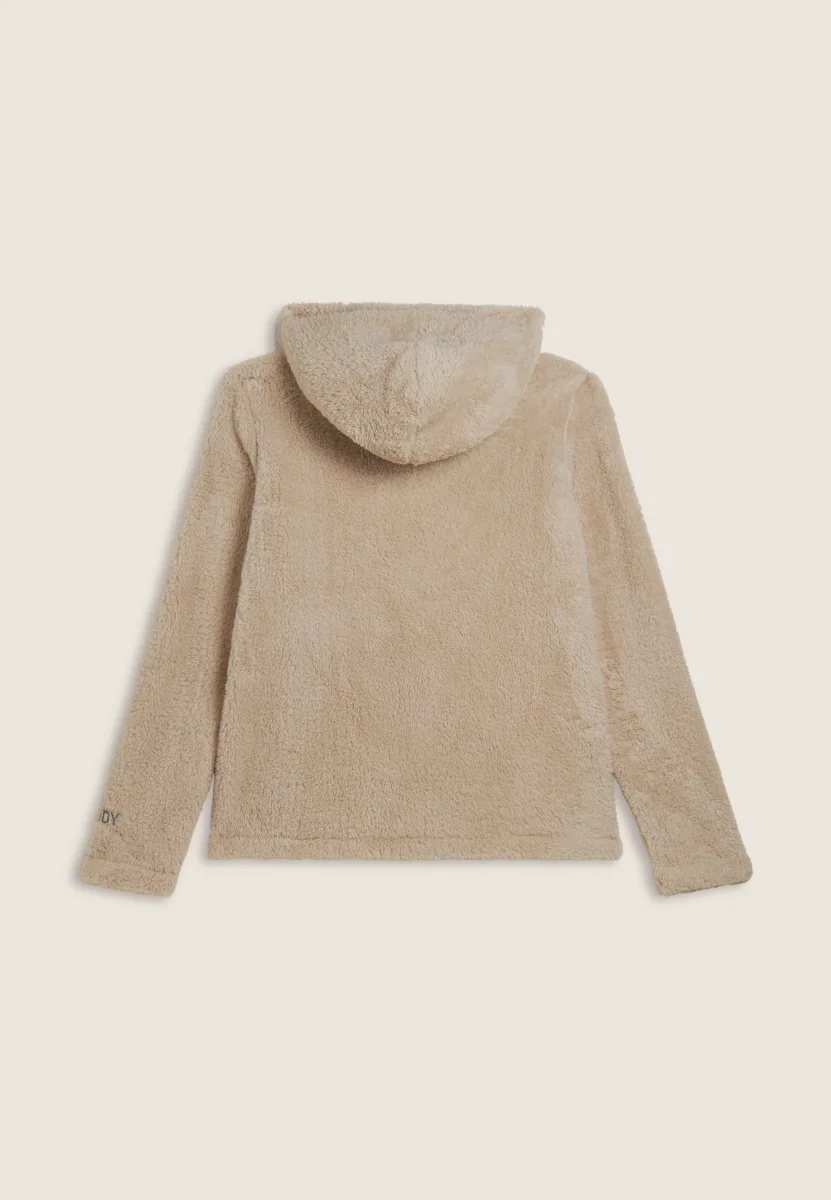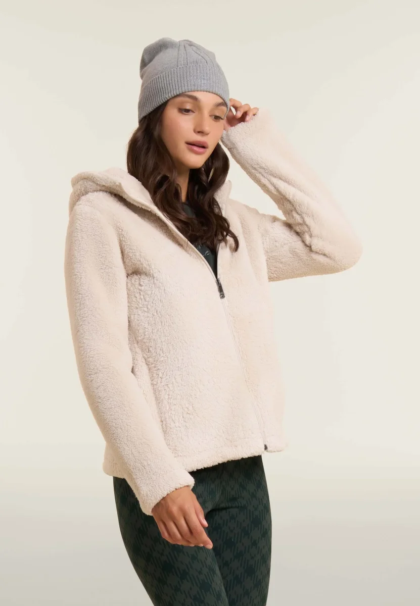 Felpa donna con chiusura full zip in pile sherpa, dotata di cappuccio e fondo dritto. Maniche lunghe senza polsini, logo in filo lurex sul fondo manica e tasche interne. Ideale per comfort e calore con un tocco luminoso.