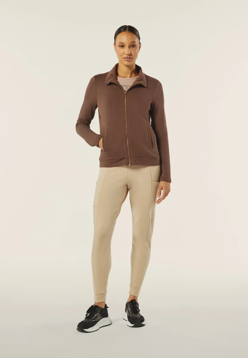 La felpa donna regular fit in felpa garzata di viscosa offre comfort e calore. Gli inserti sui fianchi e all’interno del collo alto in felpa bonded a trecce aggiungono un dettaglio sofisticato richiamando l’aspetto della maglia in lana lavorata. Il logo applicato sul fondo sinistro, le tasche interne a filetto e la chiusura con zip in colore oro rosa completano il look rilassato e raffinato.