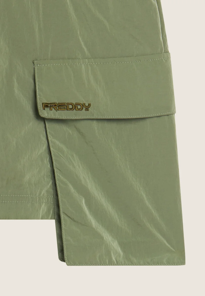Brilla con questa gonna corta leggermente svasata in luminoso nylon navetta. La vita regular con zip e bottone offre una vestibilità perfetta, mentre le tasche capienti più lunghe dell’orlo aggiungono funzionalità e movimento. Il logo Freddy ricamato sulla patta del tascone sinistro e le tasche interne completano il look trendy!