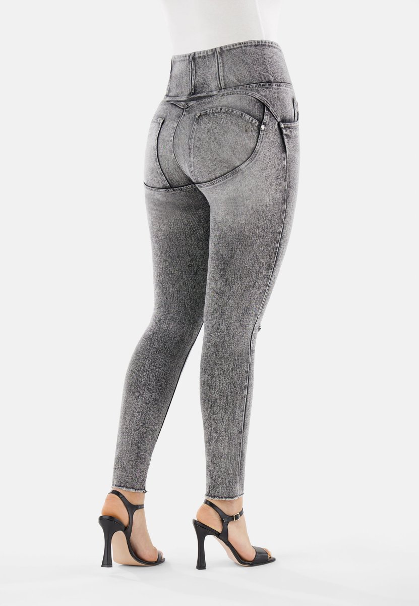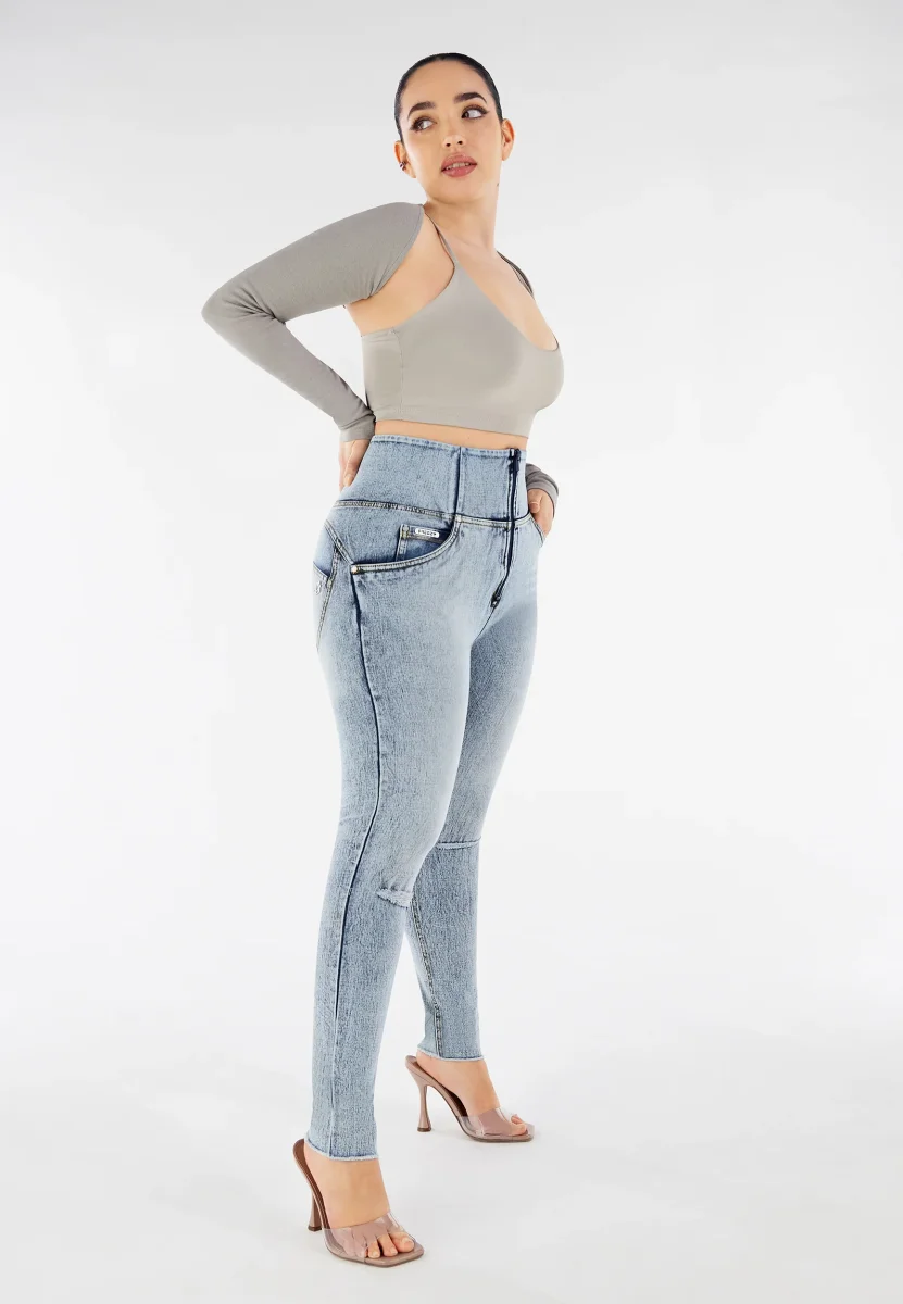 Jeans push up WR.UP® sostenibili in denim navetta elasticizzato con effetto marble wash caratterizzati da strappi e fondo sfrangiato. Questi pantaloni sono ideati per valorizzare specificatamente le forme più generose mantenendo una piacevole comodità grazie alla particolare vestibilità curvy: più confortevole su vita e fianchi e superskinny sul resto della gamba per favorire la massima aderenza. Il modello presenta tasche frontali e posteriori vere con rivetti, lunghezza regular e vita alta chiusa con zip frontale.