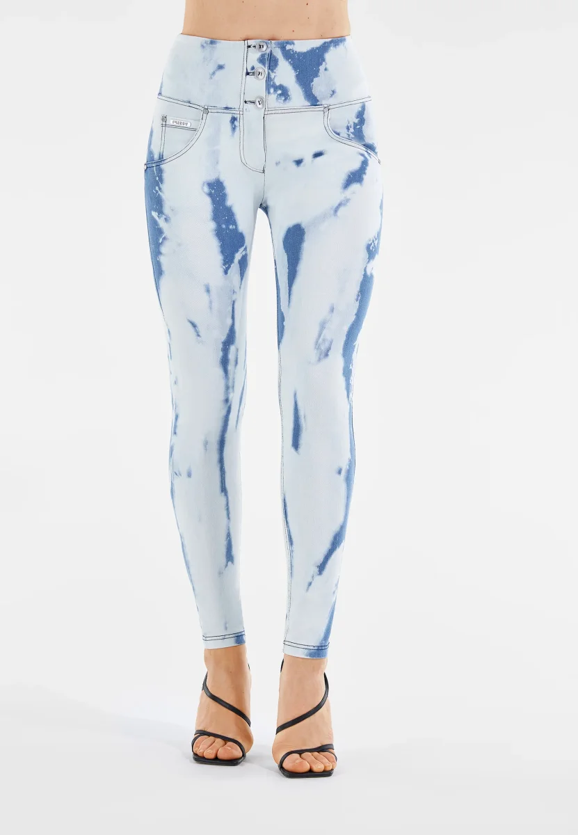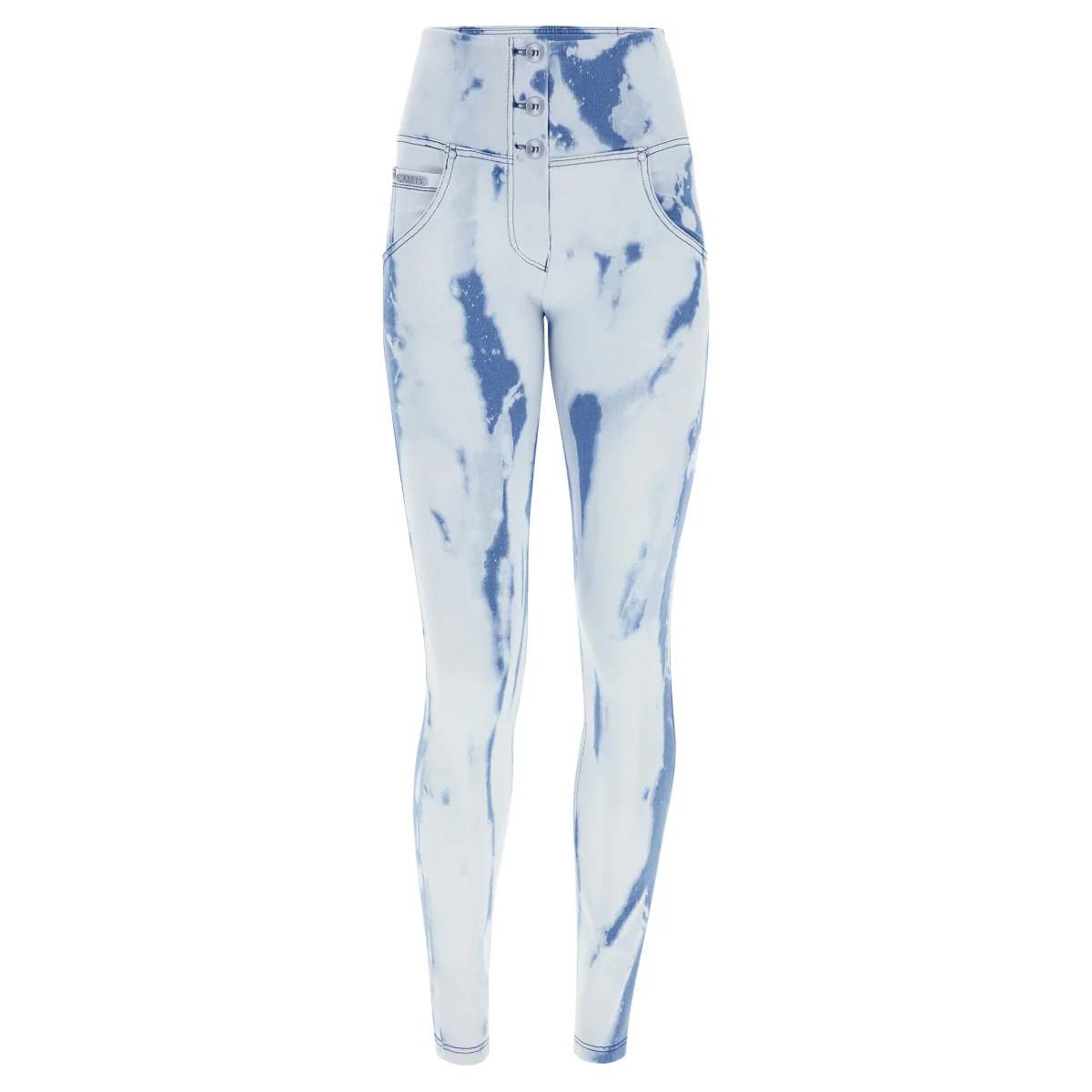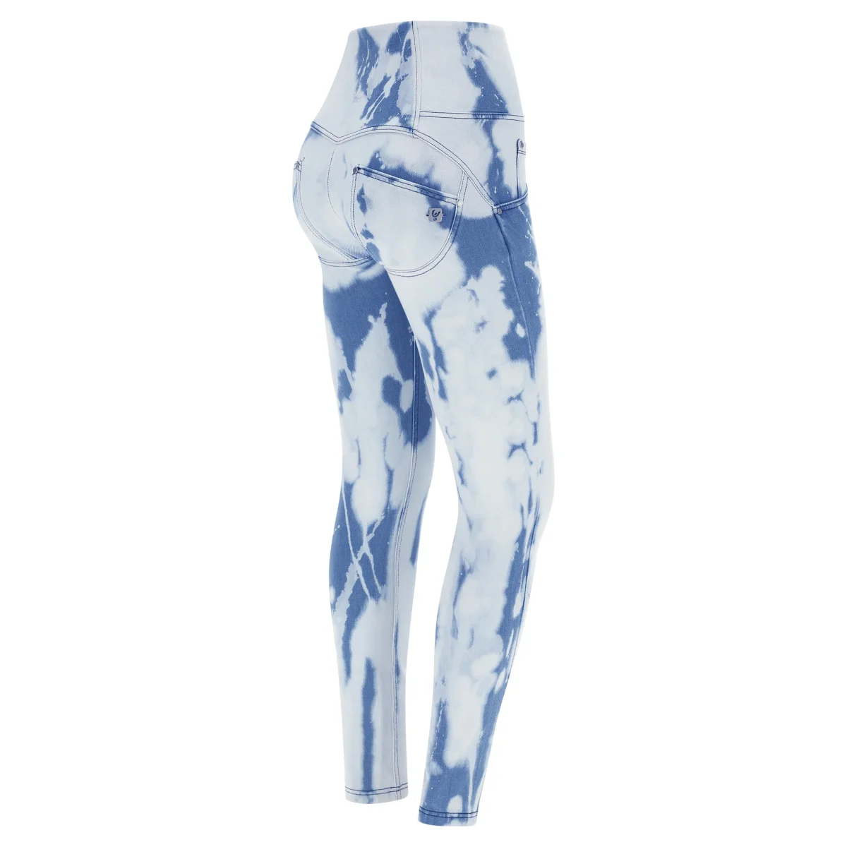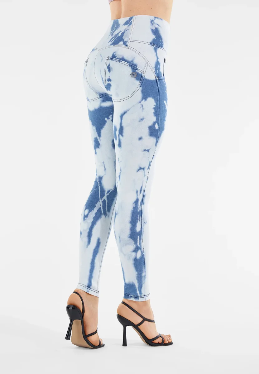 Jeans push up WR.UP® denim tie-dye blu e bianco a vita alta