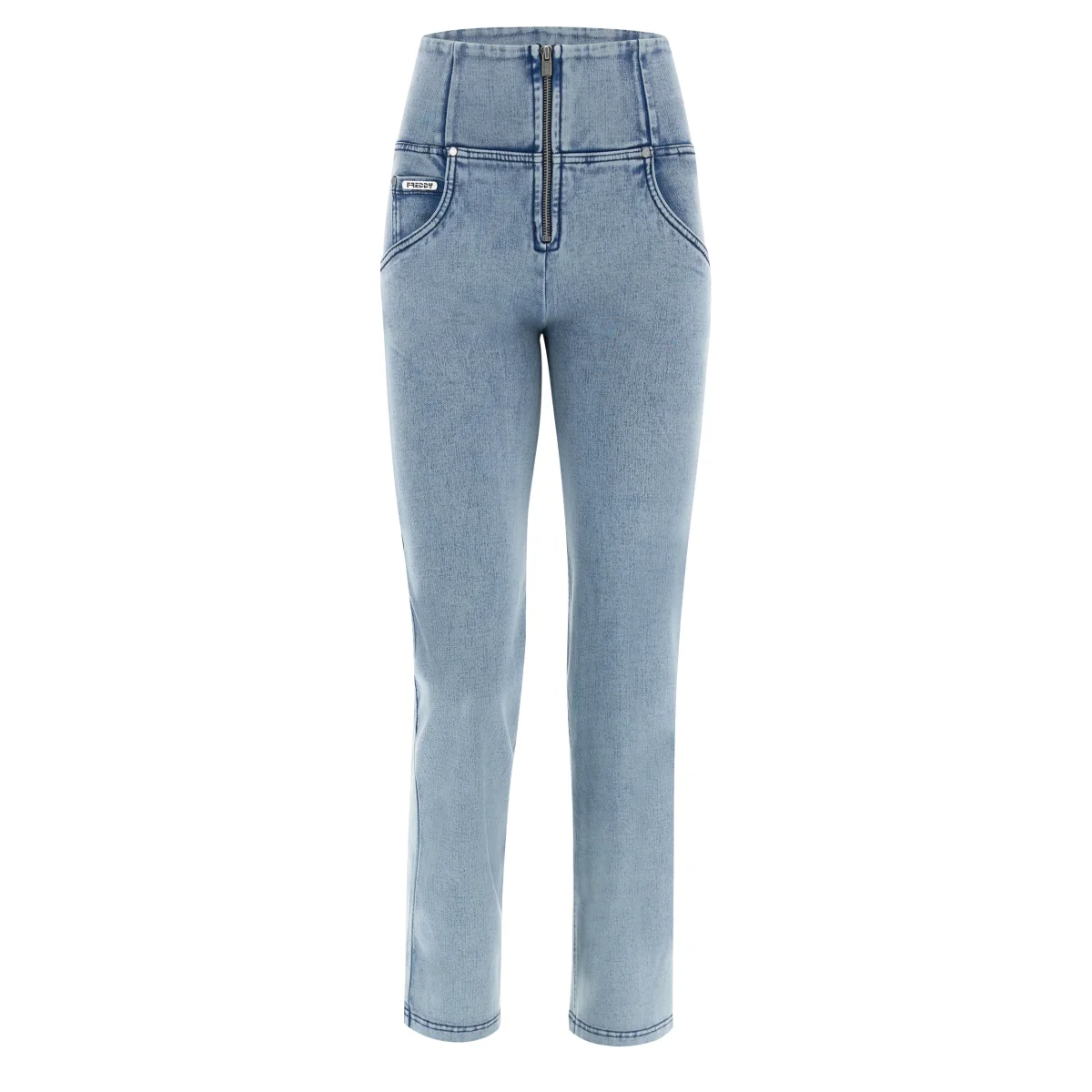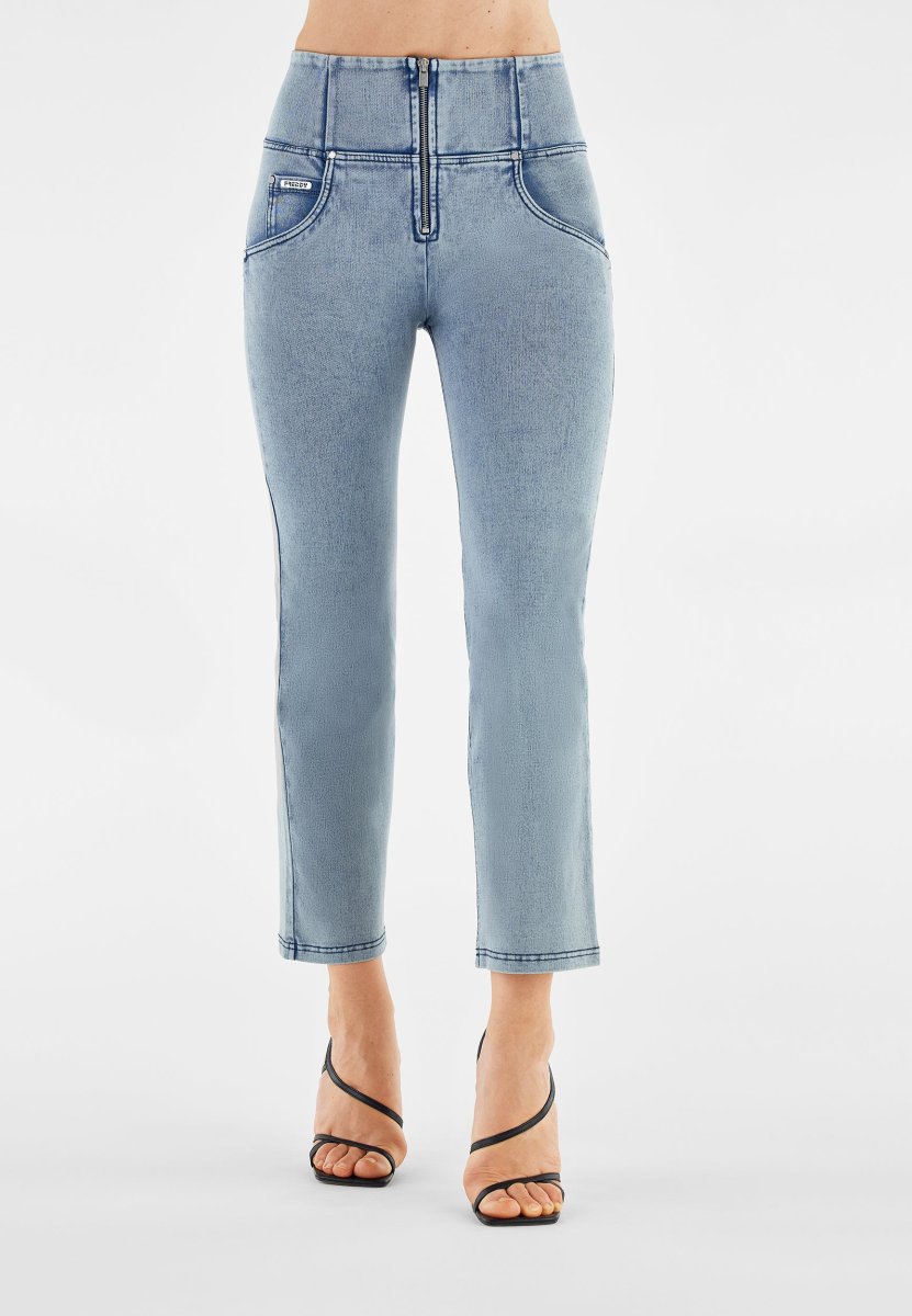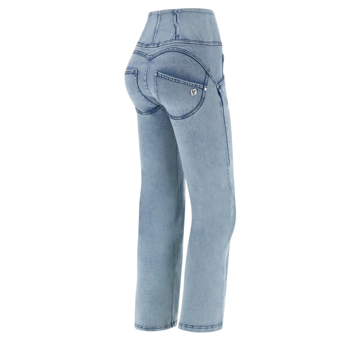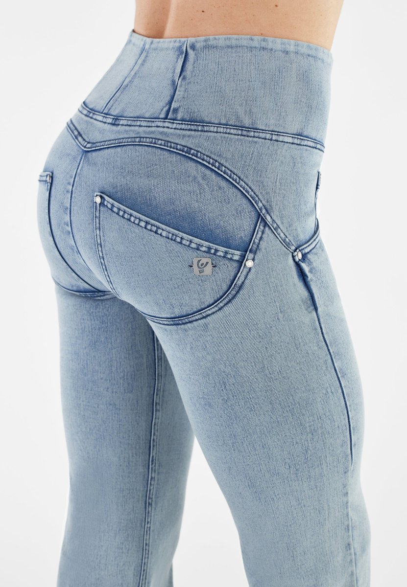 Jeans push up della linea WR.UP® in denim ecologico elasticizzato chiaro perfetti per valorizzare le tue forme in ogni occasione e in comodità. Il modello presenta vita alta con zip frontale, tasche frontali e posteriori vere con rivetti, taglio wide leg e lunghezza cropped. Capo ideato per mettere in luce la tua femminilità grazie flessibilità del tessuto e all’effetto shaping dato dalla tecnologia WR.UP® brevettata da Freddy che solleva le forme e modella la silhouette per mezzo di un particolare sistema di inserti e cuciture.