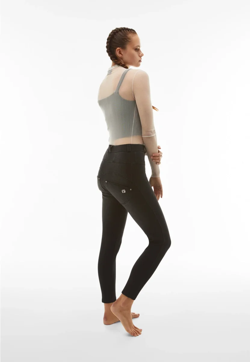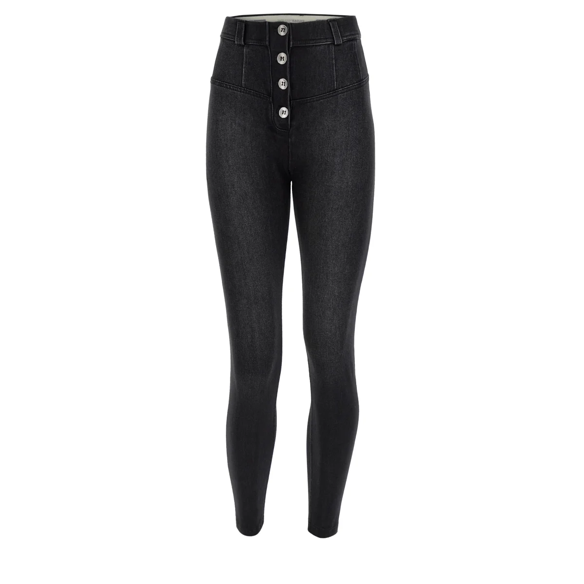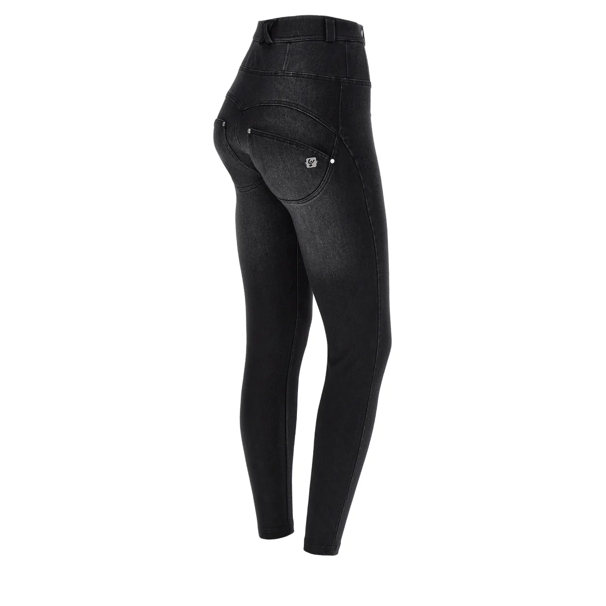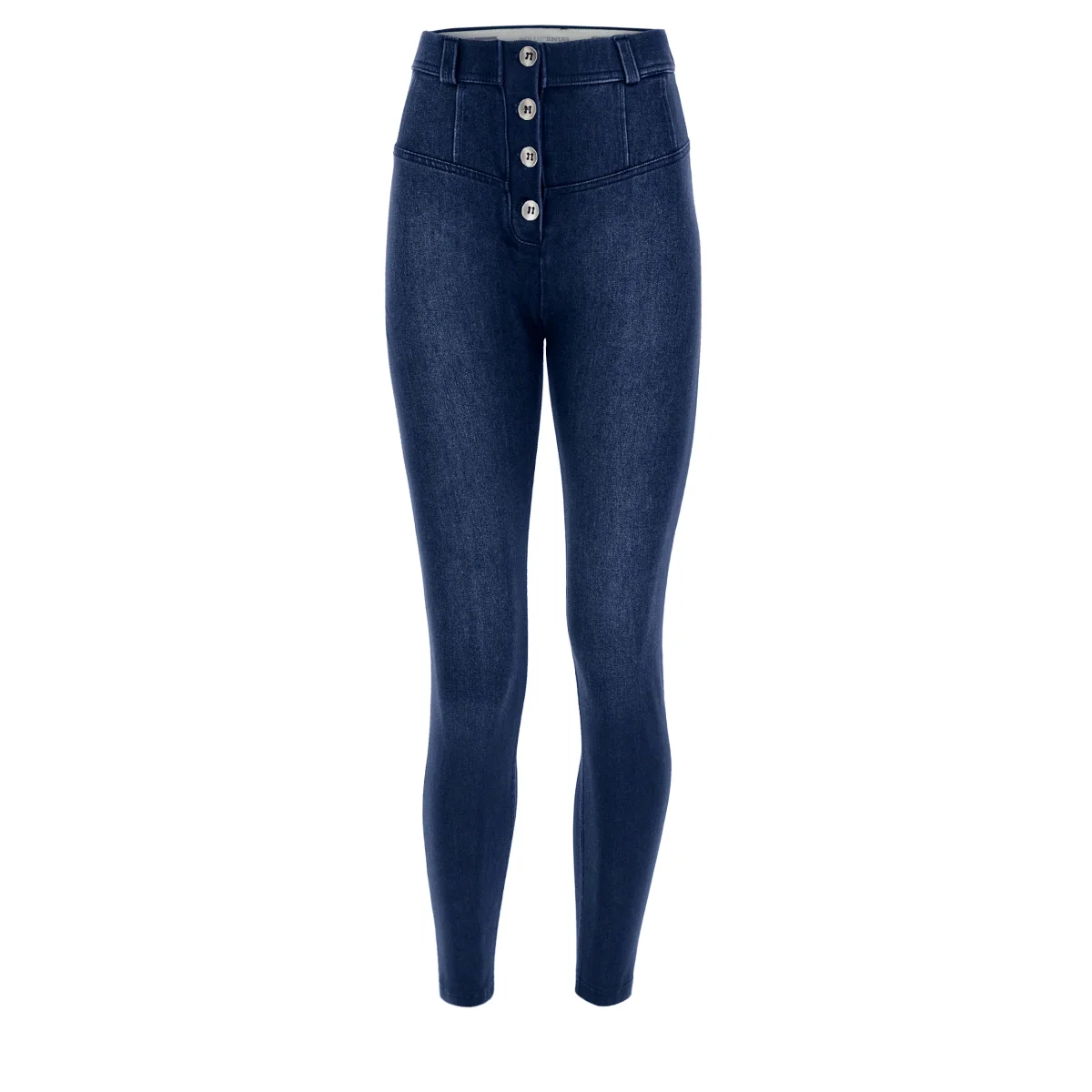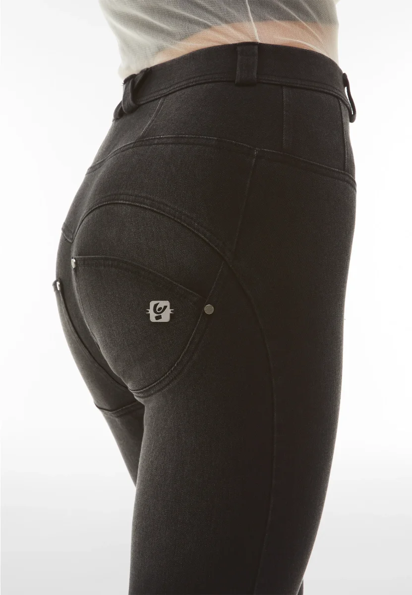 Jeans push up della linea WR.UP® in denim navetta elasticizzato con effetto leggermente vissuto, resi originali dalla vita altissima decorata da impunture che richiamano un bustier.