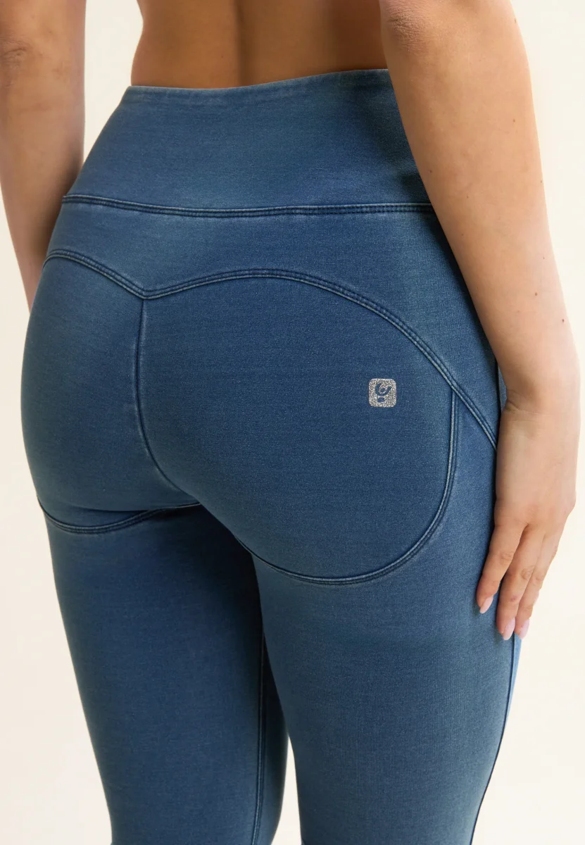 Questi jeggings superskinny WR.UP® CORE in jersey di cotone organico con lavaggio effetto denim combinano comfort e l’effetto shaping della tecnologia brevettata WR.UP®. La vita alta assicura una vestibilità perfetta, mentre l’effetto arricciato lungo le cuciture sul fondo gamba dona un dettaglio unico alla lunghezza 7/8 alla caviglia. Il design pulito senza tasche è impreziosito dal piccolo logo FREDDY sul fianco sinistro e dal logo FY sul fianco posteriore destro.