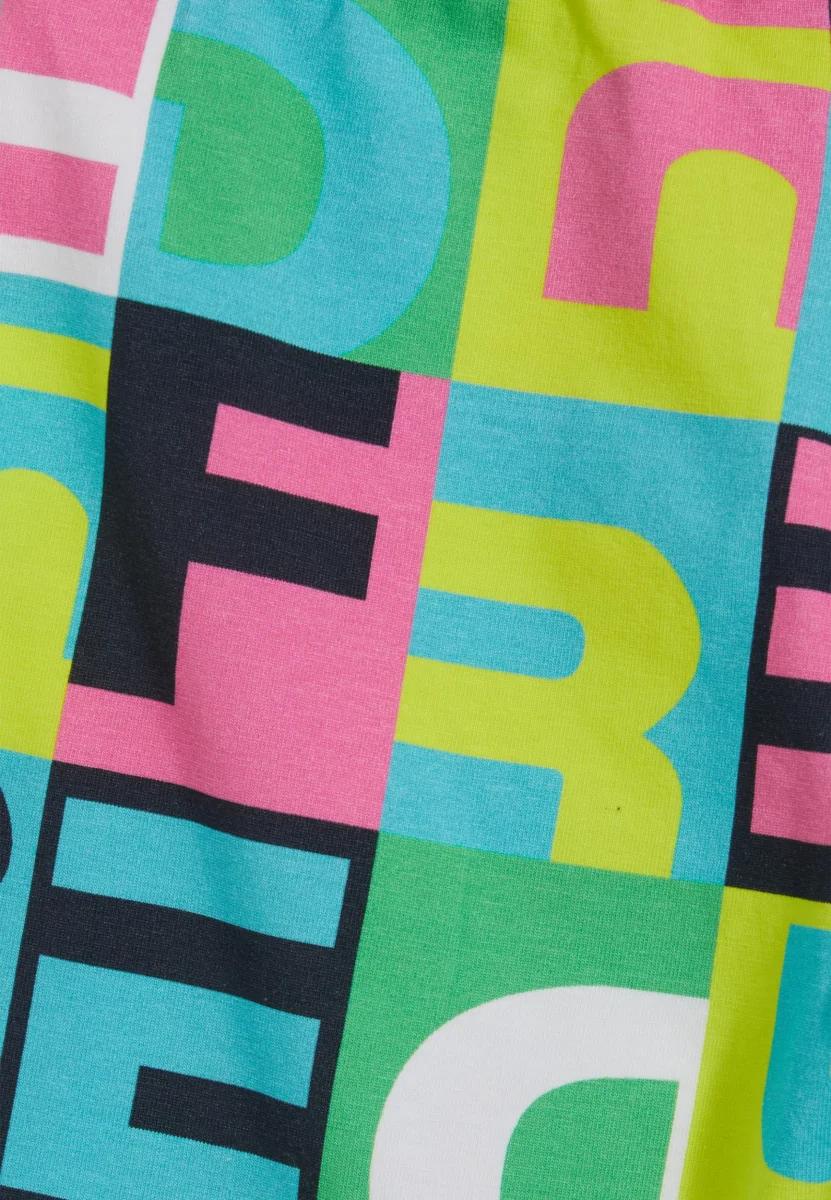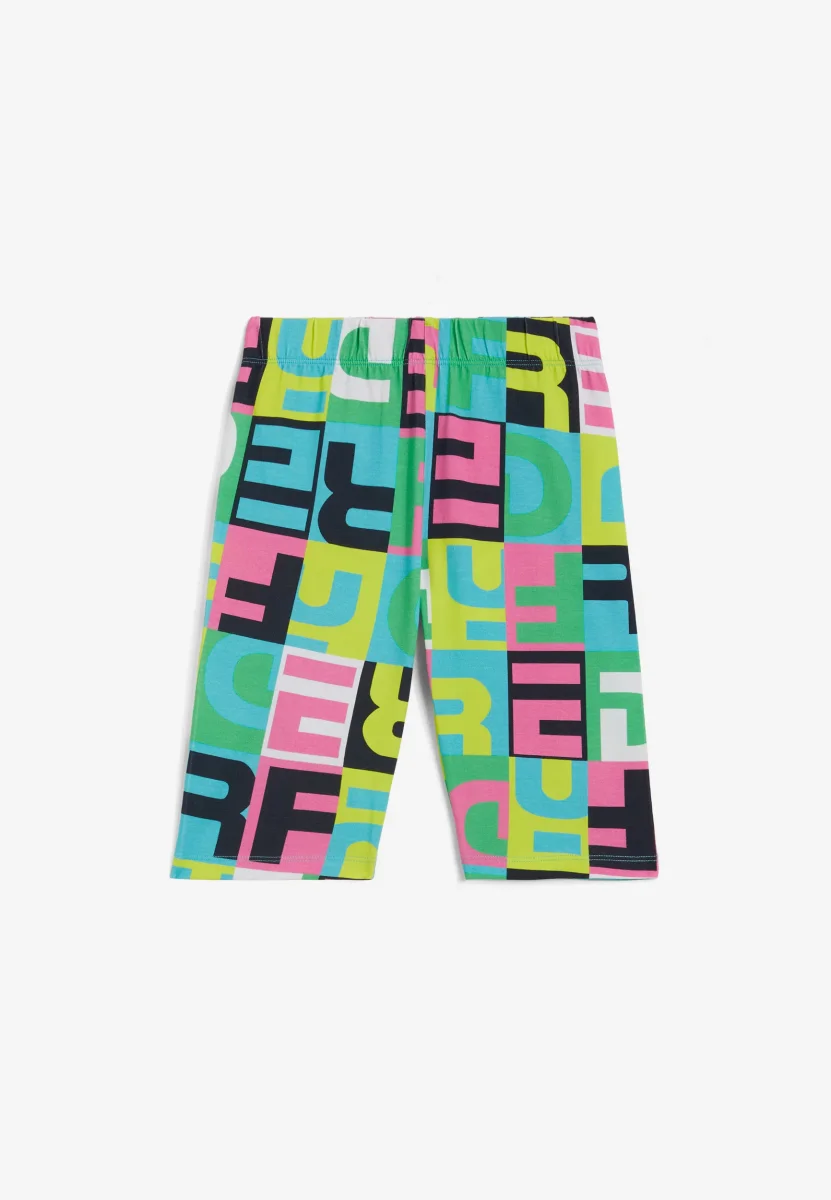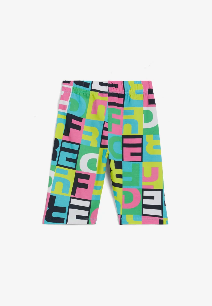 Questi leggings da bambina e ragazza in jersey di cotone elasticizzato hanno una lunghezza biker che li rende perfetti per il tempo libero e le attività quotidiane all’insegna del piacere per la libertà di movimento. La fantasia all over del logo FREDDY su riquadri dai colori fluo dona energia e vivacità al capo.