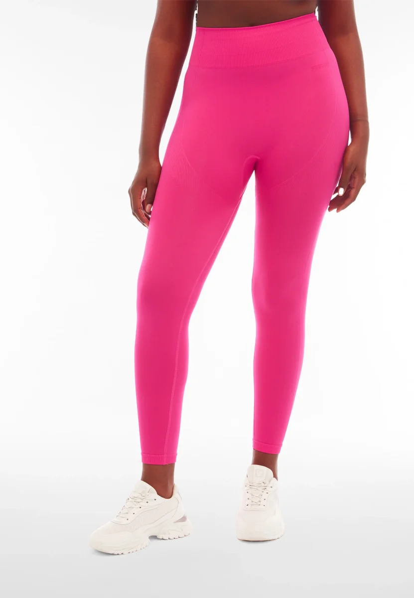 Leggings dalla lunghezza 7/8 alla caviglia realizzati in poliammide elasticizzato, un tessuto senza cuciture ecosostenibile ottenuto per il 60% da materiali riciclati.