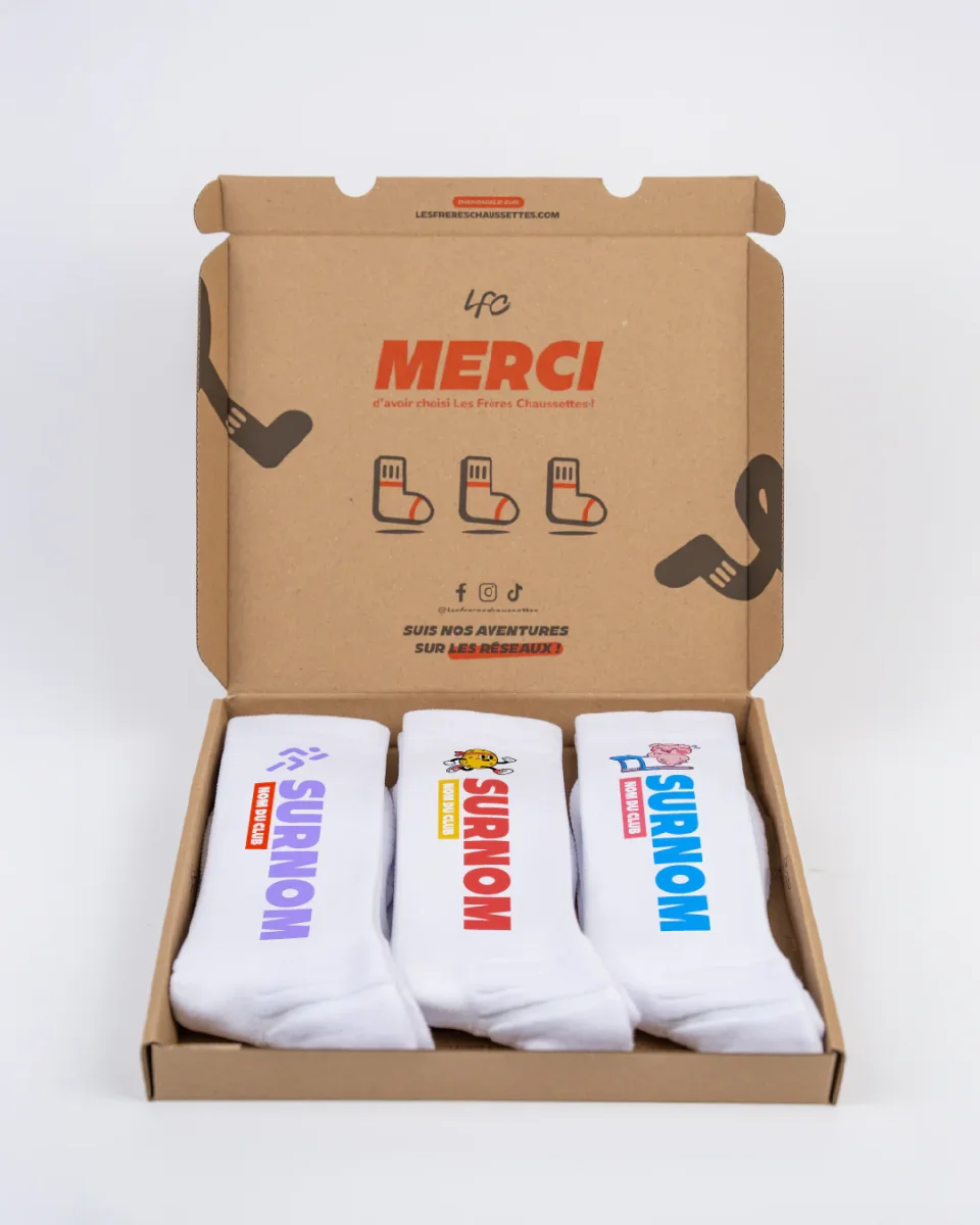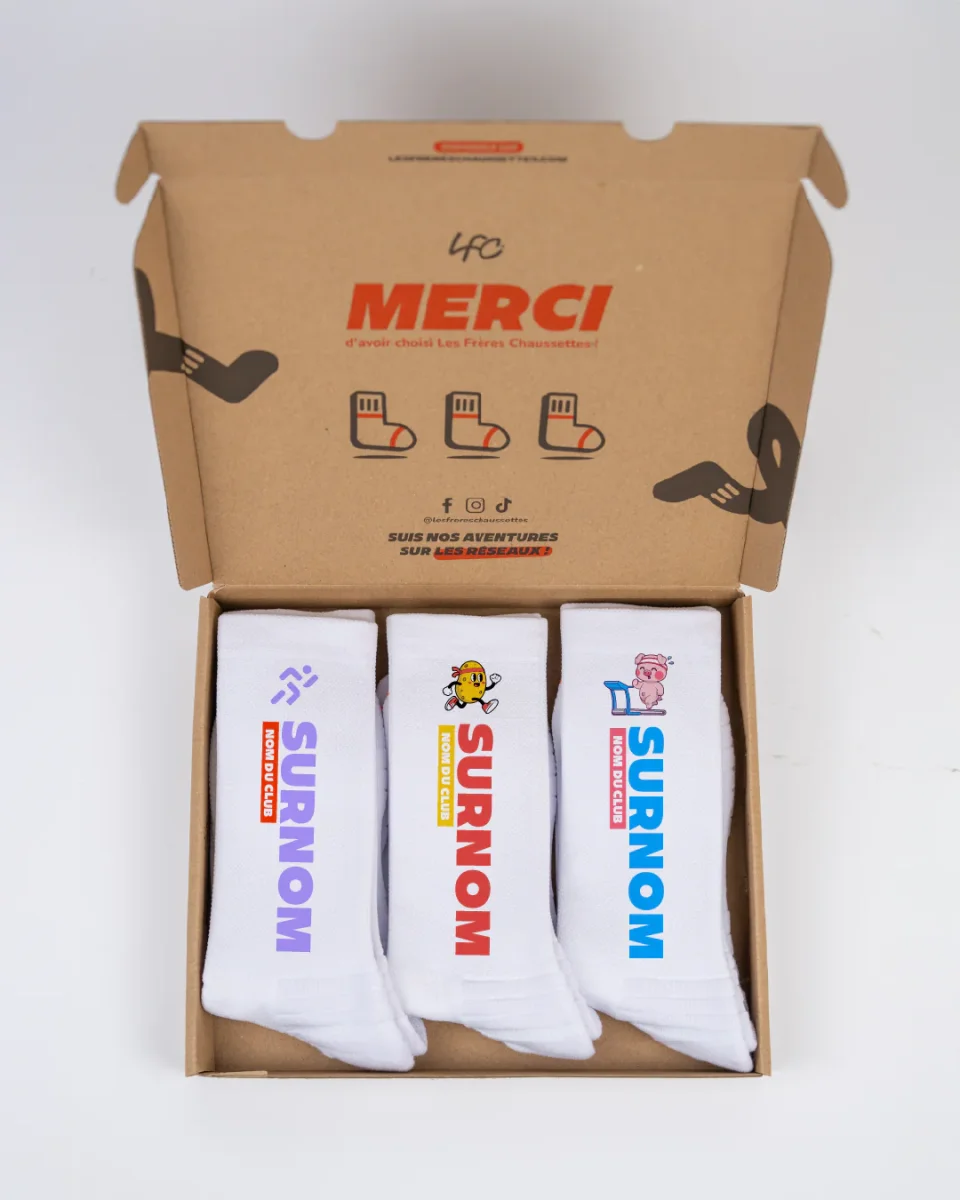 – Personnalisation du surnom, du logo et du club sur chacune des 3 paires !