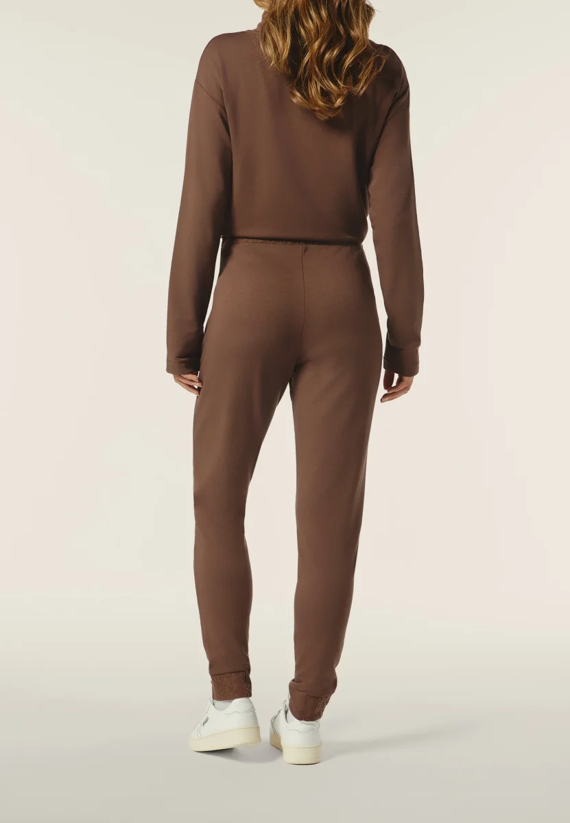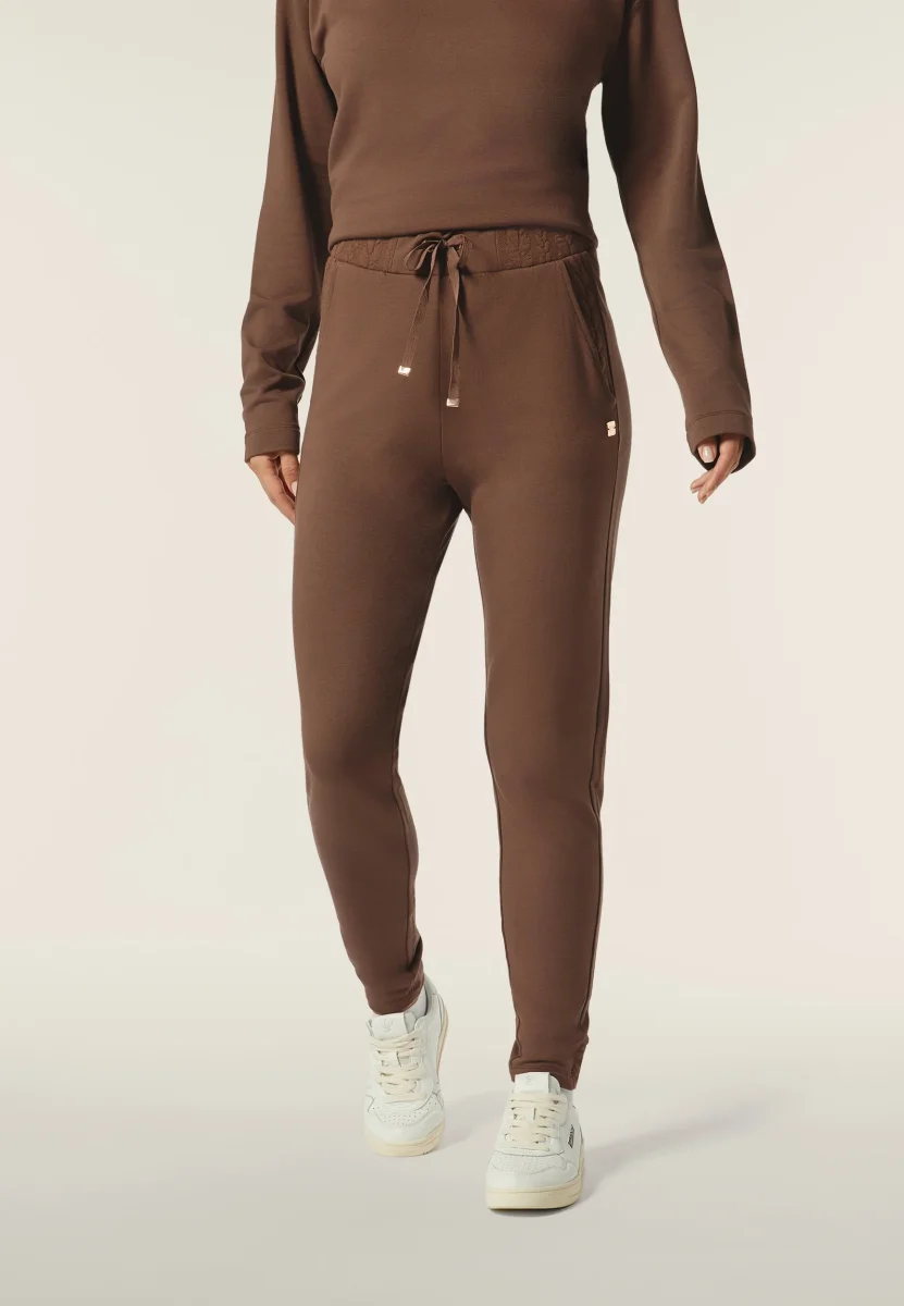 Questo pantalone regular fit da donna è realizzato in felpa garzata di viscosa, un tessuto caldo e confortevole. La vita regular con coulisse e gli inserti in felpa bonded a trecce su vita, tasche e fondo posteriore aggiungono un tocco di stile unico richiamando l’aspetto della maglia in lana lavorata. Le tasche interne alla francese e il logo applicato sul fianco sinistro completano il design ricercato e alla moda.