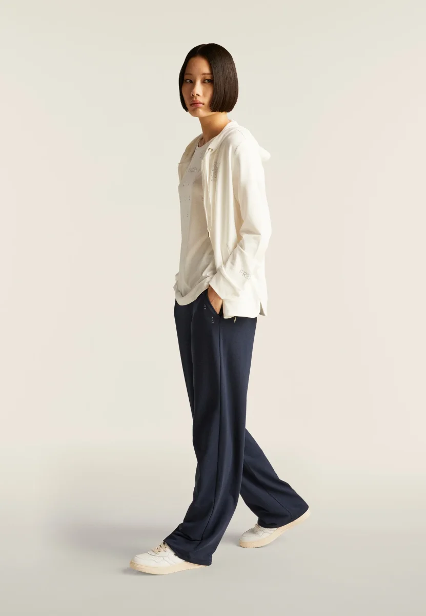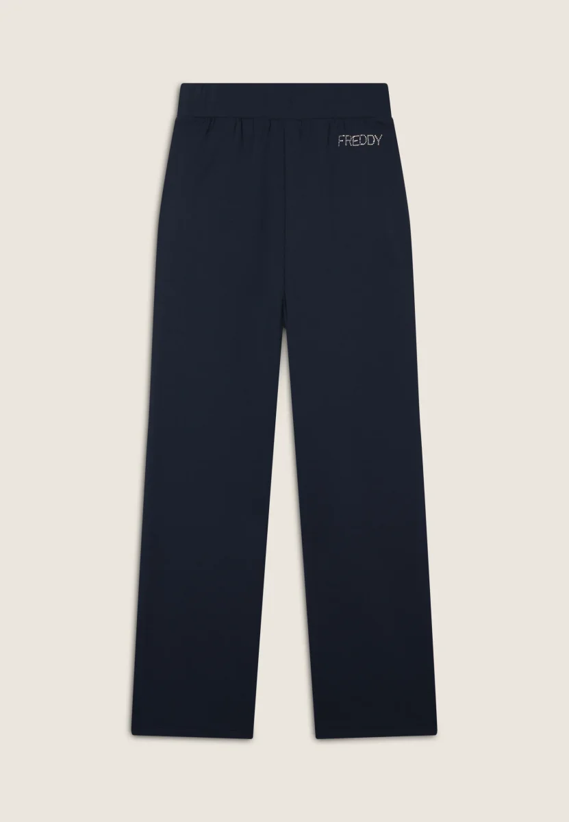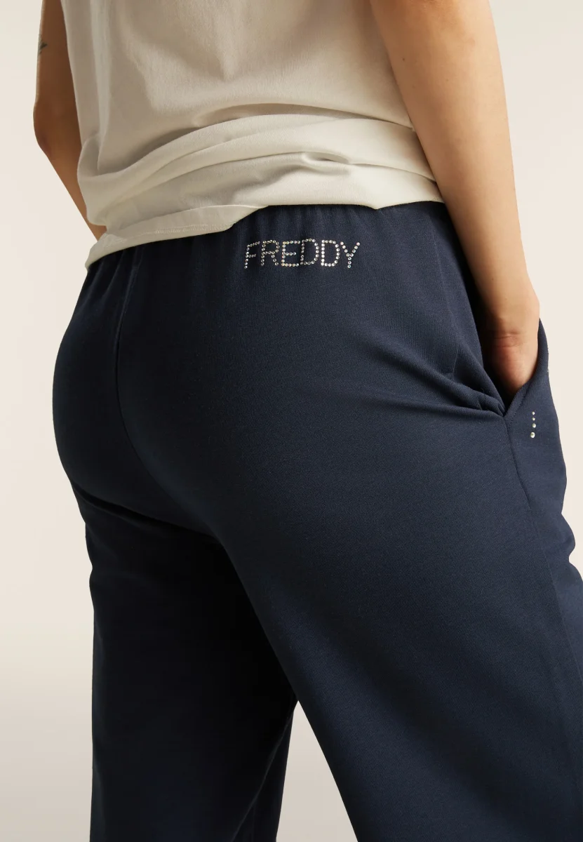 Comfort e stile definiscono questi pantaloni in French Terry Modal, un tessuto morbido, traspirante e leggero. Il taglio comfort fit è caratterizzato da una fascia liscia sul fronte e in costina sul retro, regolabile con una coulisse interna per una vestibilità personalizzata. La gamba dritta e le tasche anteriori interne completano il design, impreziosito dall’apertura decorata con gocce di strass e dal logo FREDDY in strass sul fianco posteriore destro.