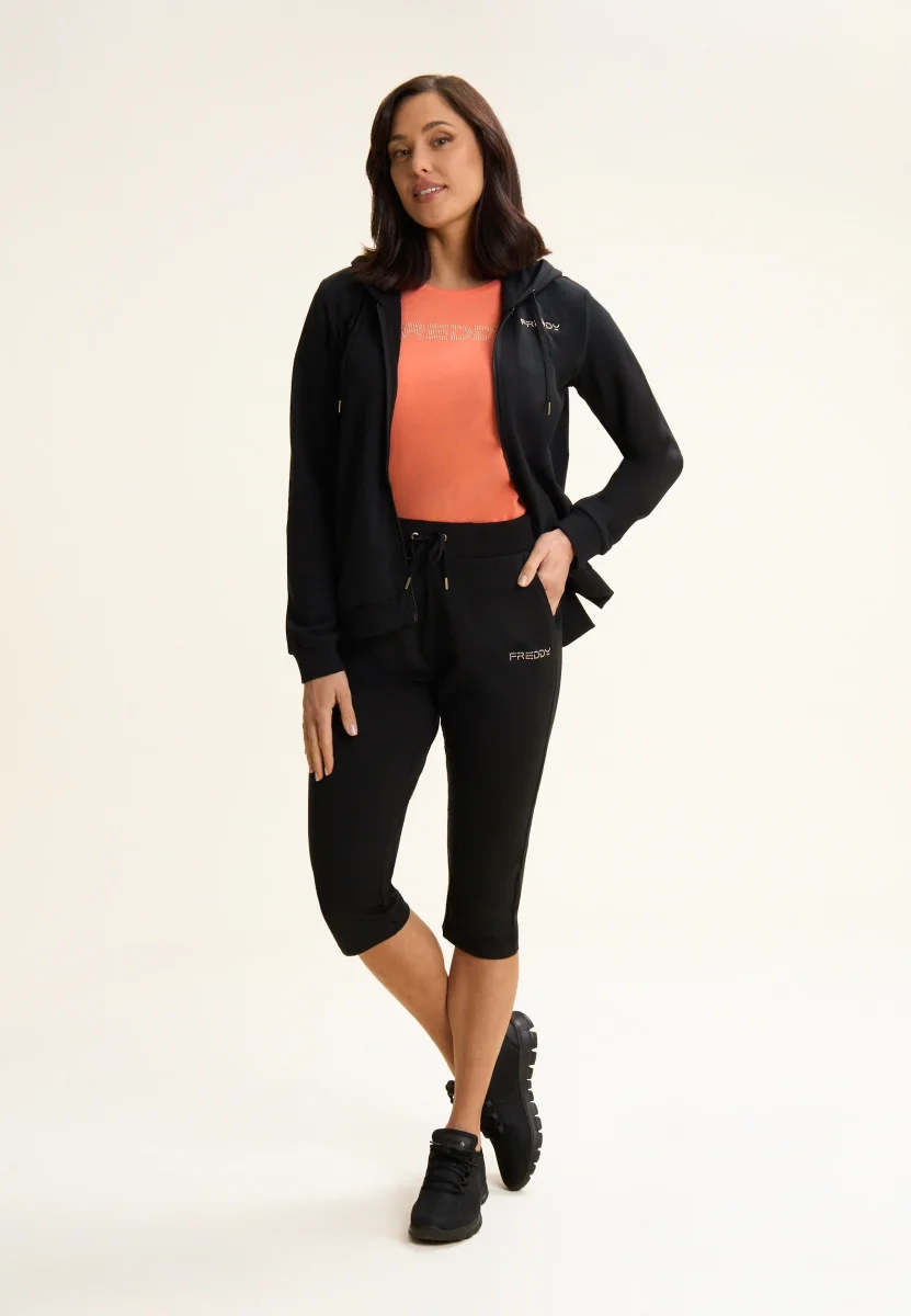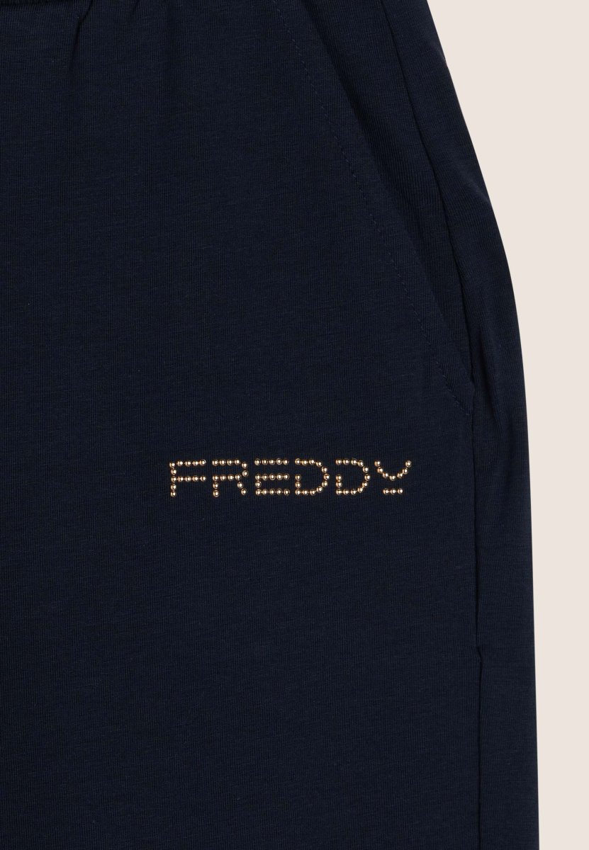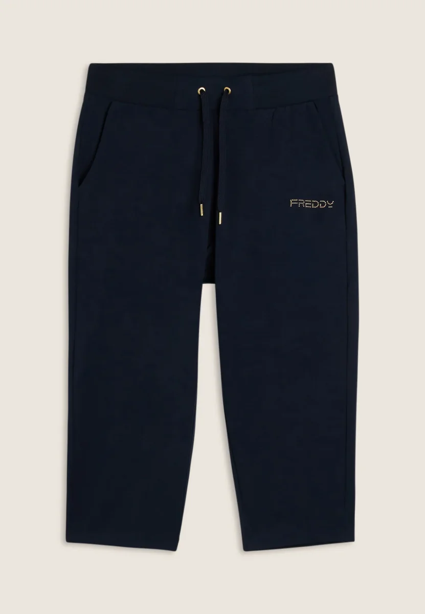 Pantaloni sportivi in Heavy Jersey Stretch con lunghezza corsaro, vita regular e coulisse tono su tono. Le tasche anteriori interne e il logo FREDDY decorato da perline dorate li rendono pratici e raffinati.