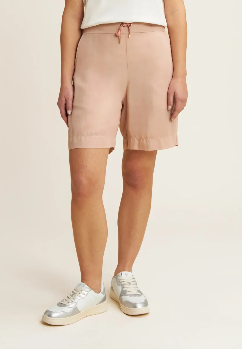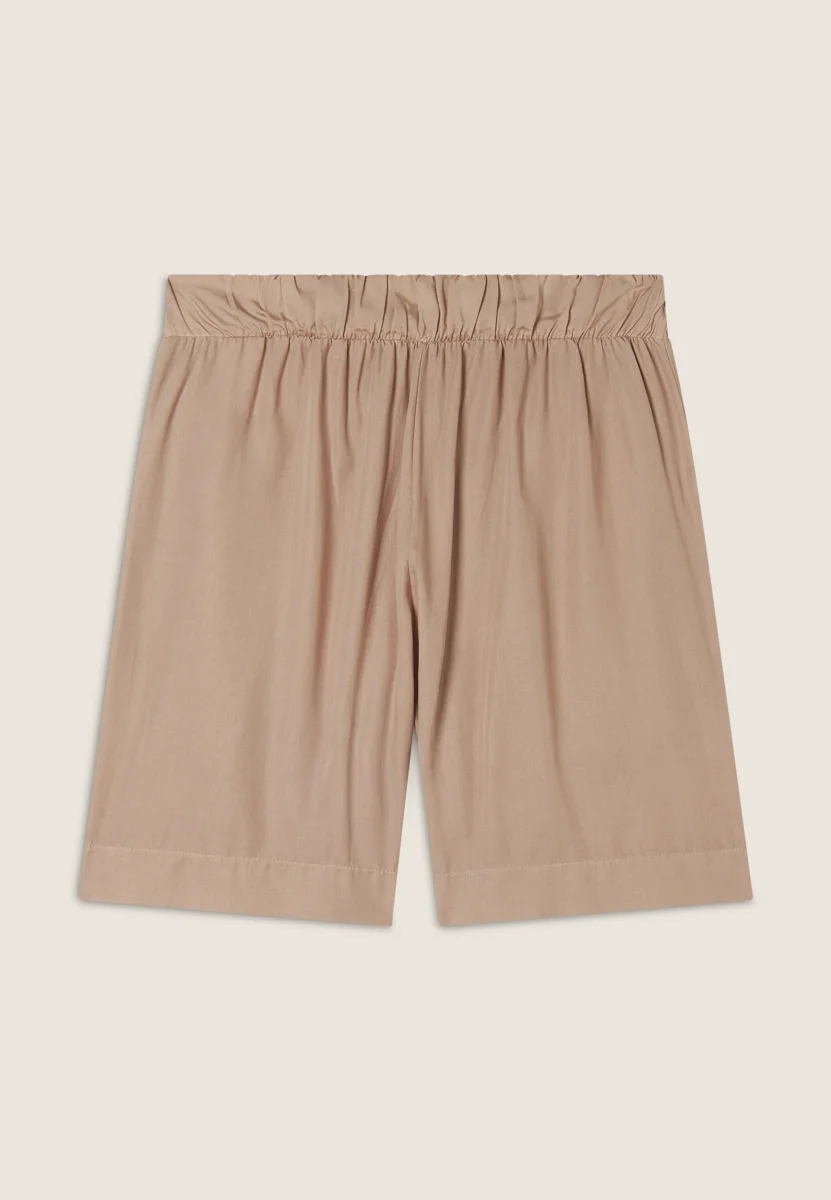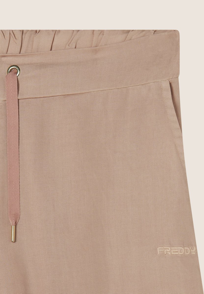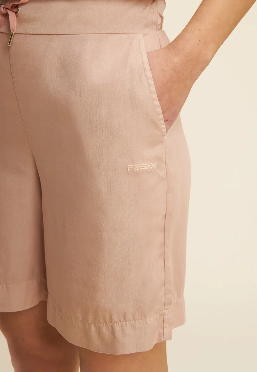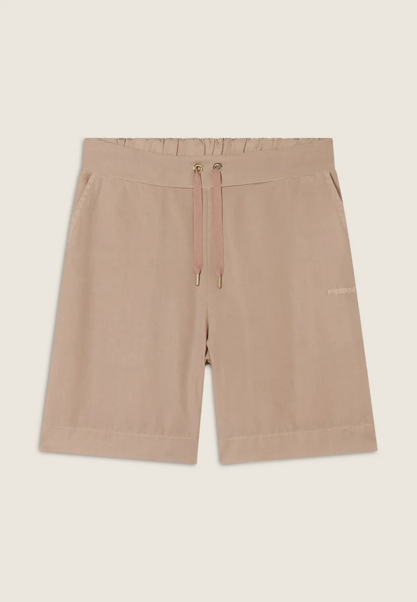 Pantaloni corti regular fit in twill di Lyocell, un tessuto sostenibile e resistente. La vita regular con elastico interno e coulisse e la gamba ampia rendono questi bermuda freschi e comodi. Presentano tasche anteriori e il logo FREDDY ricamato in tono colore per un dettaglio discreto.