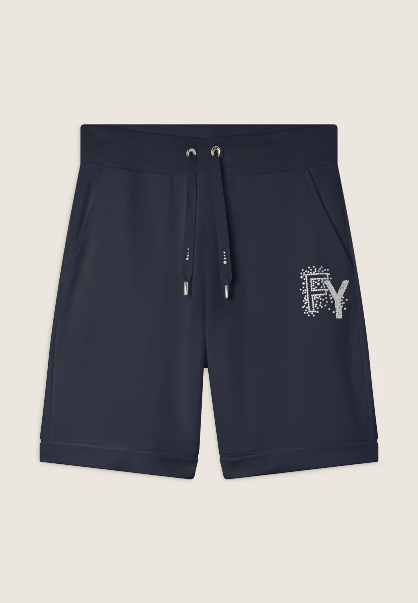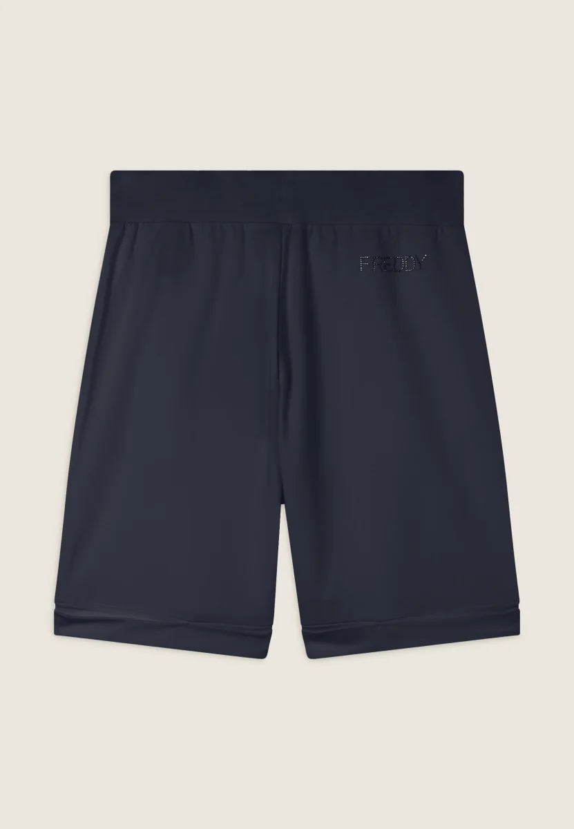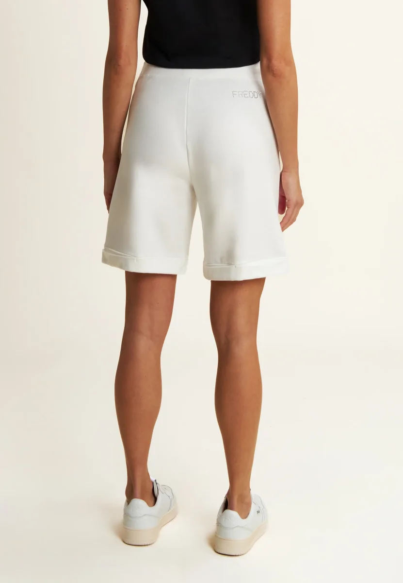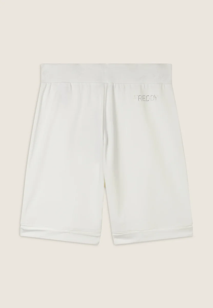 Perfetti per un look sportivo e fresco, questi pantaloncini in French Terry Modal offrono leggerezza e morbidezza al tatto. La vita regular in costina con coulisse e la lunghezza bermuda con risvolto sul fondo garantiscono un fit confortevole e versatile. I dettagli in strass includono il logo FY sul fianco anteriore sinistro e il logo FREDDY sul fianco posteriore destro, mentre le tasche anteriori interne completano il design.