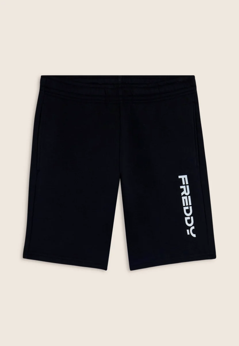 Comfort e stile si incontrano in questi pantaloni corti unisex realizzati in jersey misto cotone, un tessuto morbido al tatto e resistente all’uso. La vita regular con elastico interno assicura una vestibilità comoda e stabile: comfort fit per lei, regular fit per lui. Il look è definito dal grande logo FREDDY stampato in verticale sulla gamba sinistra in bianco a contrasto sul fondo nero, per un effetto grafico deciso ma versatile. Perfetti per lo sport e il tempo libero, sempre nel segno del movimento.