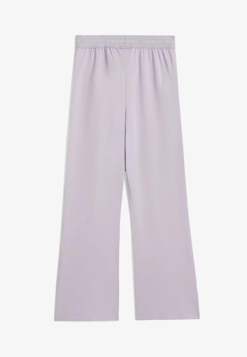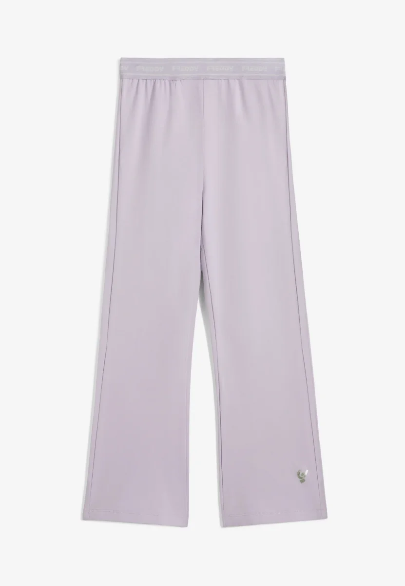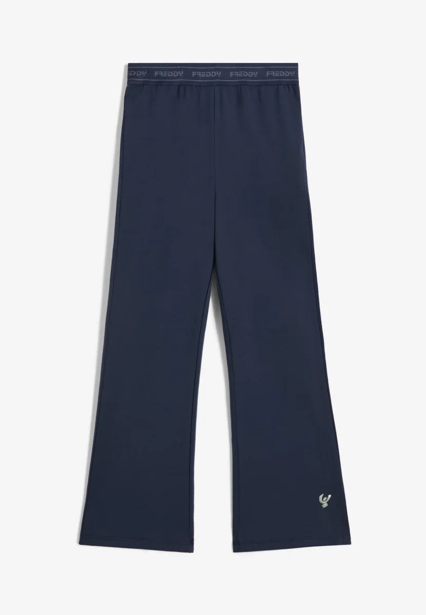 Pantaloni vestibilità regular da bambina e ragazza in felpa elasticizzata con un fit caratterizzato dal fondo svasato. Il modello ha vita con elastico in jacquard con logo FREDDY ripetuto, che assieme al piccolo logo stampato sul fondo sinistro, arricchisce i dettagli di stile di questi pantaloni che uniscono stile e comodità, perfetti per le attività sportive e per muoversi in libertà a scuola e nel tempo libero.