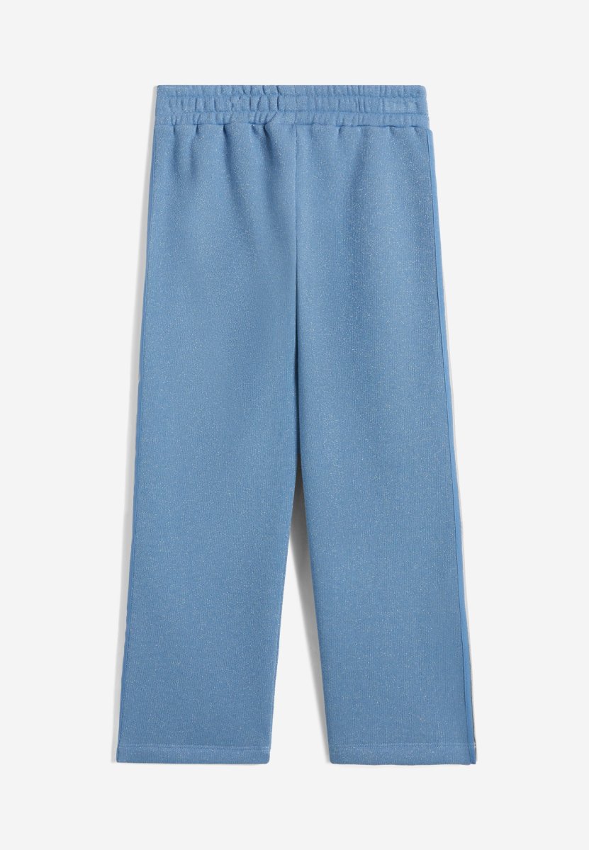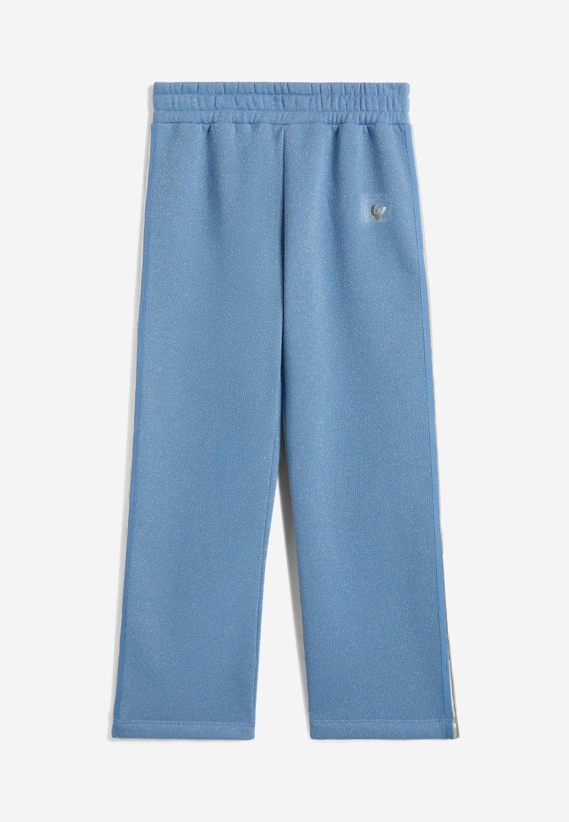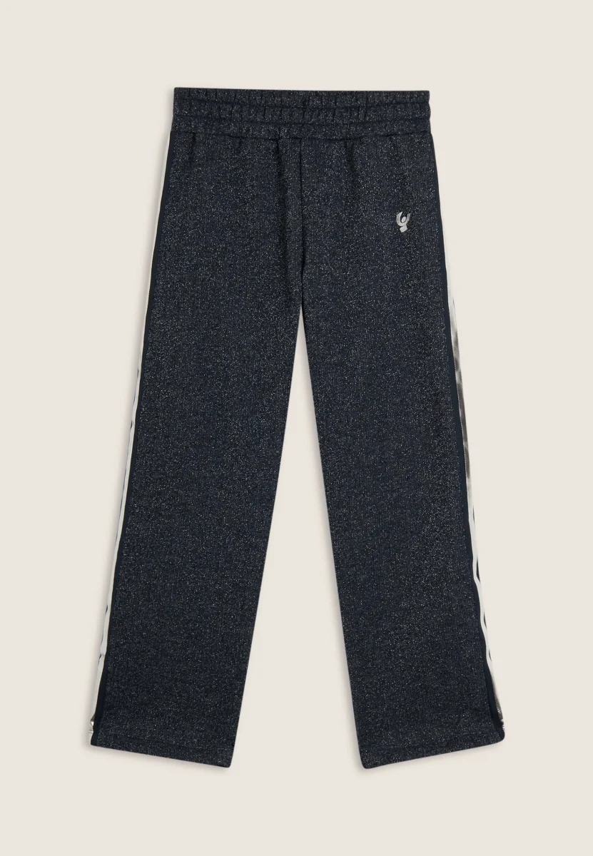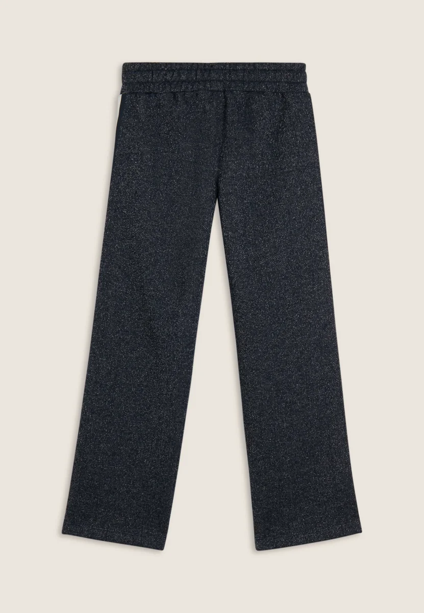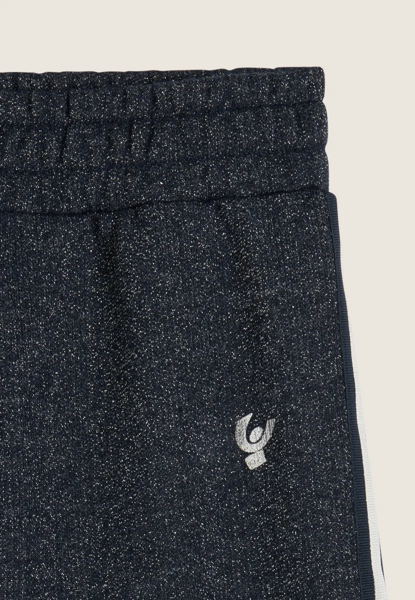 Pantaloni regular fit da bambina e ragazza in cotone lurex per un effetto glitter sottolineato anche dal logo sul fianco e dalle bande sulle lunghezze, entrambi in colore argento. Il modello ha vita con elastico interno e gamba dritta con fondo aperto.