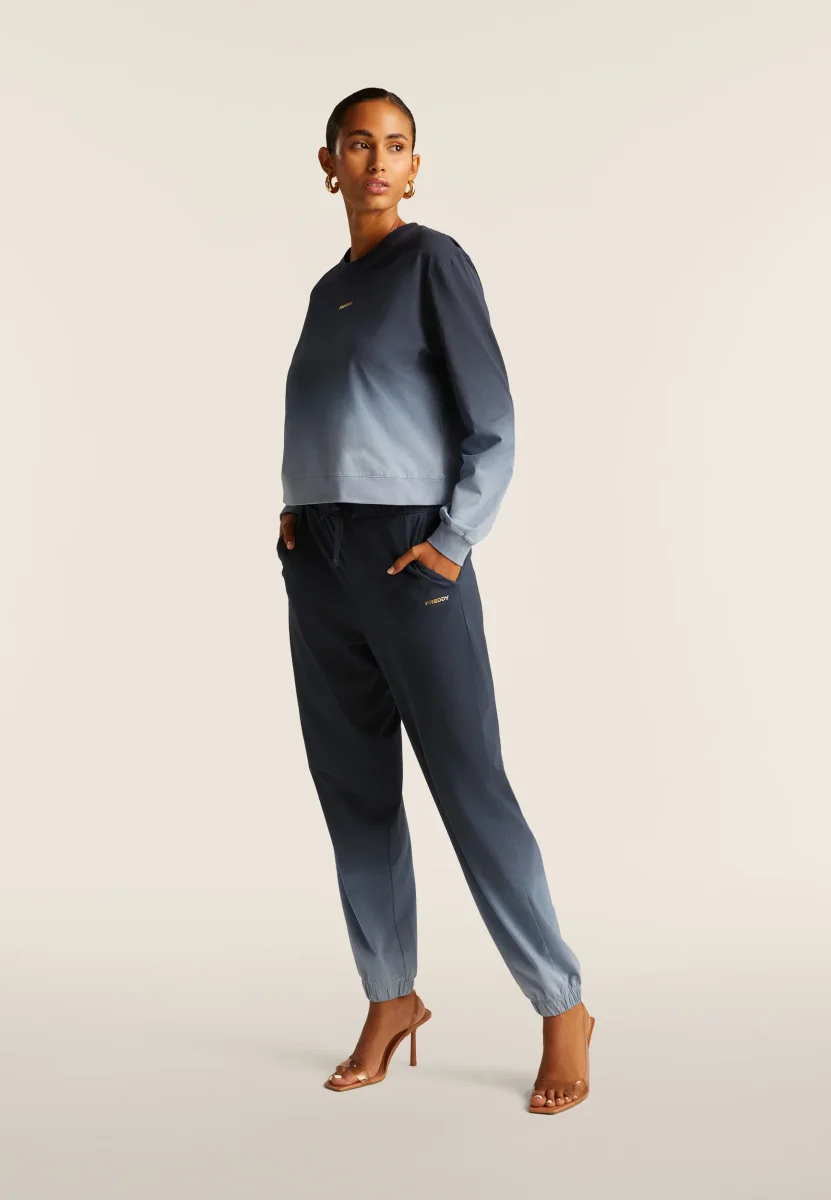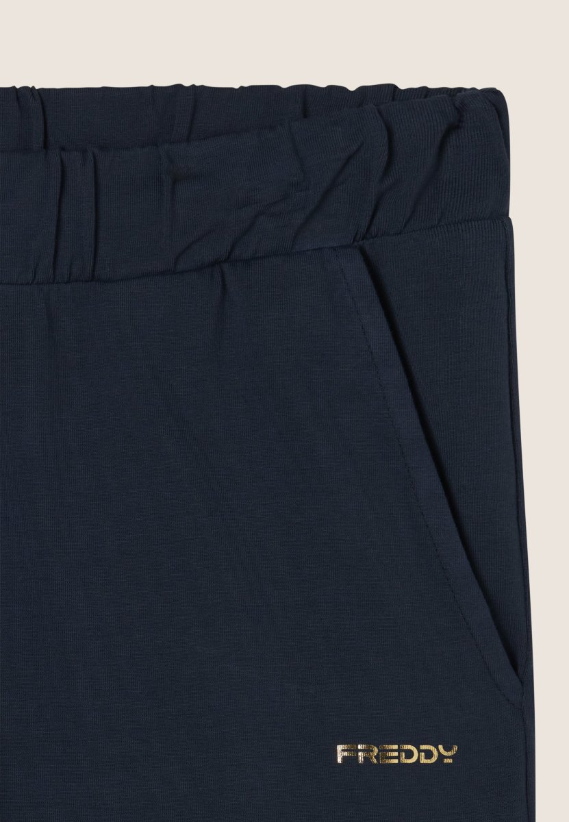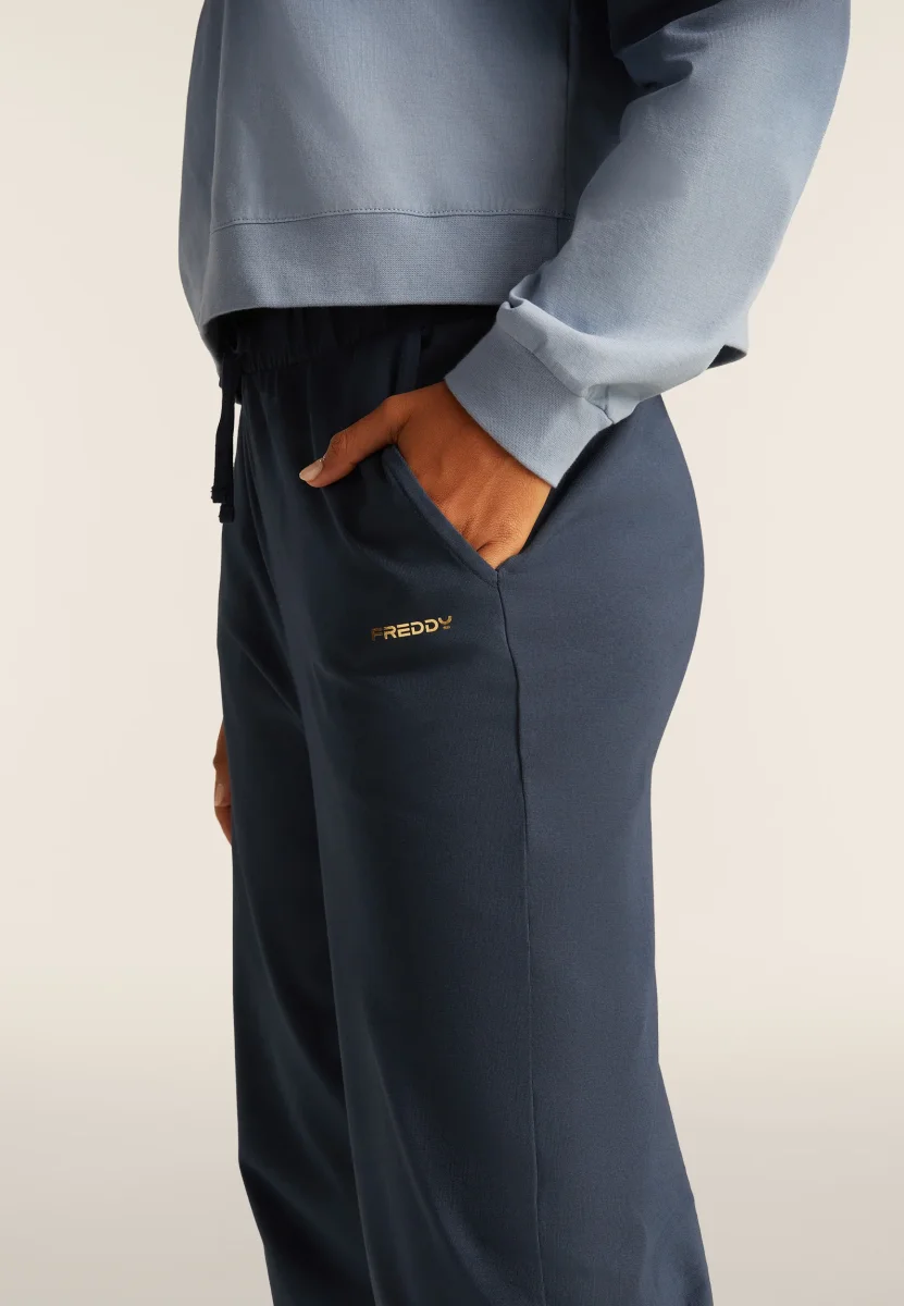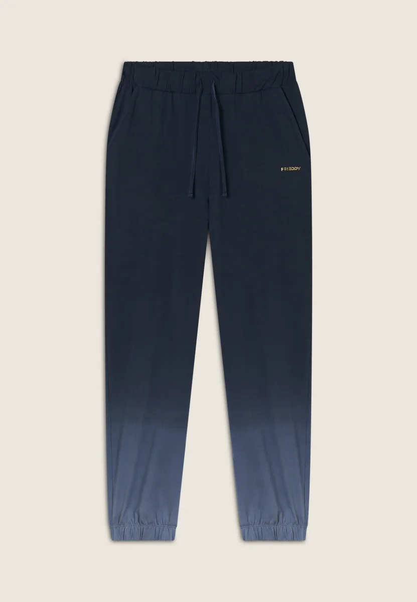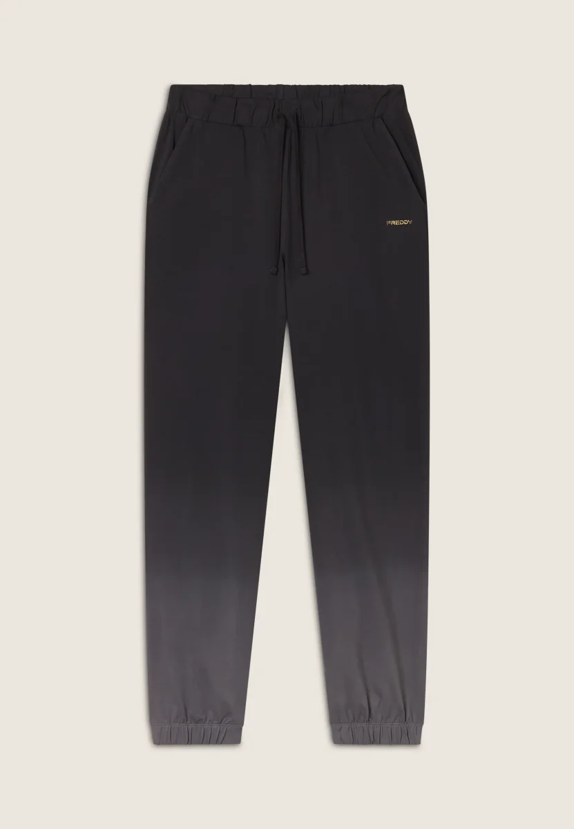 Pantaloni lunghi regular fit in heavy jersey stretch, ideali per un look comodo e moderno. La vita regular con elastico interno e la lunghezza regular con fondo elasticizzato offrono una vestibilità perfetta. La tintura dégradé con fondo più chiaro e il logo FREDDY stampato sul fianco sinistro aggiungono un tocco di stile unico.