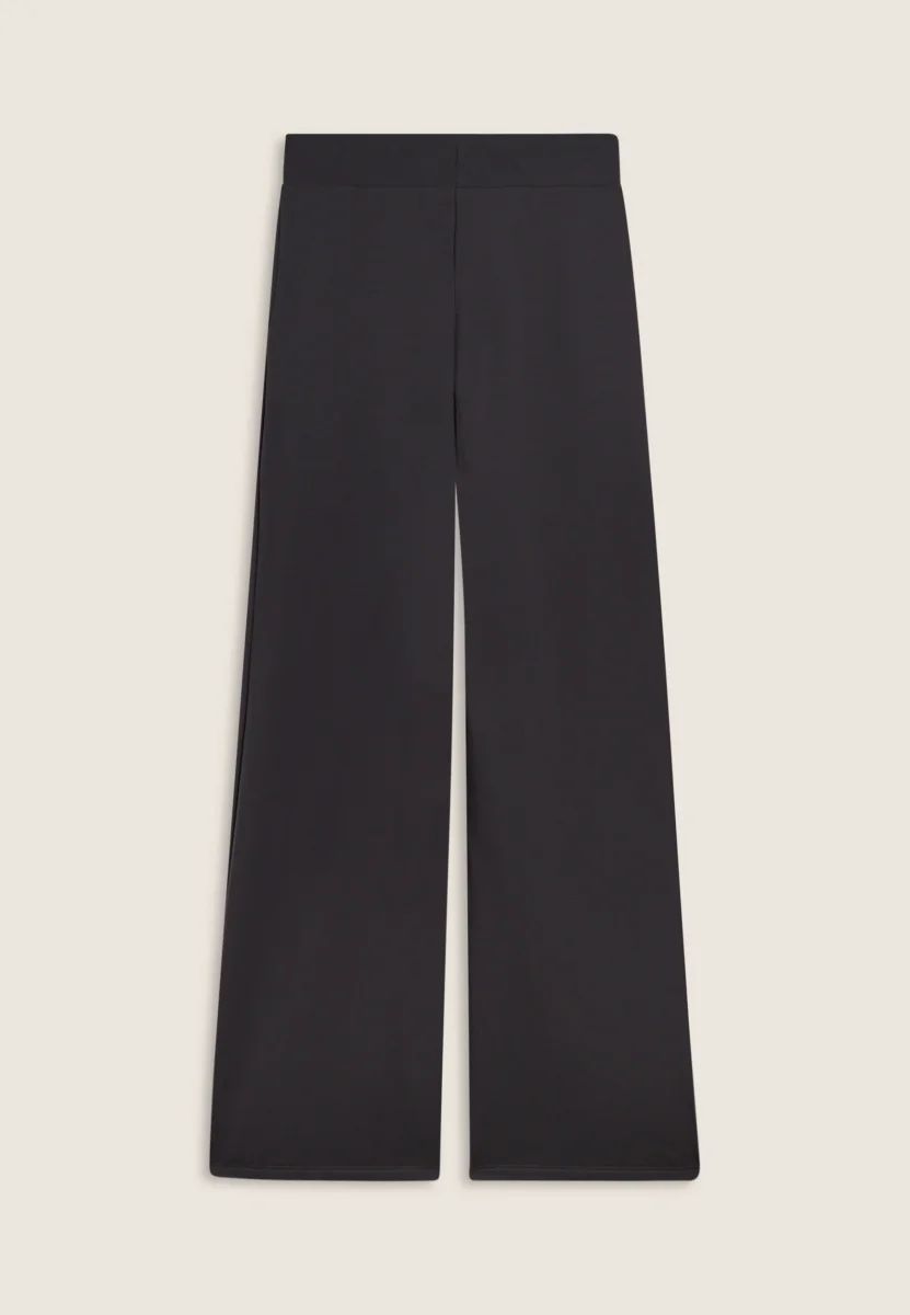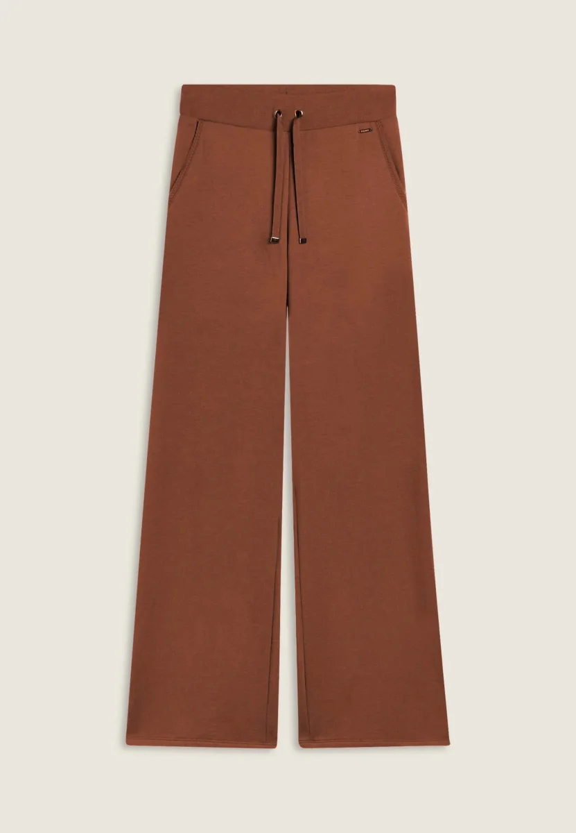 Pantaloni wide leg da donna dal taglio comodo e regolare, in felpa modal garzata elasticizzata, ideale per un calore morbido e avvolgente. Le tasche alla francese sono impreziosite da un raffinato bordo in felpa tecnica a doppio strato con elegante texture a micro-trecce. Vita in costina dotata di coulisse per un comfort su misura e placchetta logo FREDDY applicata sul fianco sinistro.
