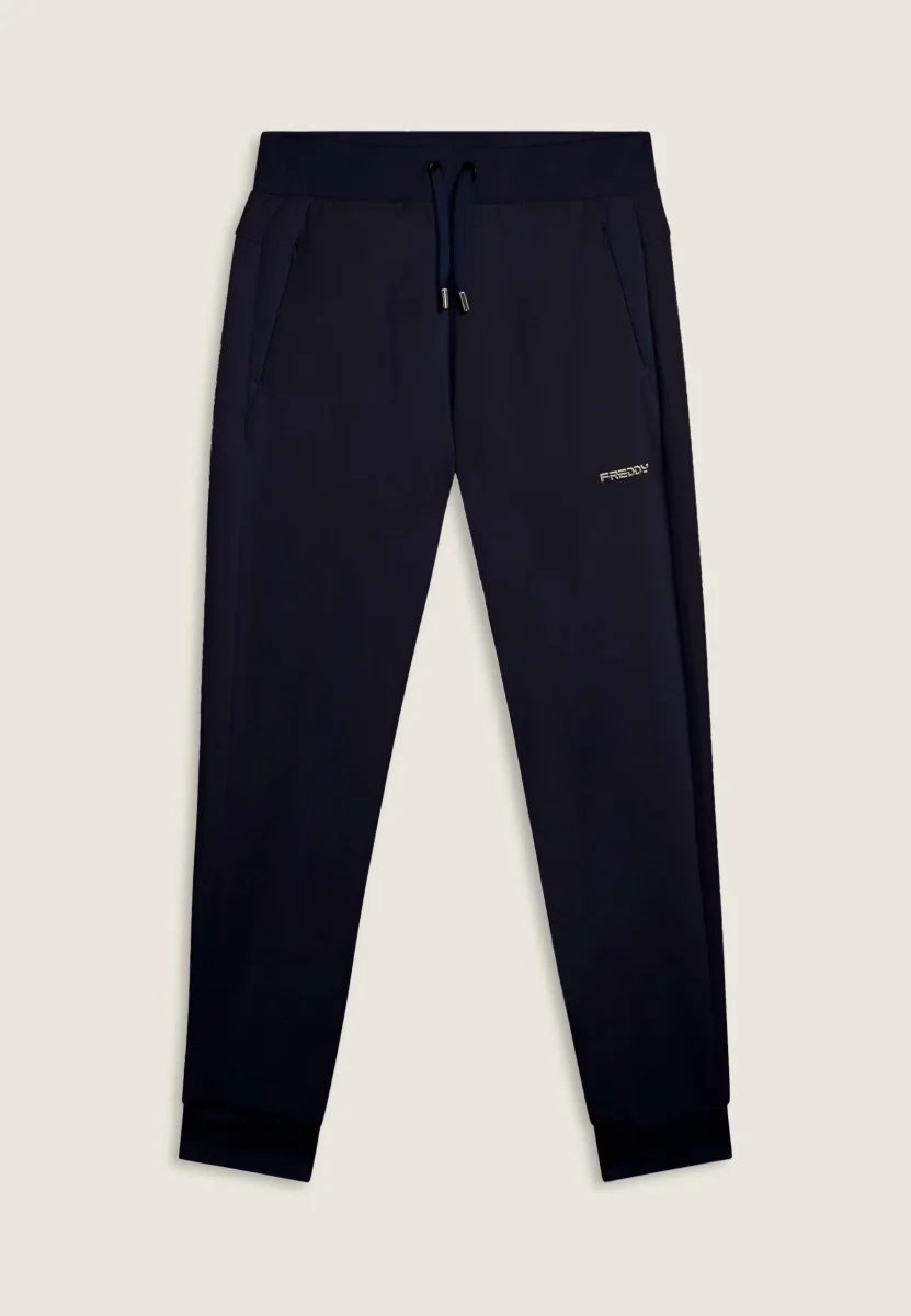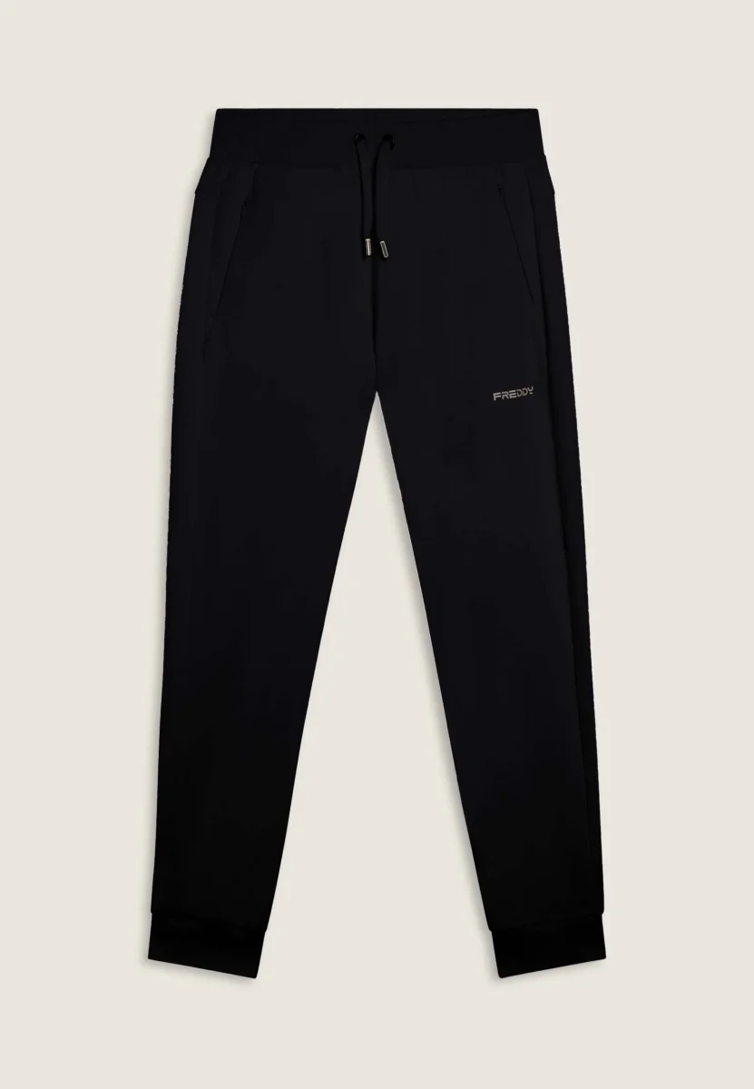 Pantaloni joggers da uomo dal taglio regular con fondo a polsino in costina e vita elasticizzata con coulisse. Il tessuto in felpa garzata 100% cotone assicura morbidezza e comfort prolungato. Presentano tasche anteriori alla francese e piccolo logo FREDDY sul fianco. Un capo versatile perfetto per ogni momento della giornata.