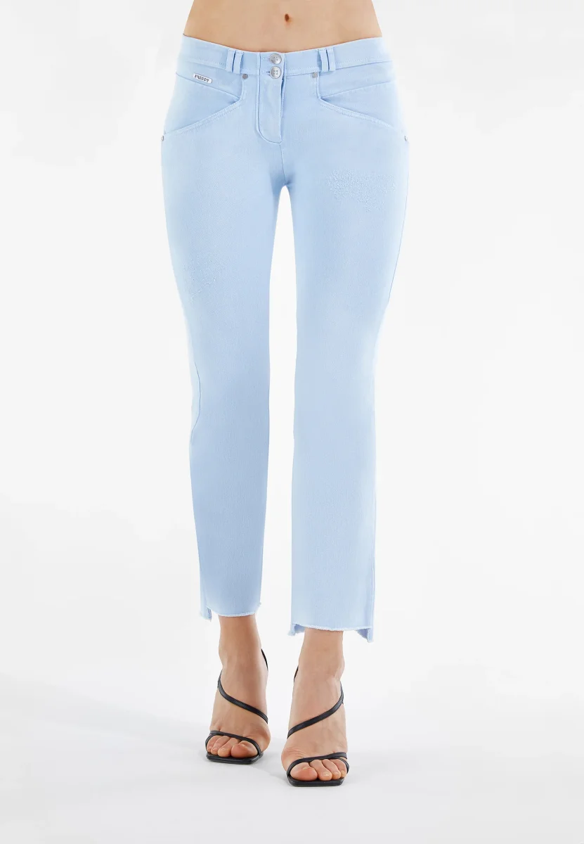 Pantaloni push up della linea WR.UP® con vestibilità flare in gabardine elasticizzato ecologico slavato tinto in capo con effetto distressed sottolineato dagli strappi sulle gambe e dal fondo con taglio vivo. Il modello presenta vita regular con passanti, tasche frontali vere con taglio ad angolo e lunghezza 7/8 alla caviglia con fondo posteriore più lungo. Il design fasciante su fianchi e cosce e più largo sul fondo si arricchisce dell’effetto used e dei dettagli di stile nel regalare un tono originale all’insieme. Capo ideato per mettere in luce la tua femminilità grazie alla tecnologia WR.UP® brevettata da Freddy che valorizza la silhouette e dona un effetto modellante e sollevante per mezzo di un particolare sistema di cuciture e inserti sapientemente posizionati.