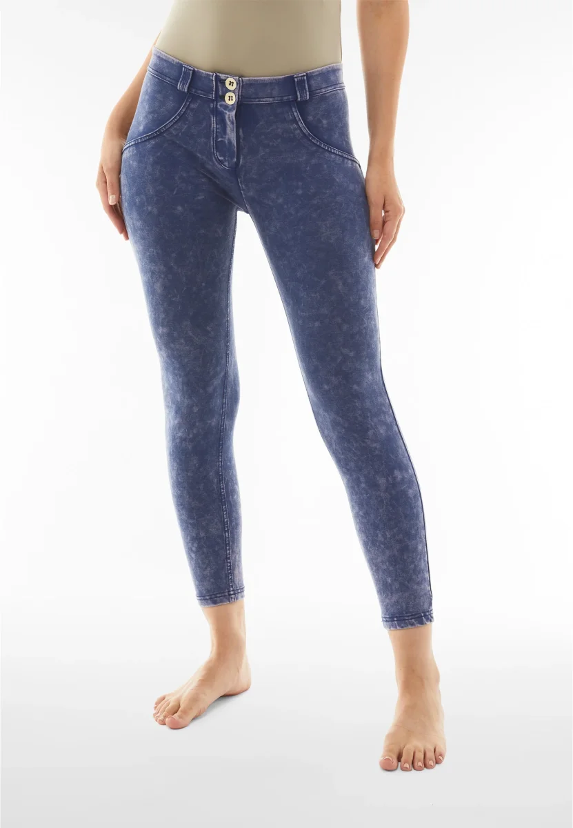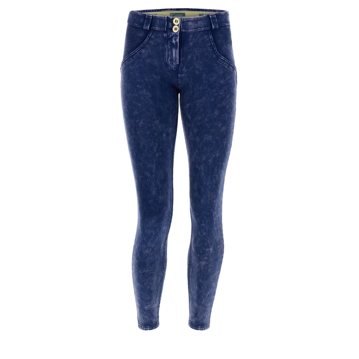 Pantaloni push up della linea WR.UP® in heavy jersey stretch sostenibile realizzato con cotone organico tinto in capo con effetto bleached. Il modello ha vita regular con passanti e chiusura con due bottoni, lunghezza 7/8 alla caviglia e vestibilità superskinny per una massima aderenza alle linee del corpo.