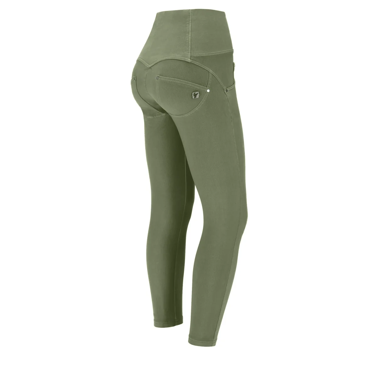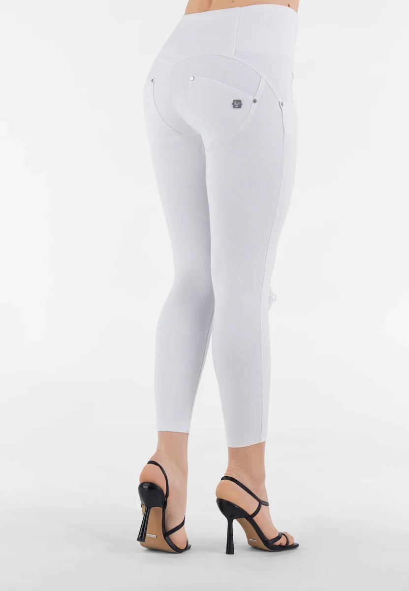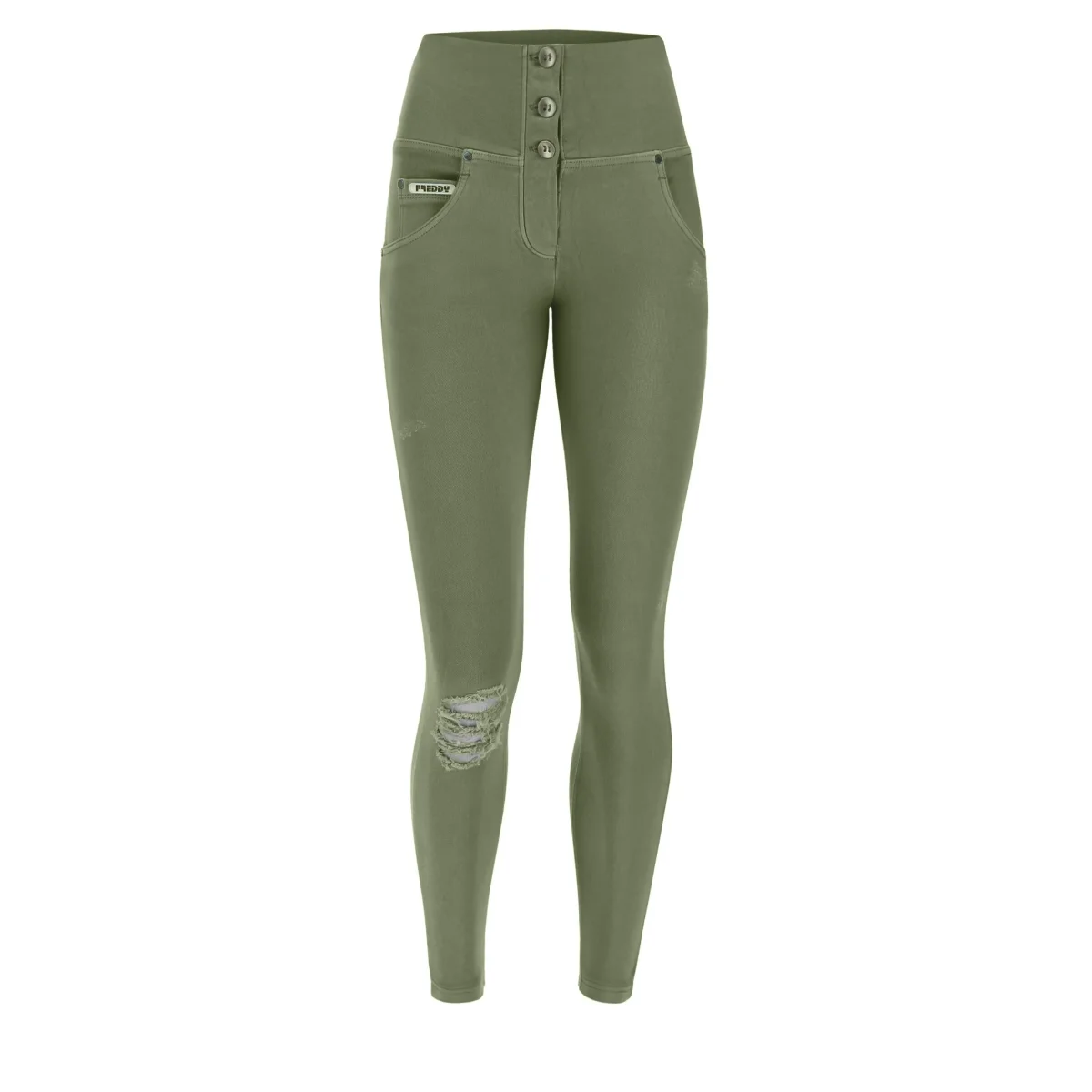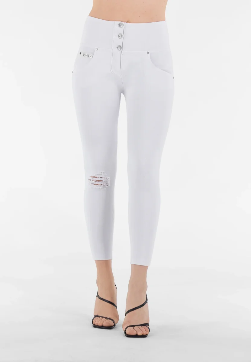Pantaloni push up WR.UP® 7/8 vita alta con bottoni in tessuto navetta con strappi