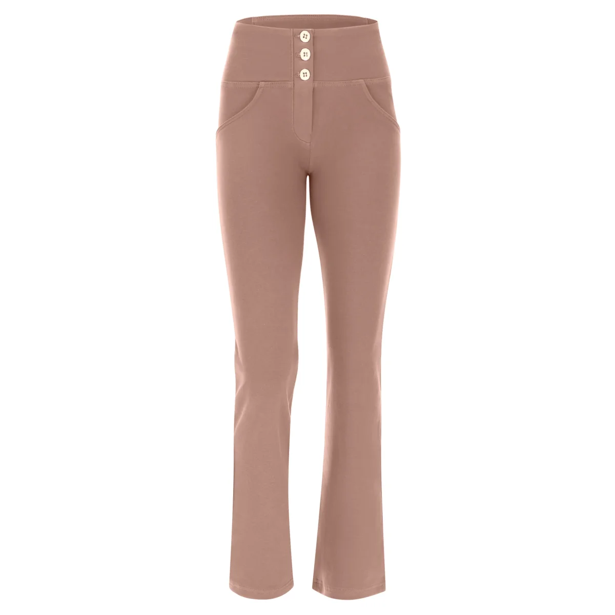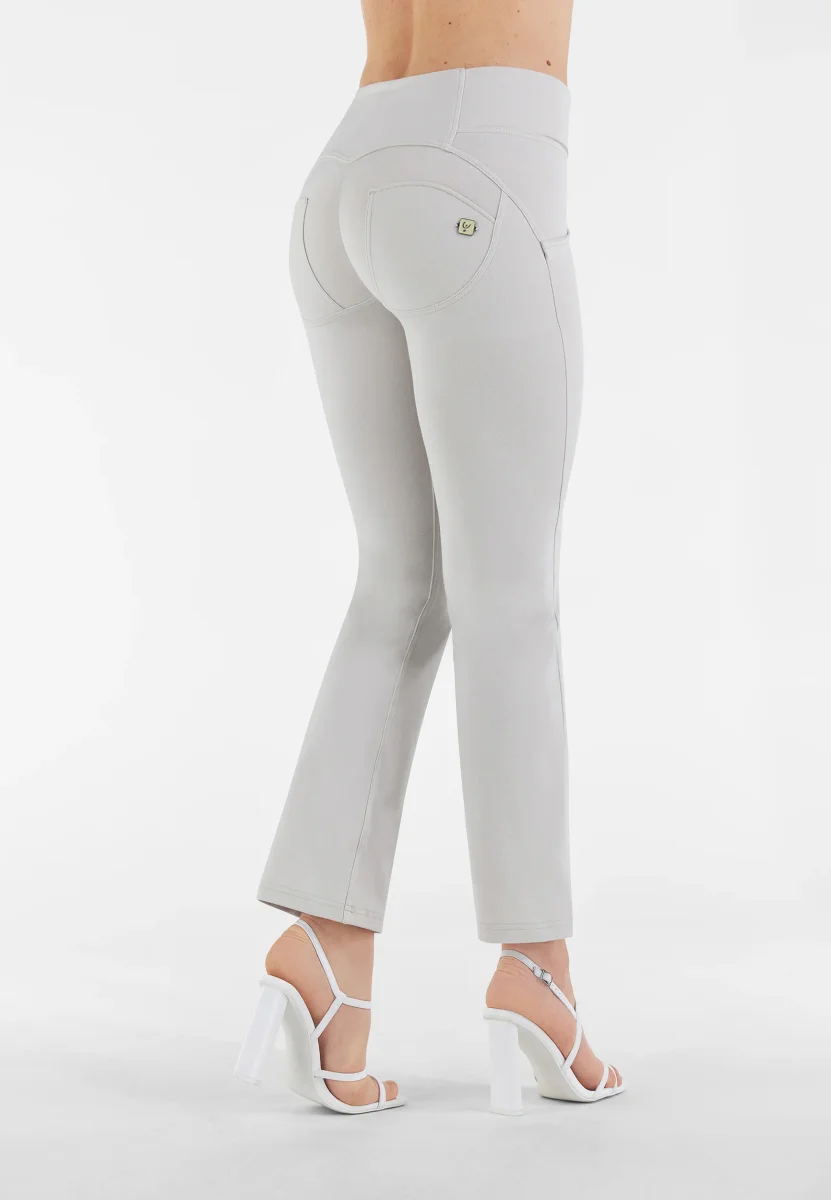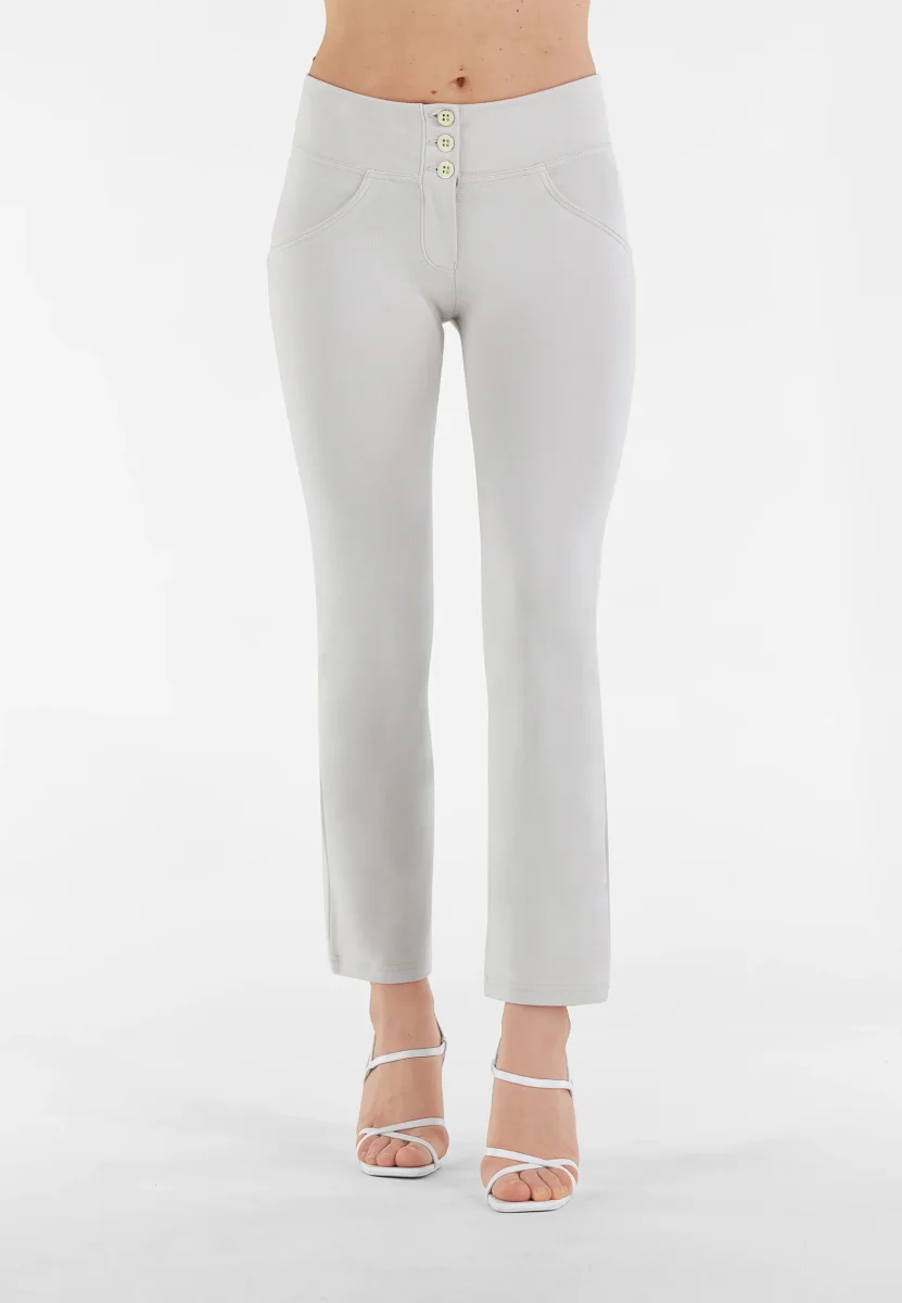 Pantaloni push up WR.UP® in cotone organico elasticizzato, caratterizzati dalla vita media con bottoni e fondo ampio corto, votati alla celebrazione della tua bellezza. Il design a wide bottom cropped che segue le linee dei fianchi e si apre sul fondo mette in luce la tua femminilità, ulteriormente valorizzata dallo speciale effetto modellante e sollevante dell’innovativa tecnologia WR.UP® brevettata da Freddy che aiuta ad esaltare la silhouette per mezzo di un particolare sistema di inserti e cuciture.