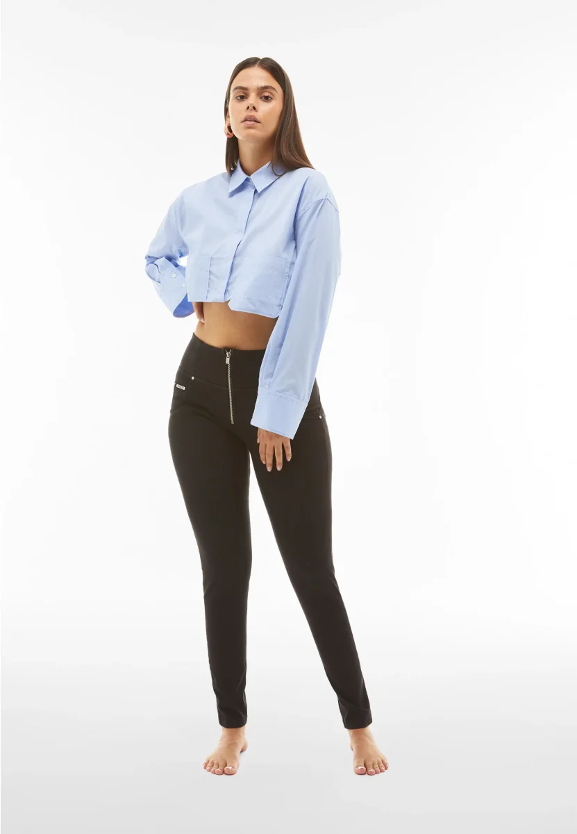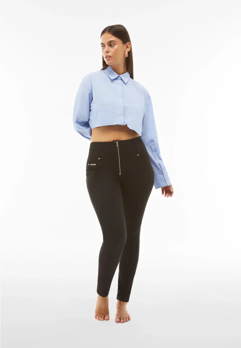 Pantaloni push up skinny della linea WR.UP® a vita alta con zip che avvolge e definisce il girovita ideati per esaltare le tue forme. Sono caratterizzati da una grande comodità data dal tessuto navetta prodotto con cotone organico, vari filati green e il TENCEL™ Lyocell, una fibra ecologica ricavata dalla pianta di eucalipto, più elastico del classico tessuto navetta grazie all’elastan che si espande in 4 direzioni. Il modello presenta tasche frontali e posteriori vere con rivetti, lunghezza regular e vestibilità skinny per una piacevole aderenza alle linee del corpo.