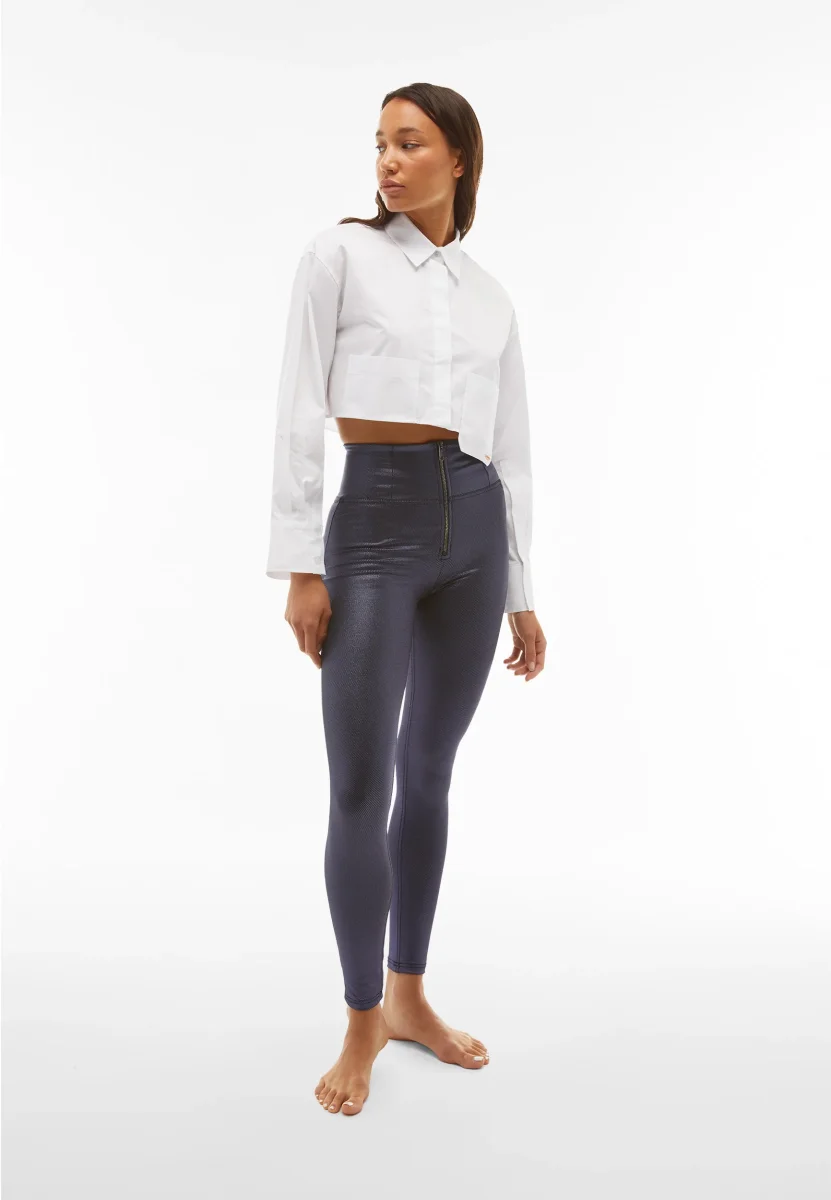 Pantaloni push up della linea WR.UP® in tessuto tecnico traspirante spalmato per ottenere un effetto metallizzato lucido.