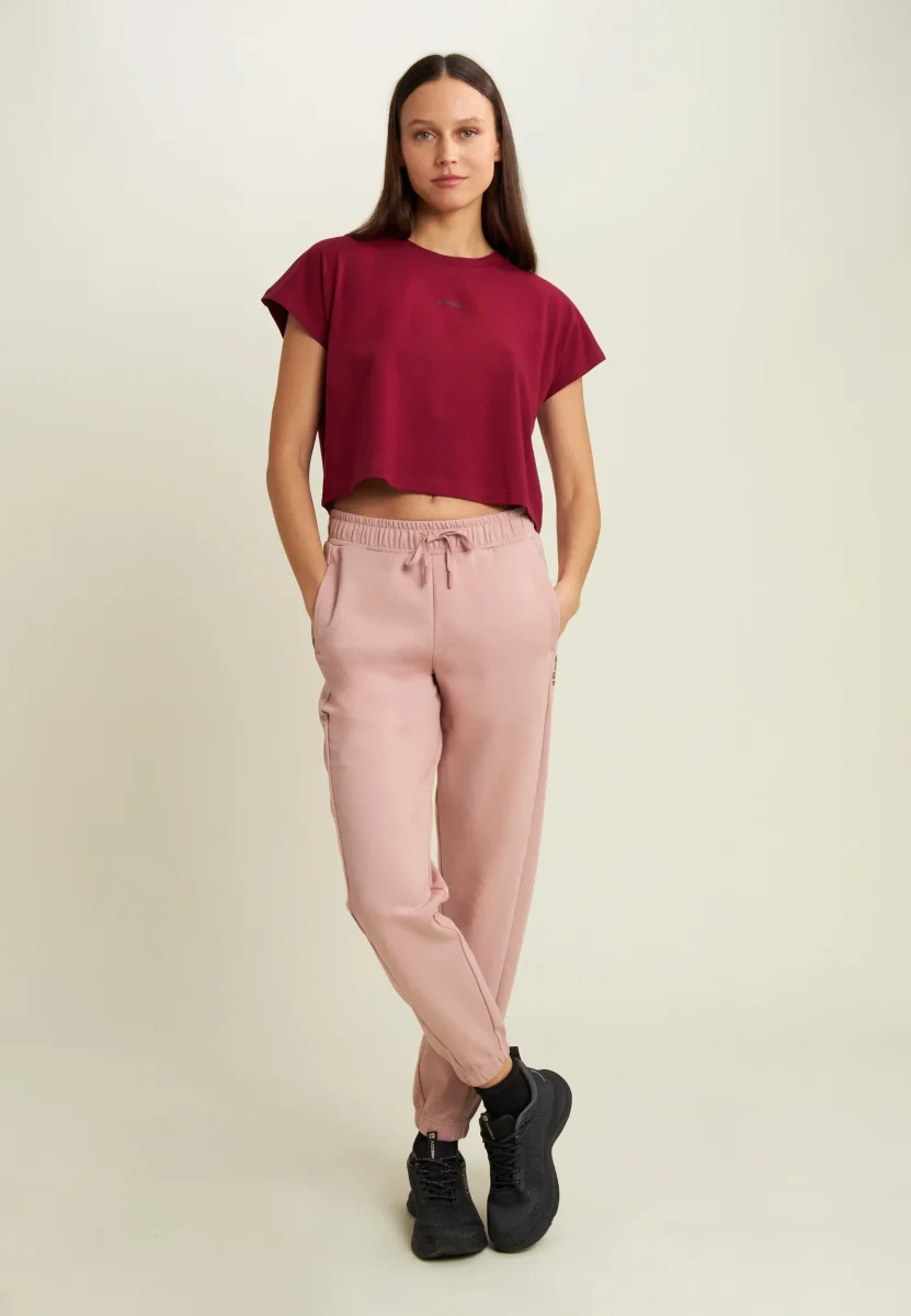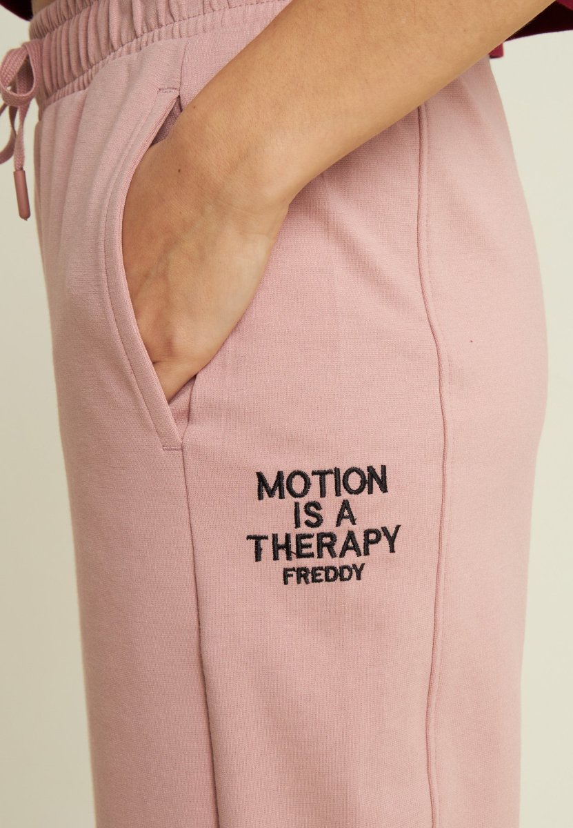 Pantaloni sportivi da donna in felpa garzata elasticizzata, dal taglio comfort. Presentano elastico interno con coulisse, fondo gamba con elastico e ricamo “Motion is a Therapy” con logo FREDDY. Tasche interne pratiche.